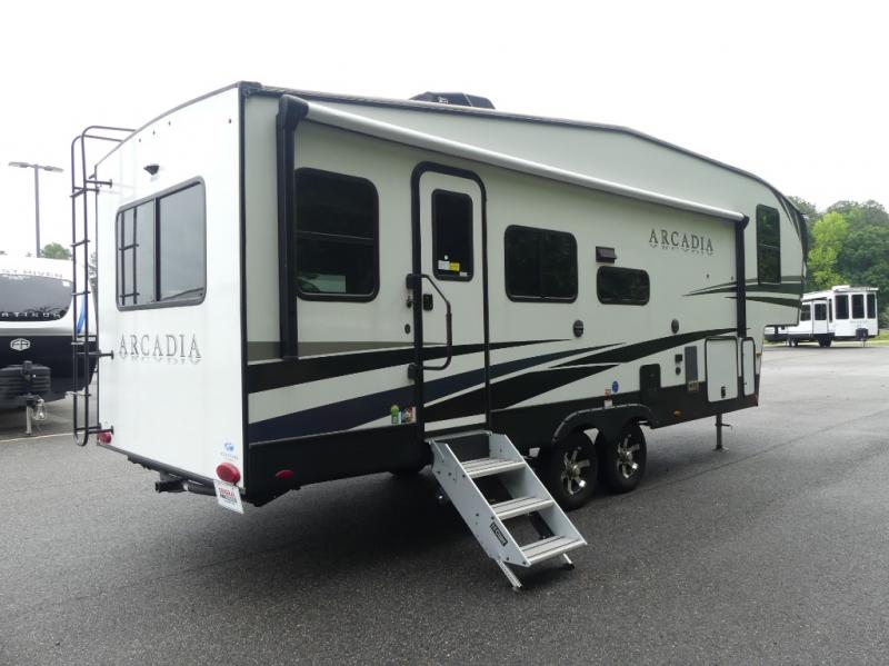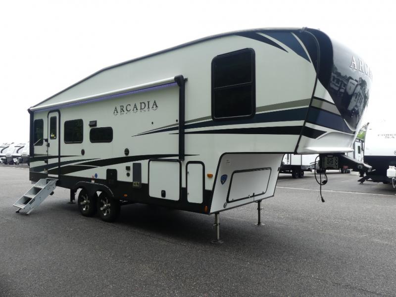 With any Arcadia Super Lite fifth wheel by Keystone, you will enjoy easy-to-tow lengths, unmatched storage, and oversized windows to let the outdoor views in. The structural I-beam frame will provide a strong foundation to your RV, and the Curt Performance Package means you can enjoy hassle-free towing. You will be able to camp year around thanks to the Peak Weather Package that includes a heated and enclosed underbelly, a 35K BTU furnace, and Keystone's exclusive HyperDeck floor that adds an additional layer of insulation to your floor. The interior will make you feel at home with residential hardware, seamless pressed countertops, residential Roman shades throughout, and ample storage space. Sometimes the best things come in smaller packages; choose a Arcadia Super Lite today!