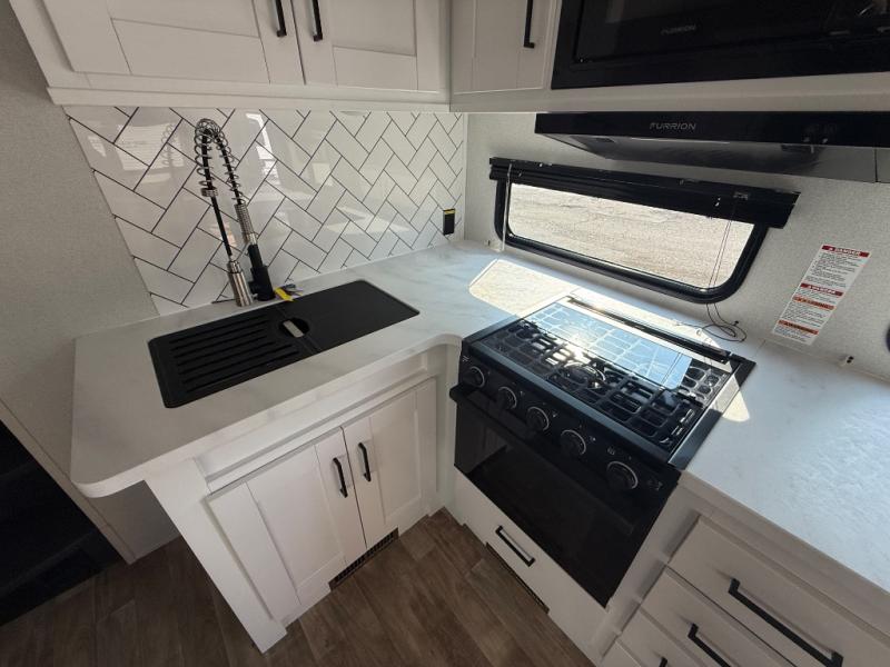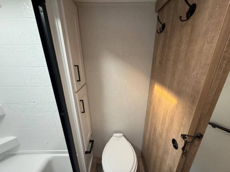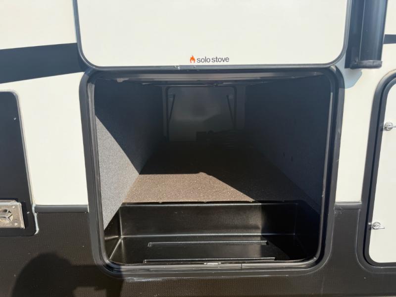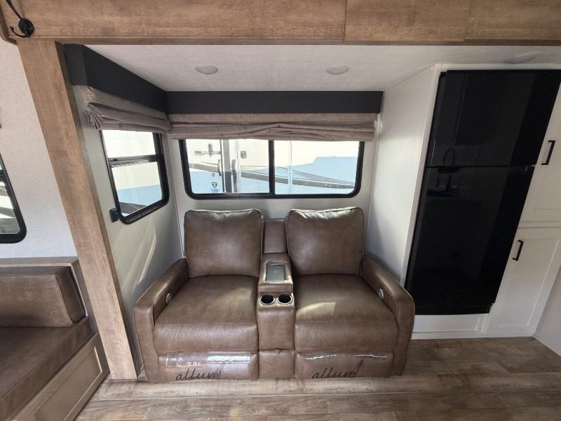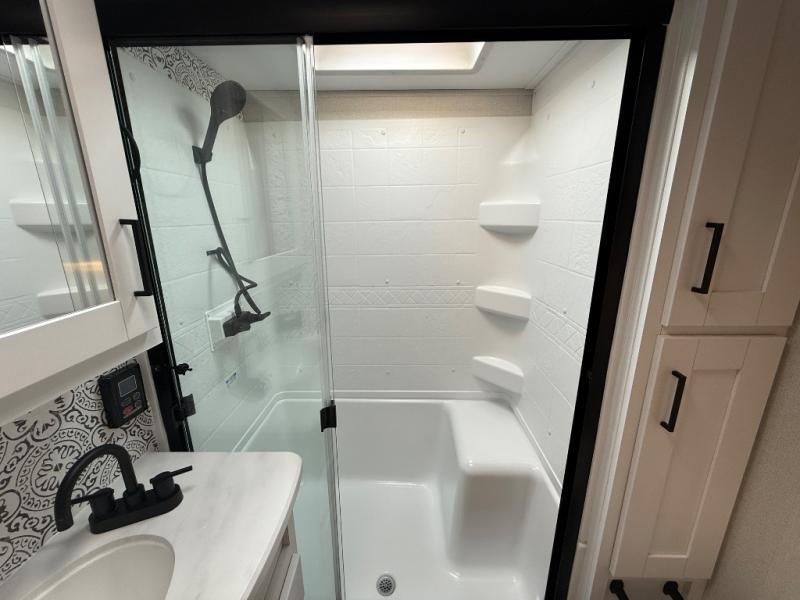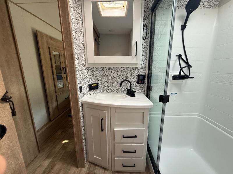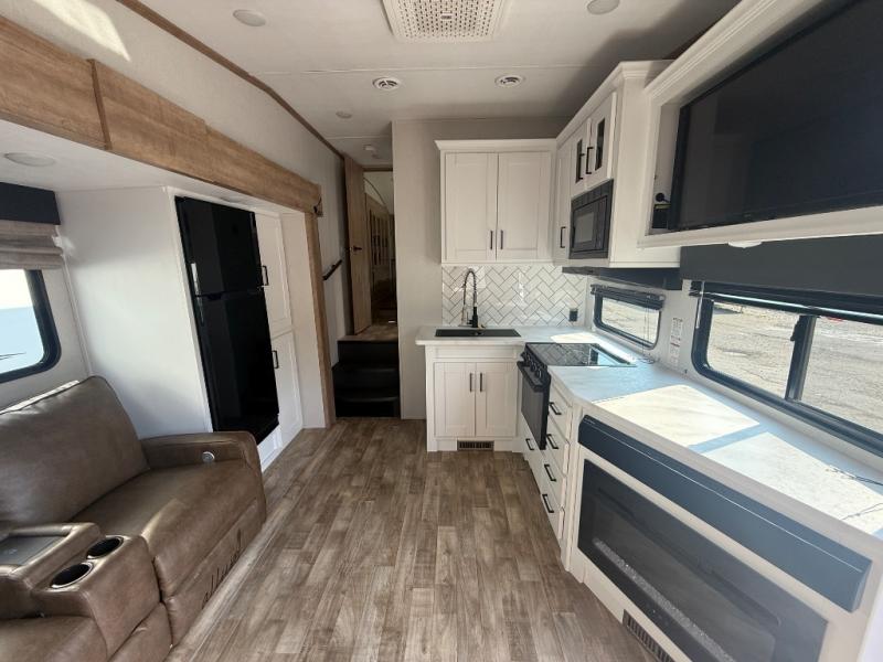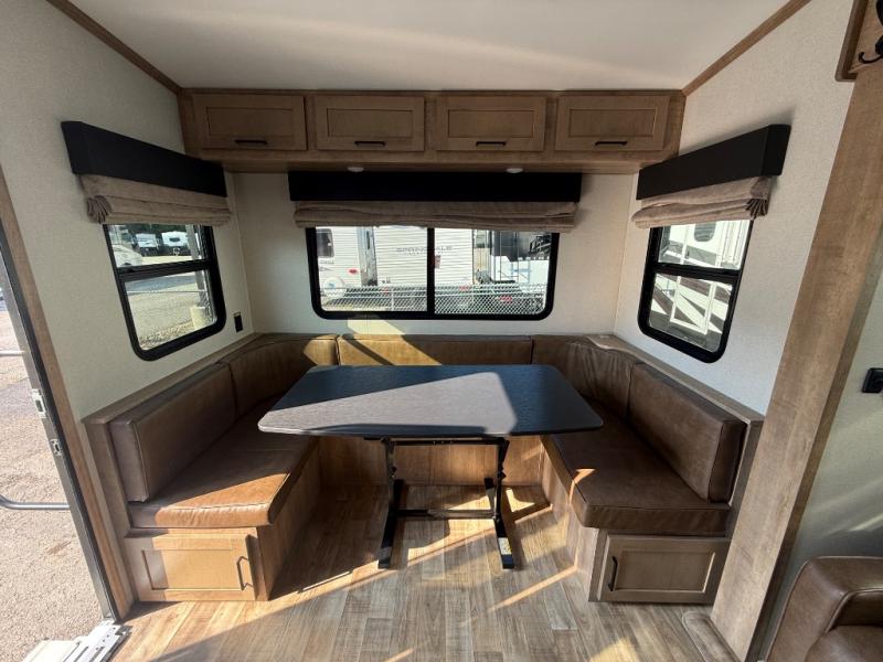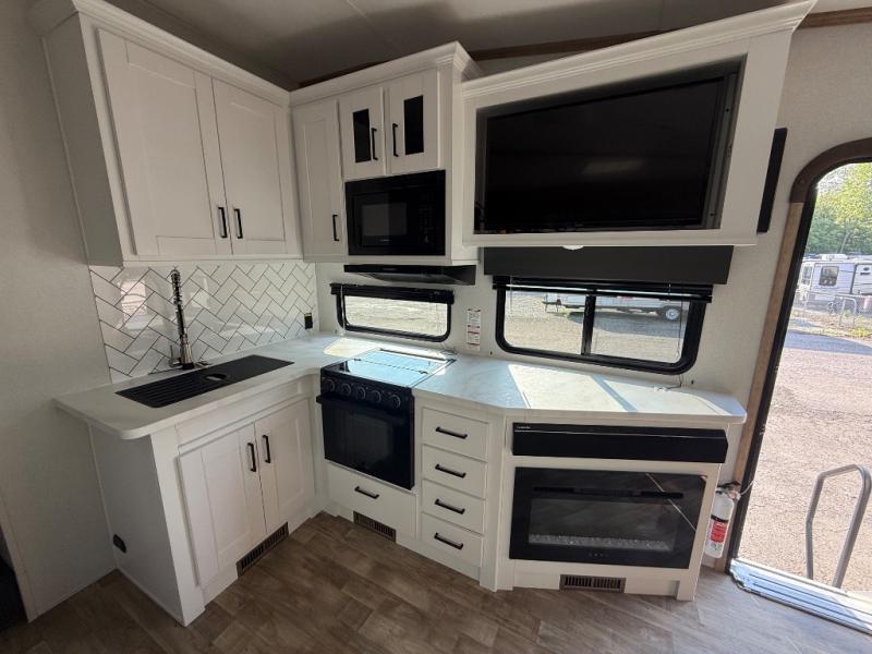 This fifth wheel is both spacious and easy to tow; so come take a look! When you arrive at the campground you can set up the 20' electric awning, then stretch your legs on a trail or two. The full bath will be waiting for you when you return, and you'll enjoy a large shower here with a glass door and a skylight for added light. Head to the full kitchen to prepare dinner on the three burner cooktop, or use the microwave oven here. There is also a high-rise chef's faucet and sprayer here and a 10 cu. ft. 12V "solar friendly" refrigerator with dent resistant doors. Your crew can dine around the U-shaped dinette with the fireplace close by, plus this model includes theater seating for all-around comfort! After a long day, the queen bed in the front bedroom will be calling your name, while your guests sleep on the rear dinette.