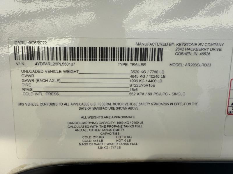 | Awning Info | 20' Electric w/Gas Strut Arm |
