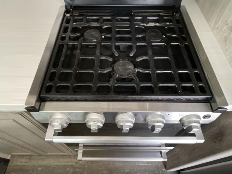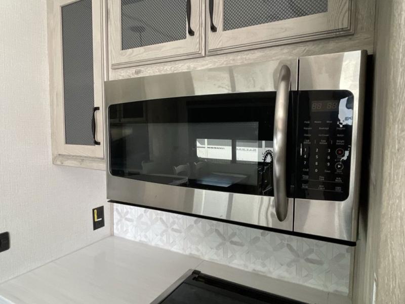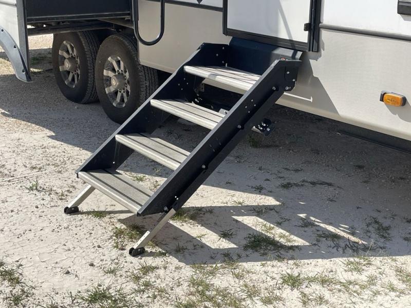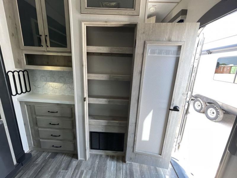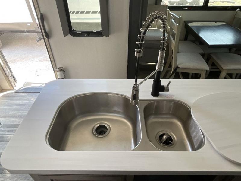This grand kitchen offers the cook their own space to prepare and serve meals from the large L-shaped counter peninsula bar with stools, and the large pantry and curio will come in handy as well. Dining is also available at the free standing dinette with four chairs and some might even enjoy sitting on the hide-a-bed sofa sleeper. Also available for seating are the theater seats which are equipped with heat, massage, LED lights and USB charging. The master bedroom offers a king bed with storage underneath and additional wardrobe storage plus a space prepped for a washer/dryer option. Having a separate living area from the kitchen gives everyone their space, and outside there are two power awnings offering an outdoor living area protected from the elements. The cook will enjoy the outside kitchen amenities, and if you need more cold storage, add the optional residential refrigerator.