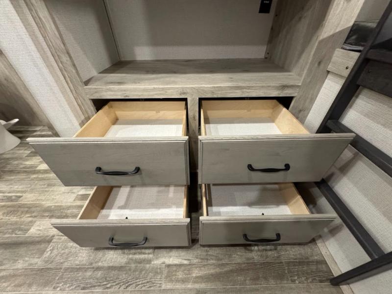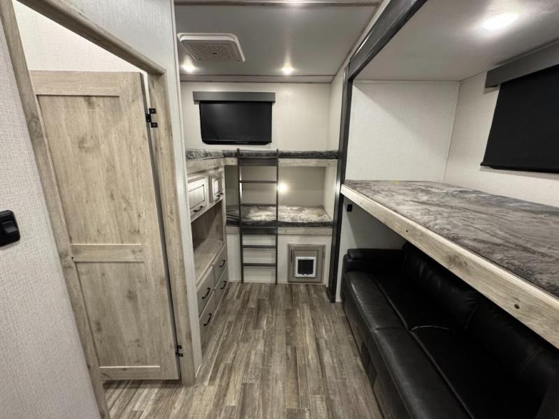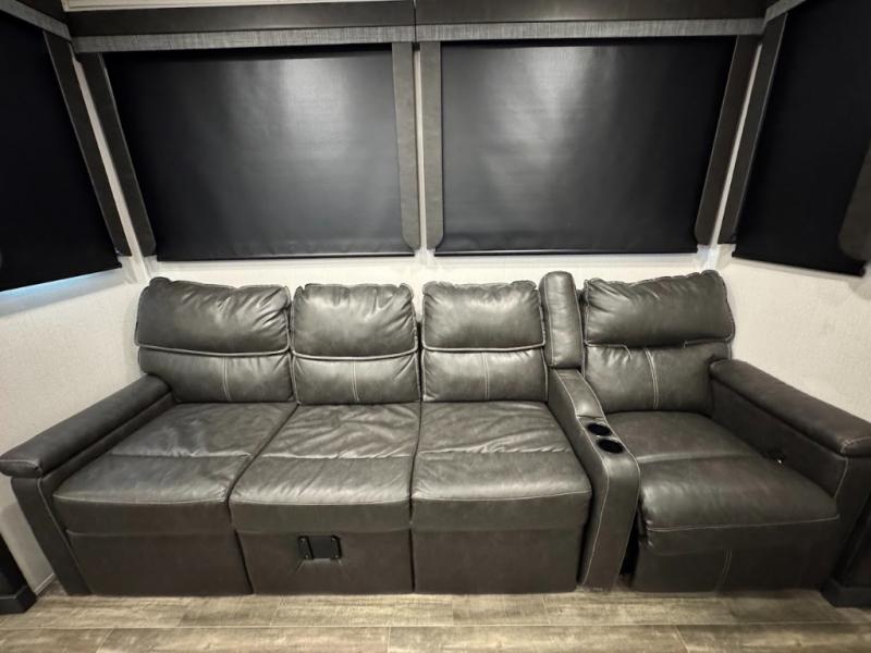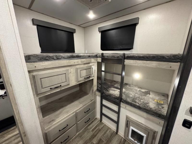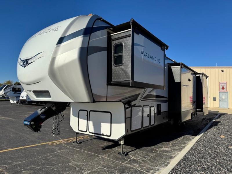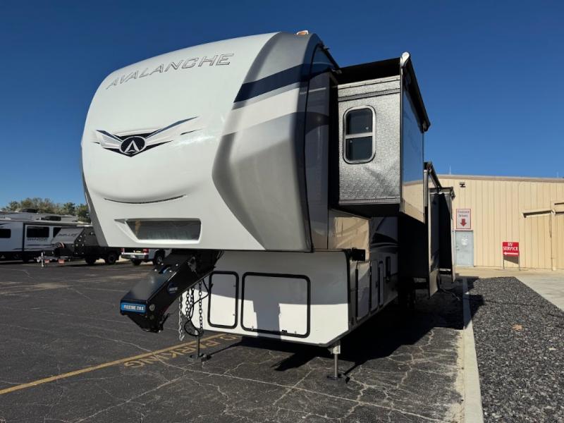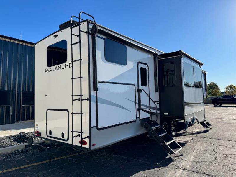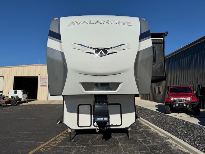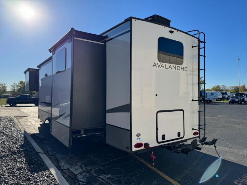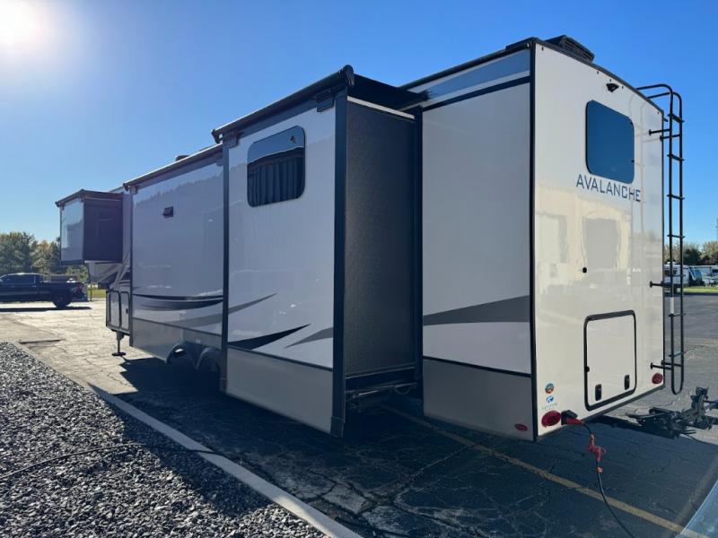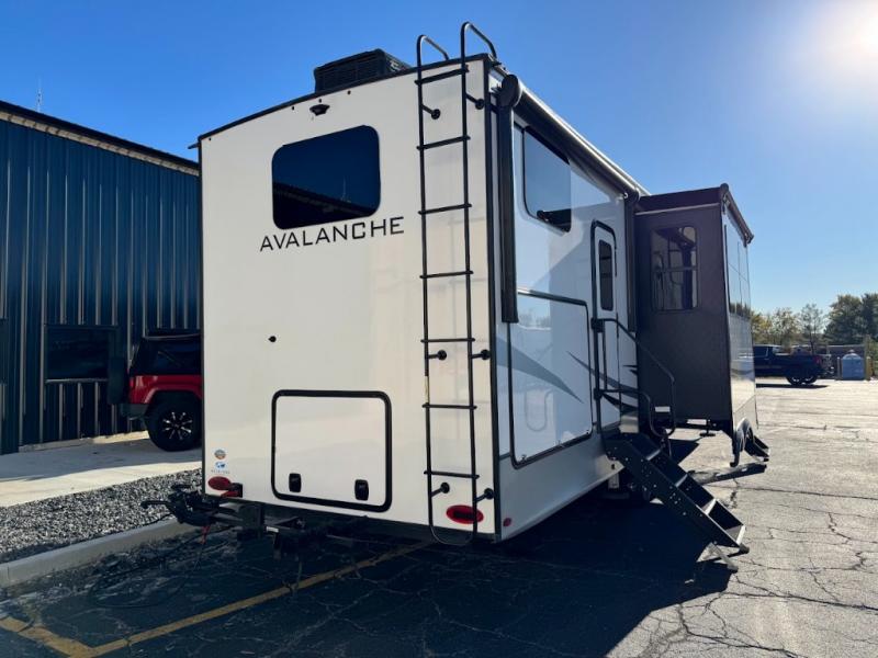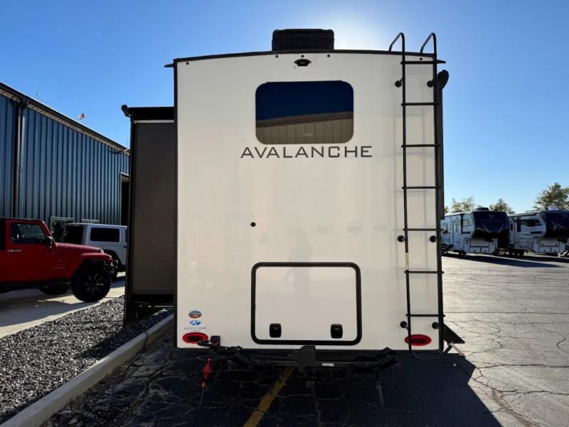 You won't believe how many extravagant details have been included in this Avalanche fifth wheel! Traveling with guests or extended family will be easy to do with the separate bunkhouse suite and master suite. Since the master suite has its own master closet and entrance into the full bathroom, and the bunkhouse contains its very own half bathroom, everyone will have their own private space to get ready each morning. On top of that, you will also be able to choose where you want to prepare and cook each day's meals with both a spacious indoor kitchen with full amenities, plus an outdoor kitchen. There is even an outdoor entertainment center with TV. You can also add an option or two such as a washer/dryer and/or a residential refrigerator. And there is so much more to love about this fifth wheel!