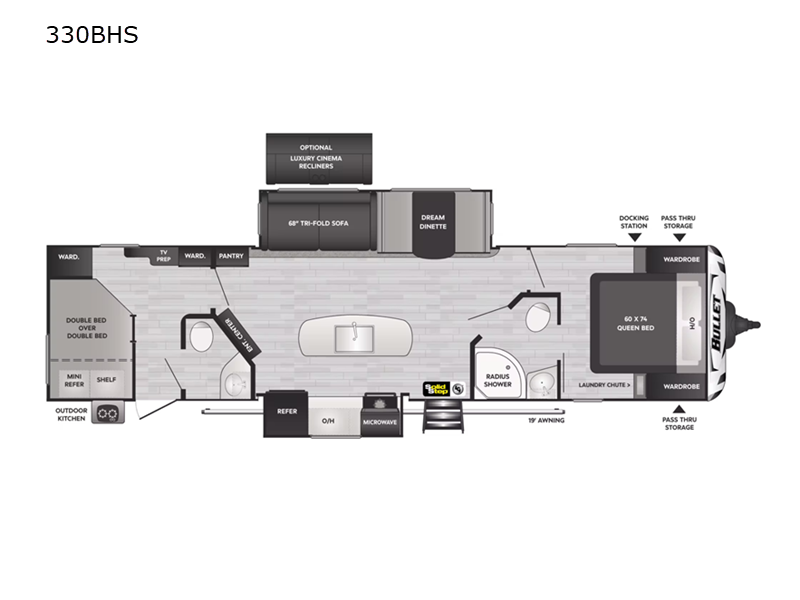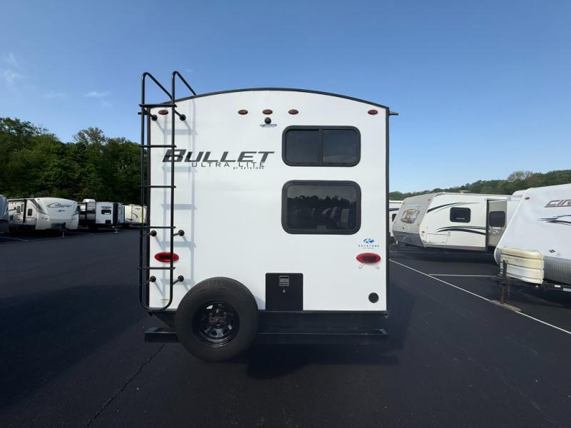 With any Keystone Bullet travel trailer you can experience ultra-lightweight camping with style! The interior design and functionality will impress you, and the stunning cabinetry, the vaulted ceilings, and the built-in laundry chute are just a few of the highlights. Each is built with Hyper Deck RV flooring that is stronger, lighter and more resilient than traditional wood laminated flooring, a 51 cu. ft. pass-through storage compartment which provides 25% more storage space and has a 40" wider door meaning easier access and more room for supplies, and a docking station, an easily accessible convenience center with water connections, water heater bypass, KeyTV hookups, stabilizer jack switches and winterization access. You will also find a Giggy box, a weather protected, labeled, and fused electric box, plus more Keystone Exclusives. Start your glamorous and carefree trip today in a Bullet!