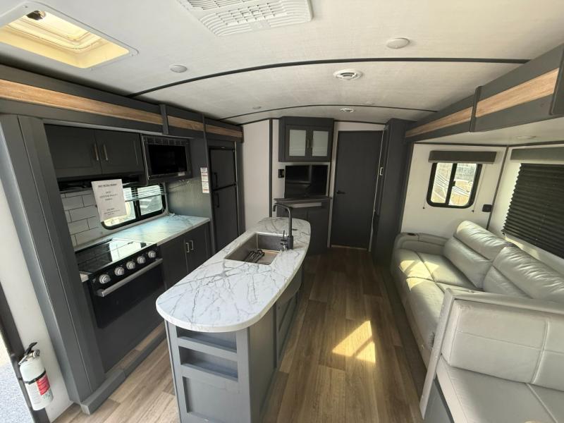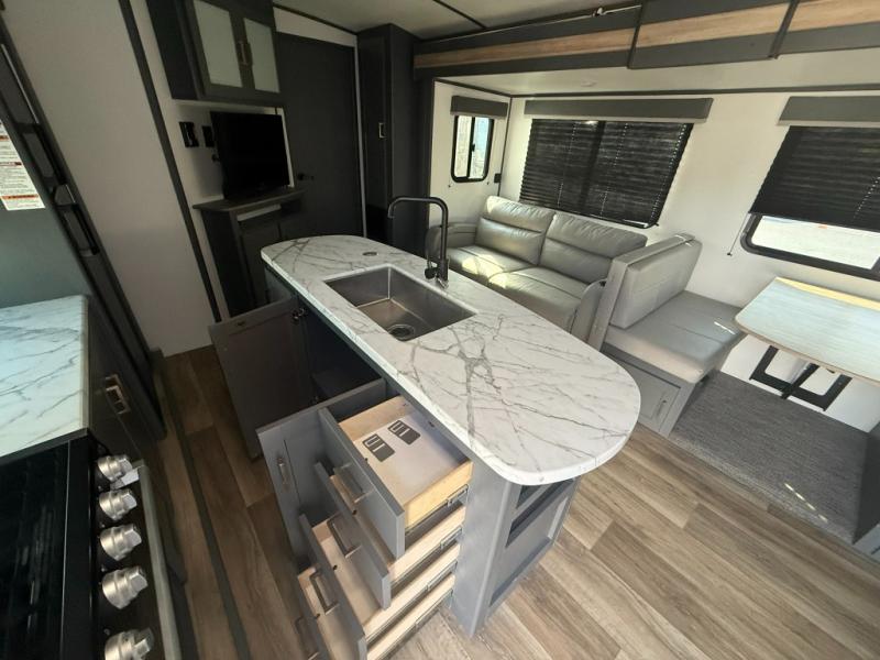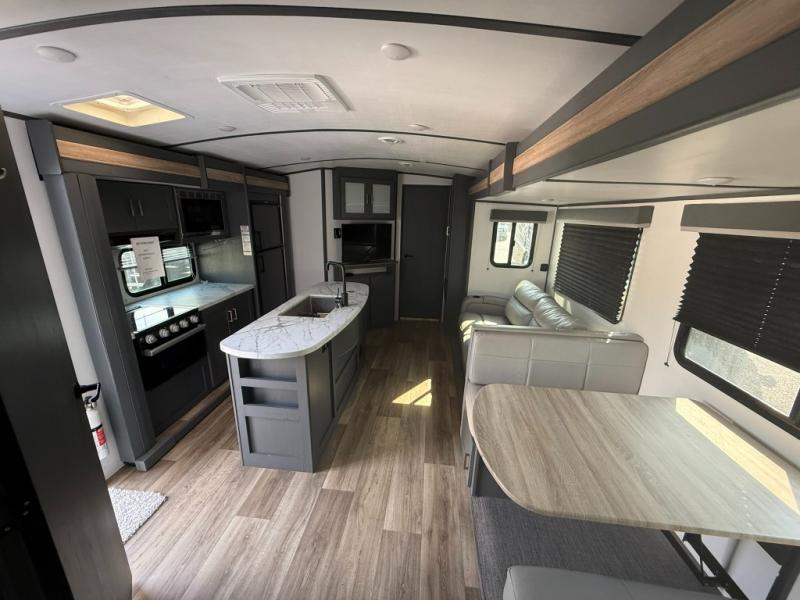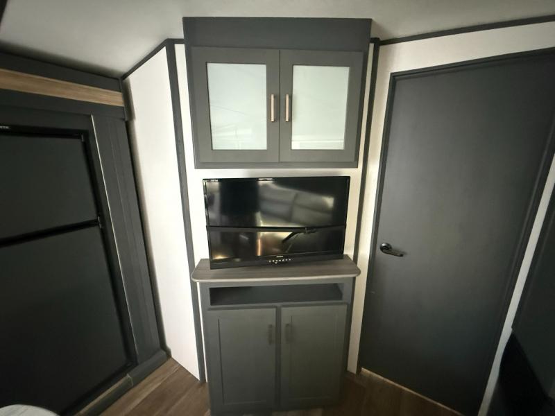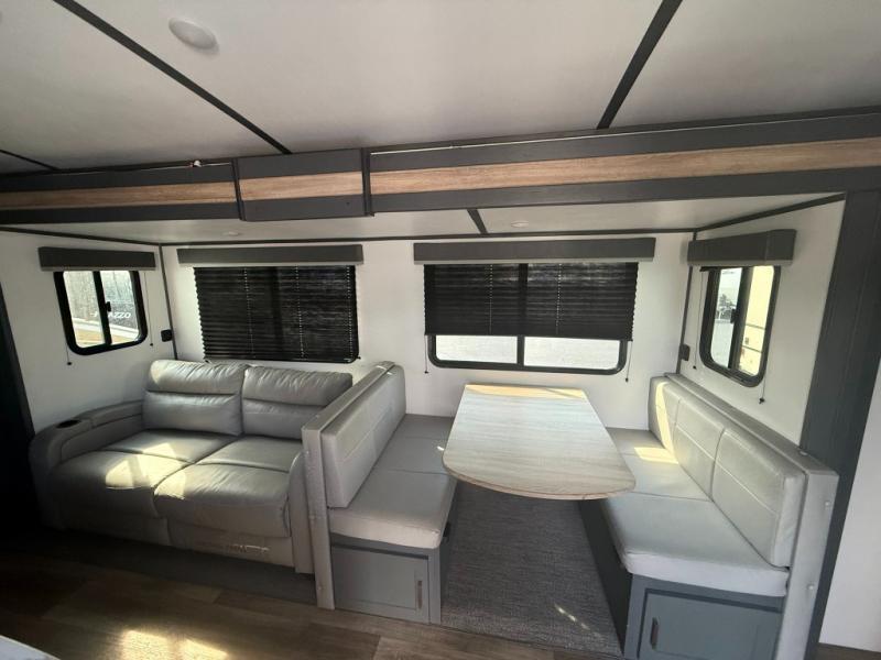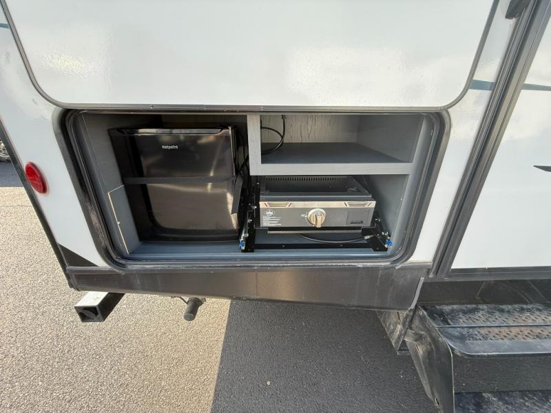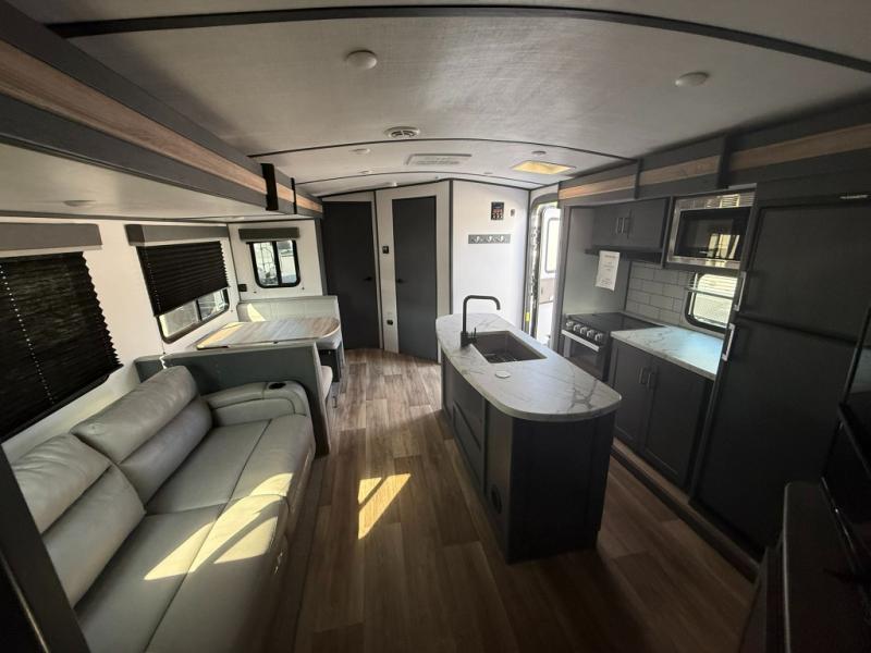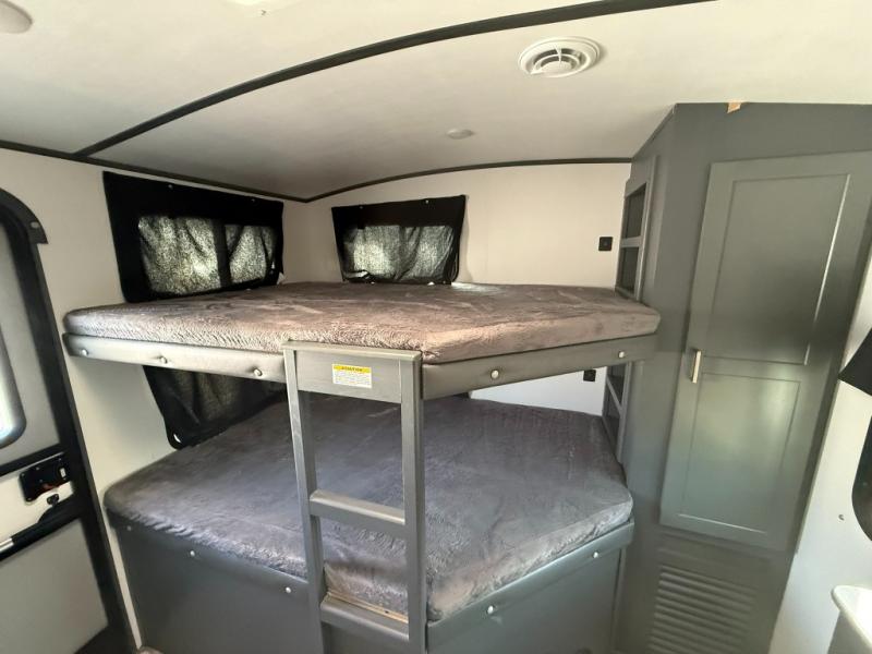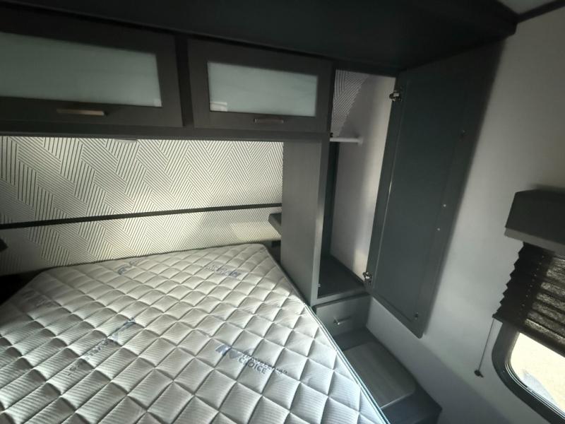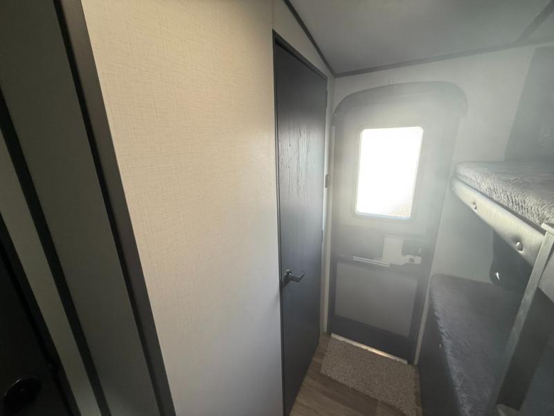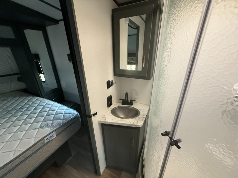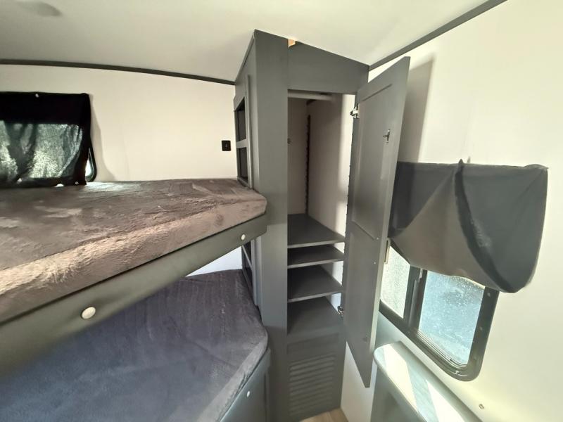 Enjoy camping with your own space in this RV with a private front bedroom with access to the full bathroom, plus a private bunkhouse in the rear that includes double-size bunks, two wardrobes, a half bath and the second entry into the trailer. The main living and kitchen is super spacious with dual opposing slides. You can relax on the tri-fold sofa or the Dream dinette, and the cook will have Furrion appliances, an 8 cu. ft. refrigerator, a kitchen island a pantry to make meals for all. Someone can use the outside kitchen as well, plus the 19' electric awning offers an outdoor living area once you add your camping chairs.