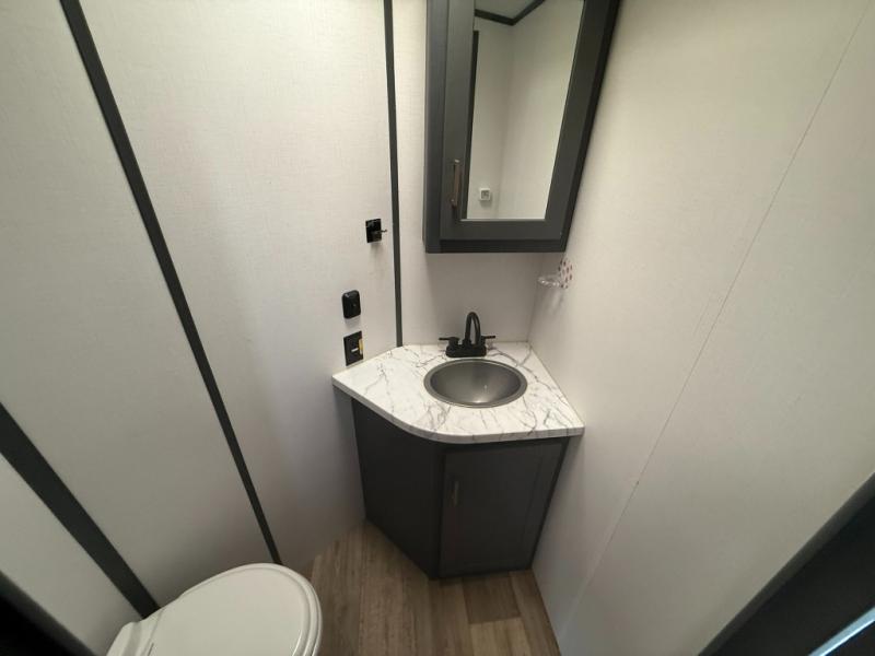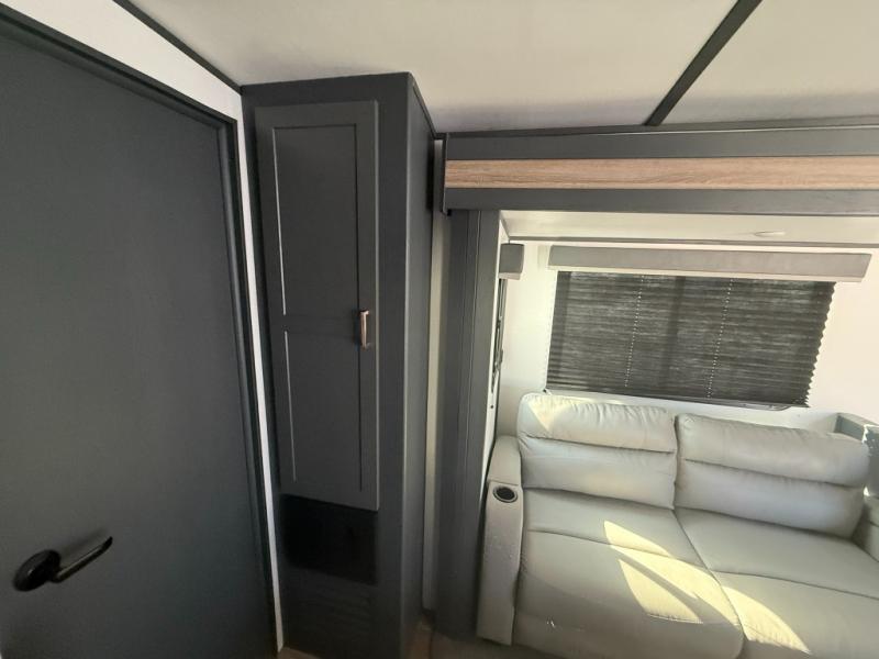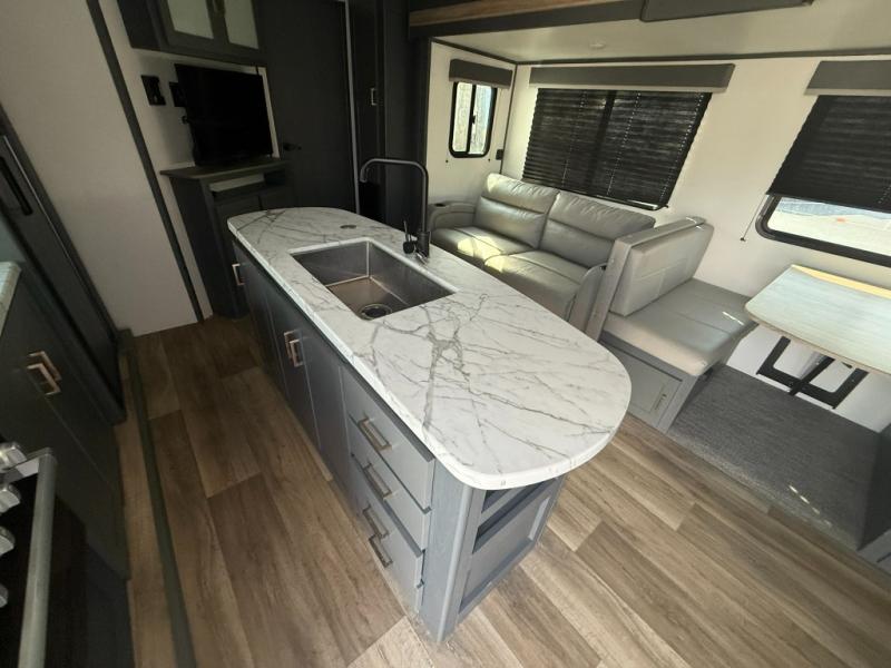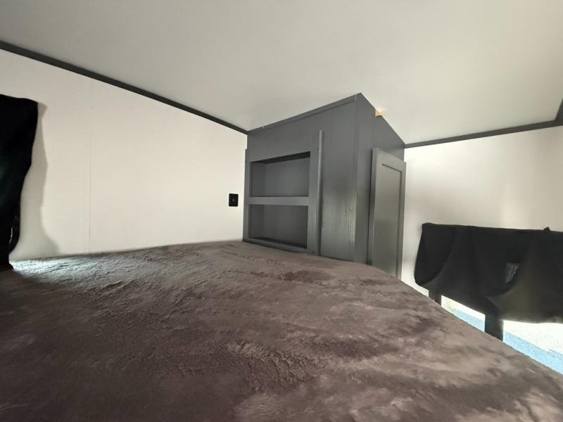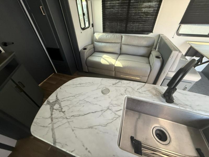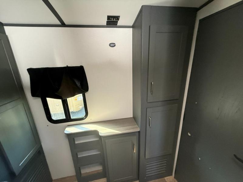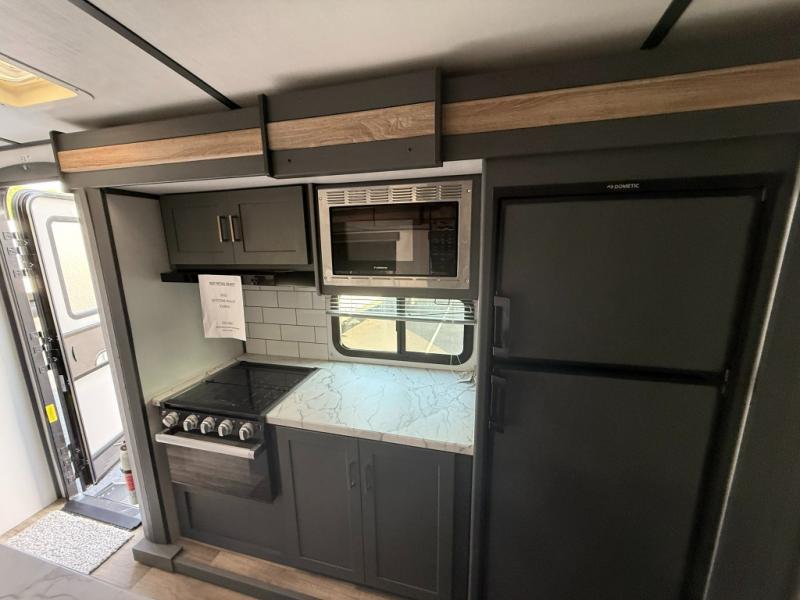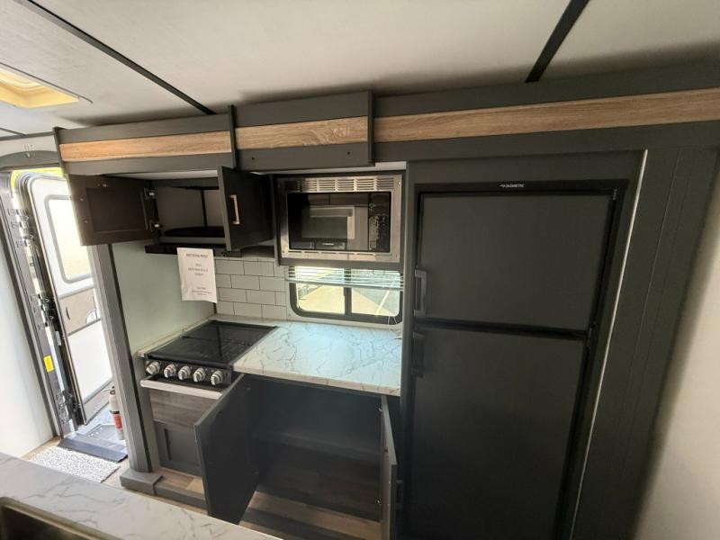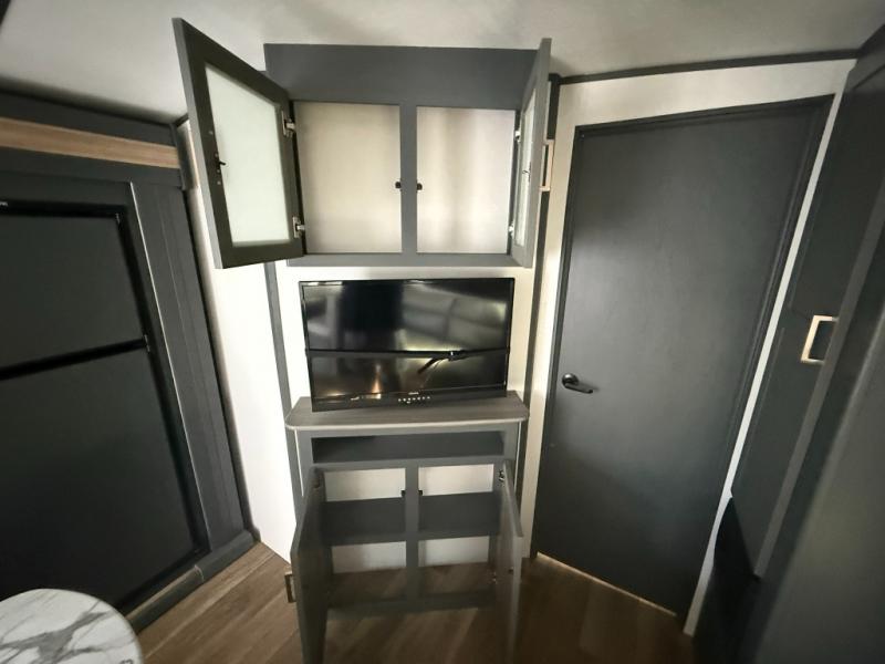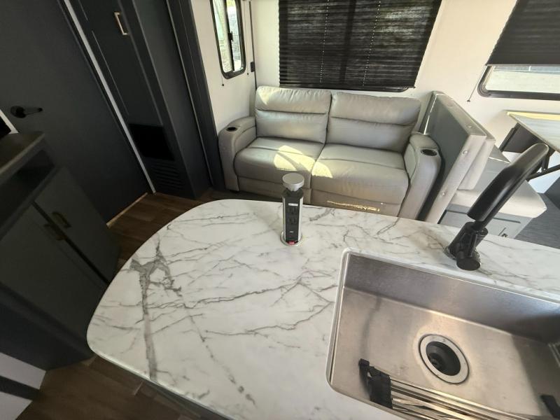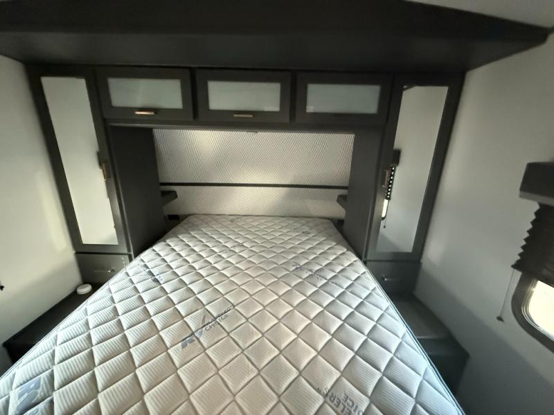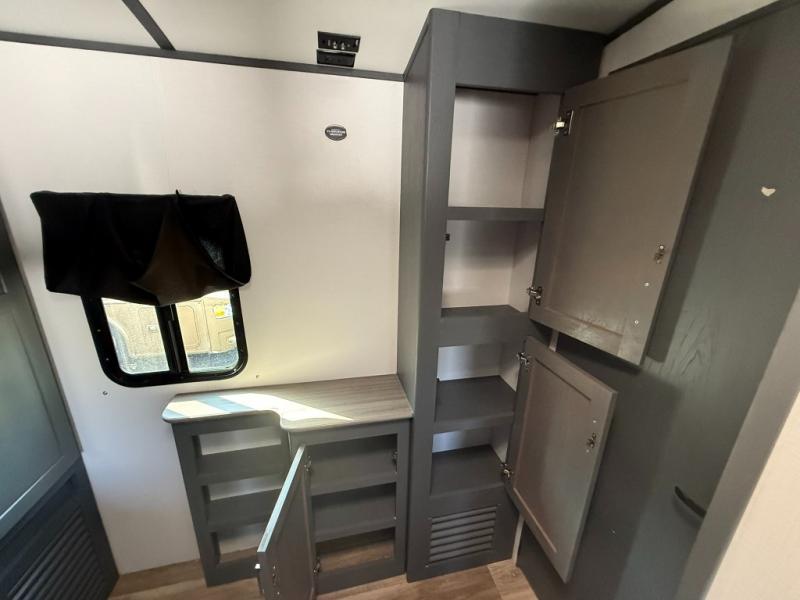 Enjoy camping with your own space in this RV with a private front bedroom with access to the full bathroom, plus a private bunkhouse in the rear that includes double-size bunks, two wardrobes, a half bath and the second entry into the trailer. The main living and kitchen is super spacious with dual opposing slides. You can relax on the tri-fold sofa or the Dream dinette, and the cook will have Furrion appliances, an 8 cu. ft. refrigerator, a kitchen island a pantry to make meals for all. Someone can use the outside kitchen as well, plus the 19' electric awning offers an outdoor living area once you add your camping chairs.
