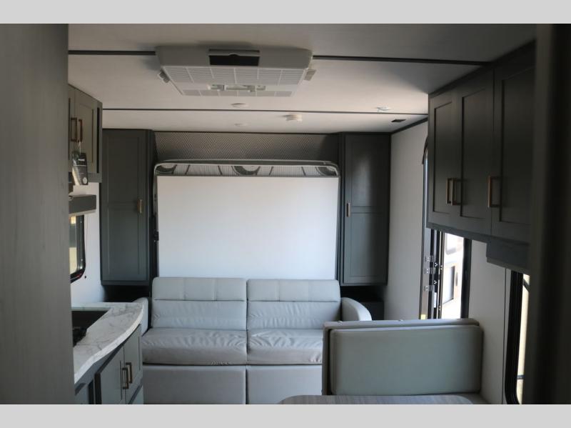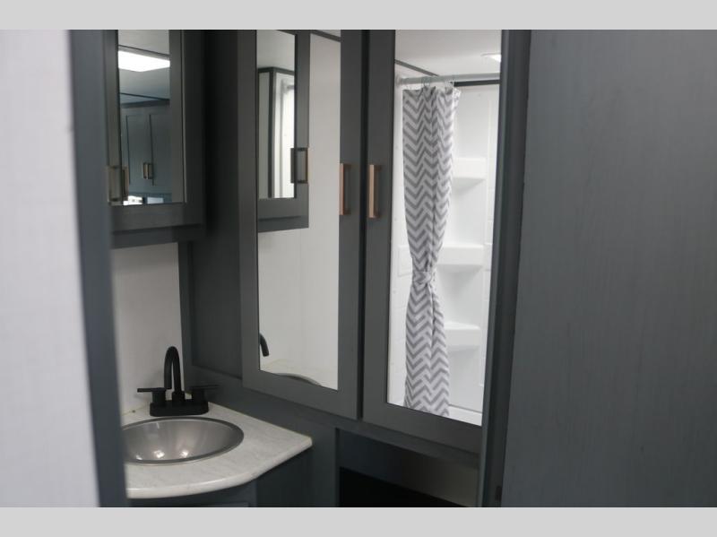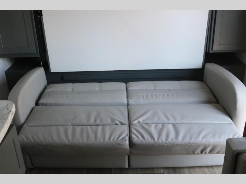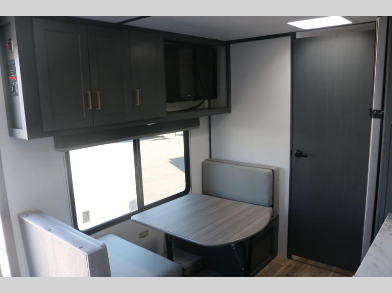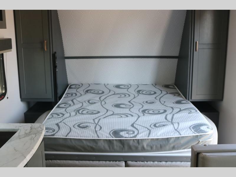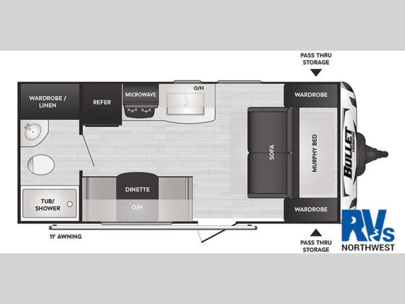If you're looking for a versatile travel trailer, your search is over! This model includes a front Murphy bed that can be folded away in the morning so you can relax on the sofa. There is a booth dinette where you can dine, relax, and even sleep an extra guest or two small children. The spacious full rear bath includes a wardrobe/linen closet to clean up each day, and a tub/shower that will be perfect for little ones. You'll find plenty of storage space for all your belongings, including overhead compartments, dual bedroom wardrobes, and an exterior pass-through storage for fishing poles!