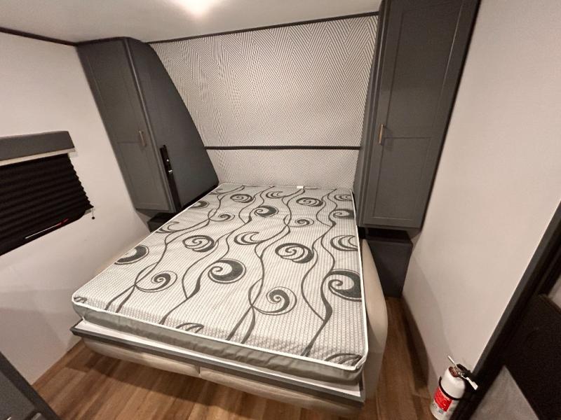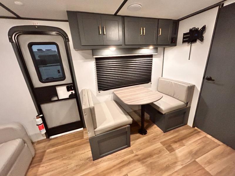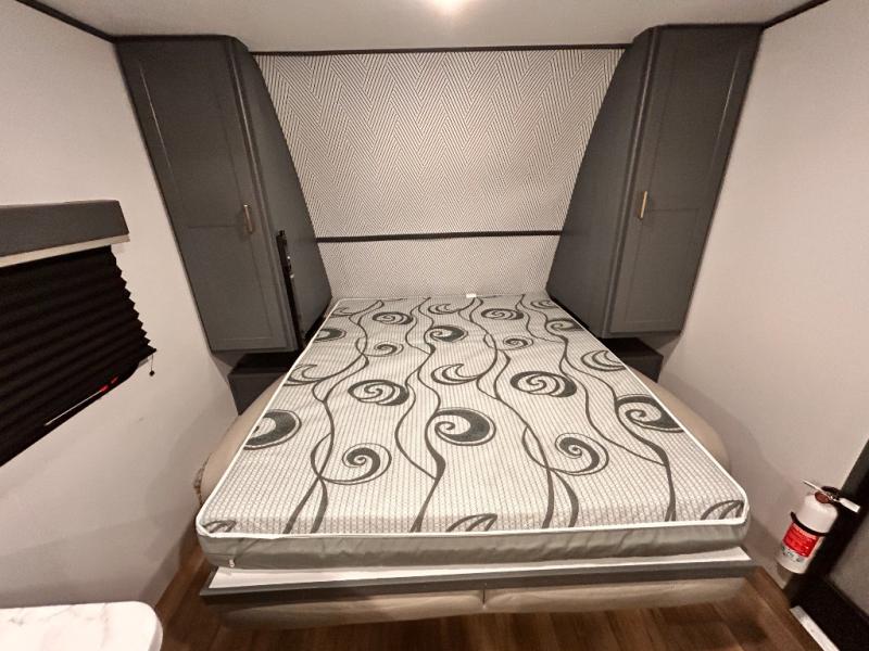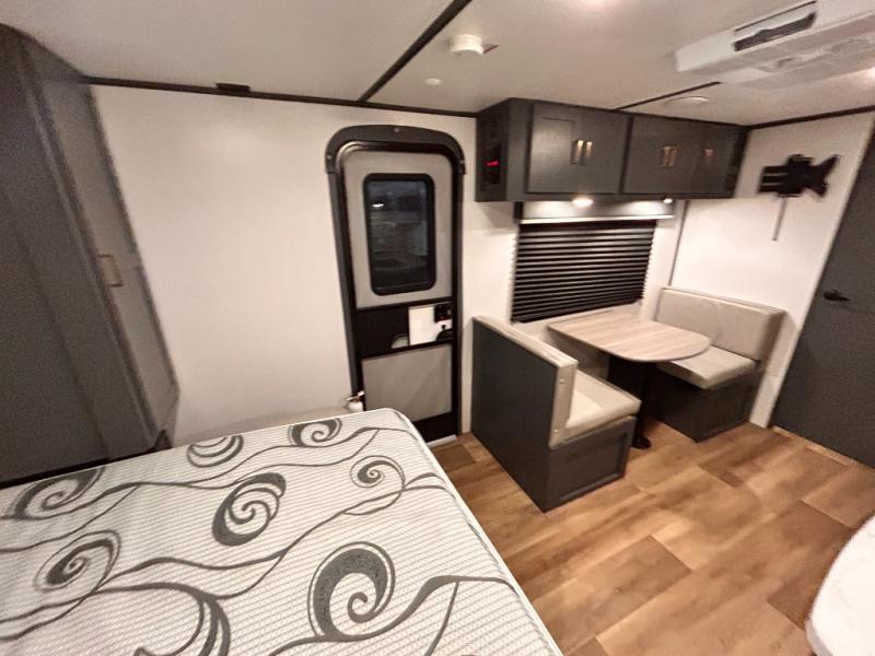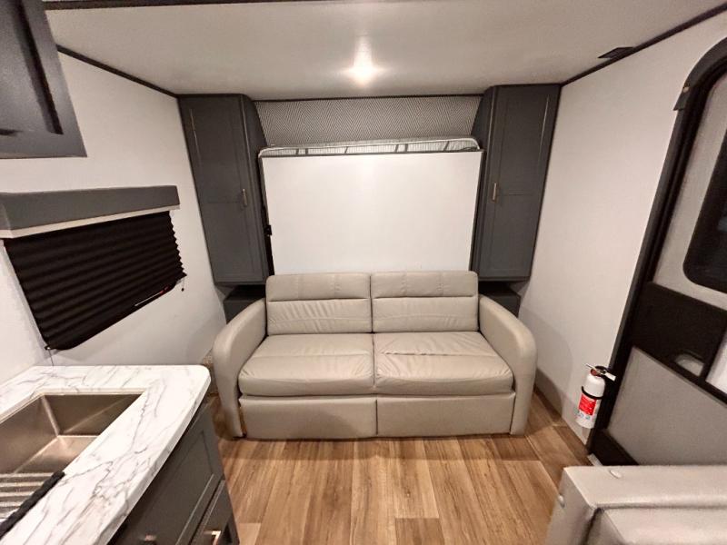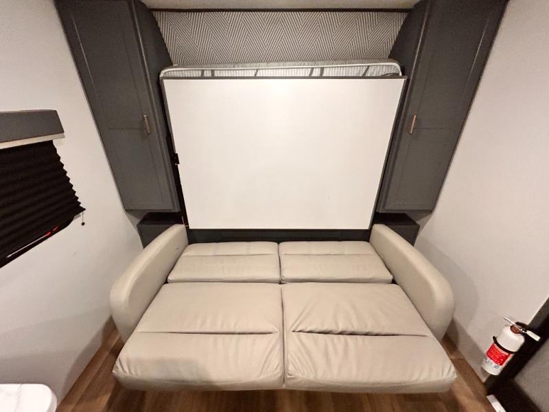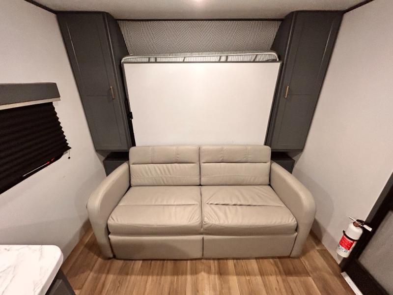If you're looking for a versatile travel trailer, your search is over! This model includes a front Murphy bed that can be folded away in the morning so you can relax on the sofa. There is a booth dinette where you can dine, relax, and even sleep an extra guest or two small children. The spacious full rear bath includes a wardrobe/linen closet to clean up each day, and a tub/shower that will be perfect for little ones. You'll find plenty of storage space for all your belongings, including overhead compartments, dual bedroom wardrobes, and an exterior pass-through storage for fishing poles!