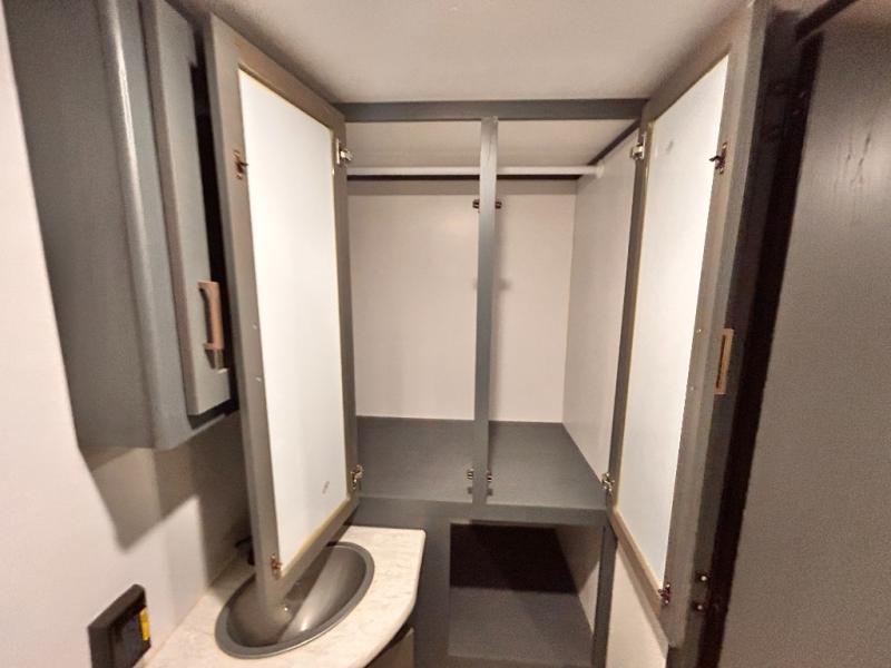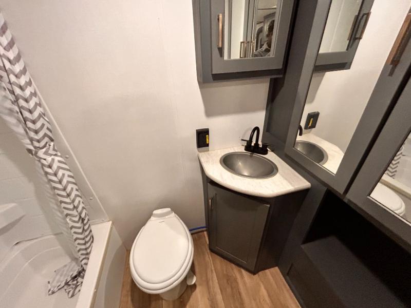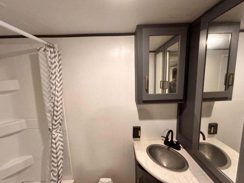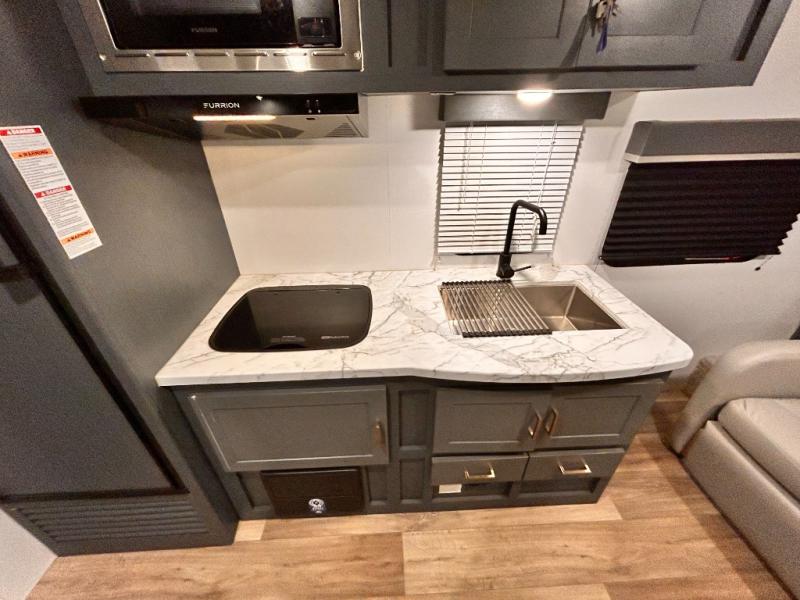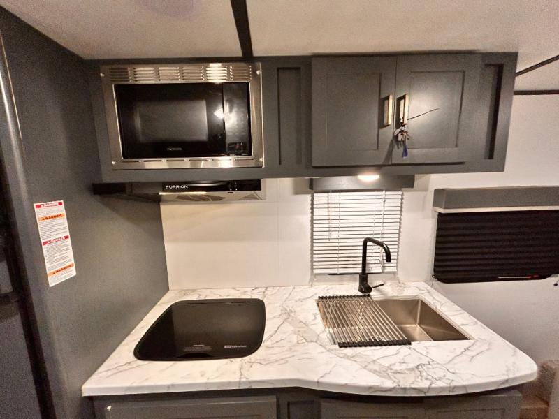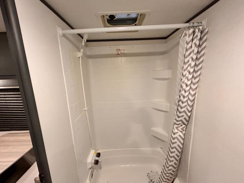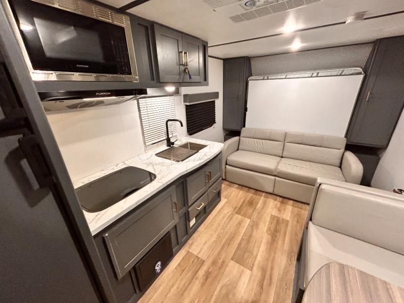 If you're looking for a versatile travel trailer, your search is over! This model includes a front Murphy bed that can be folded away in the morning so you can relax on the sofa. There is a booth dinette where you can dine, relax, and even sleep an extra guest or two small children. The spacious full rear bath includes a wardrobe/linen closet to clean up each day, and a tub/shower that will be perfect for little ones. You'll find plenty of storage space for all your belongings, including overhead compartments, dual bedroom wardrobes, and an exterior pass-through storage for fishing poles!