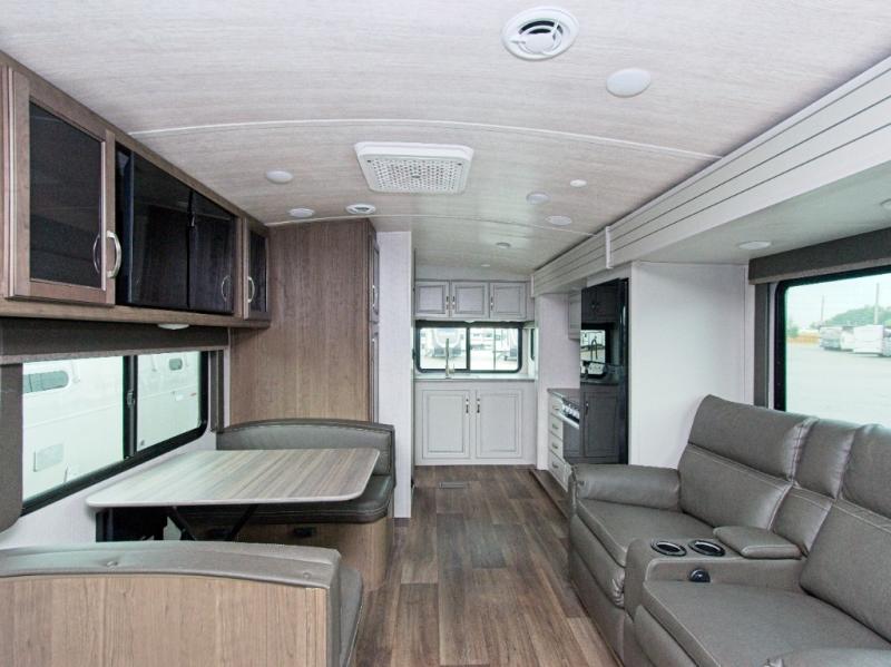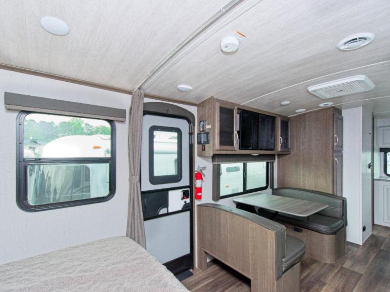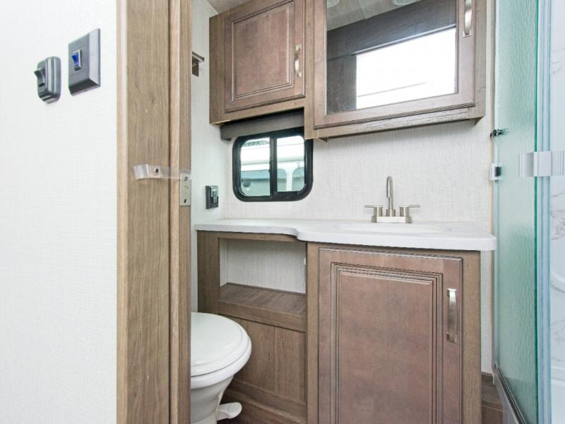 Upon entering through the LCI Solid Step, you'll find a handy shoe cubby to your left. The booth dinette is conveniently located next to the pantry, and the full bathroom is a standout feature for any trailer.