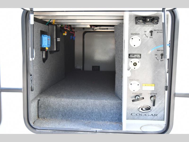 Grab your gear, your family, and your sense of adventure and head out with this Cougar Half-Ton fifth wheel! You'll have plenty of space to bring along your favorite gear with the rear storage compartment, the hidden storage space behind the entertainment center, the linen closet, the wardrobe slide, and the exterior pass-through storage. Plus, you will also find a private bedroom for a quick nap or a night of sleep, and the 68" tri-fold sleeper sofa will be great to have when you have any afternoon visitors turn into overnight guests.