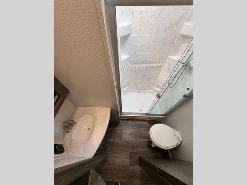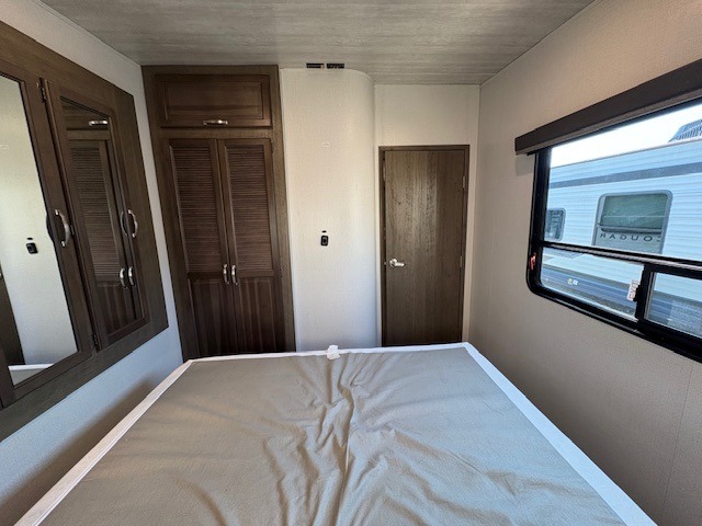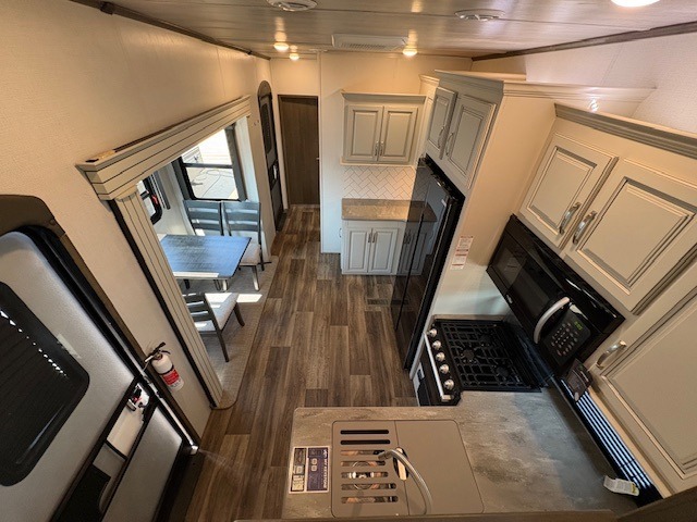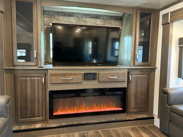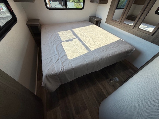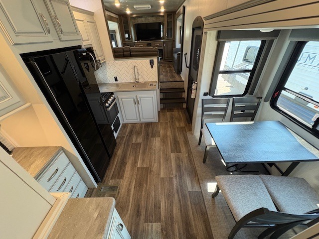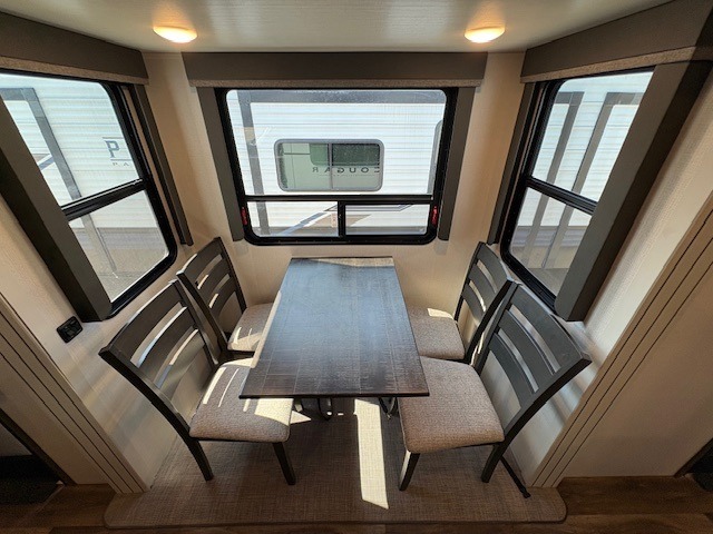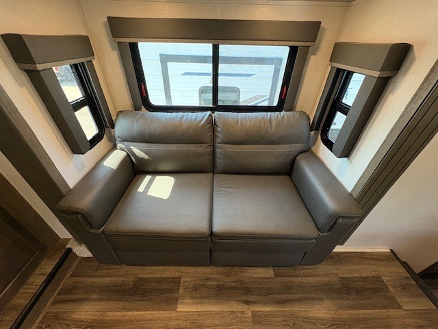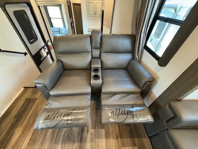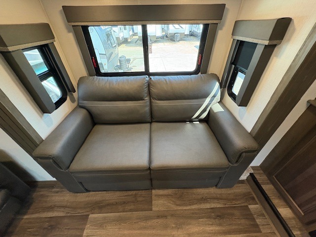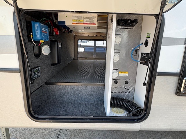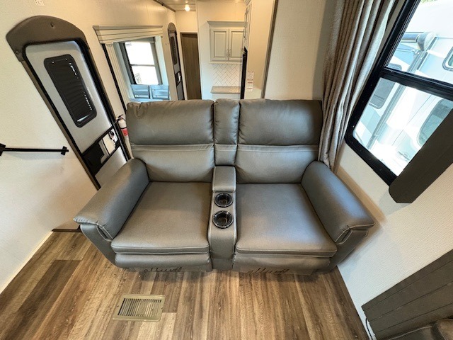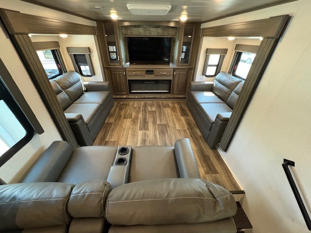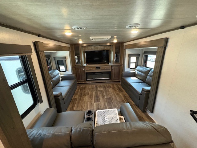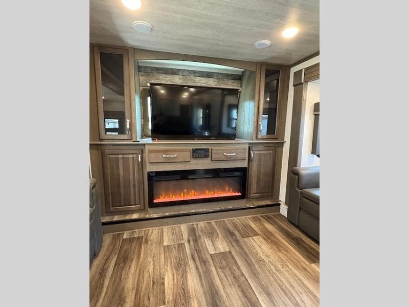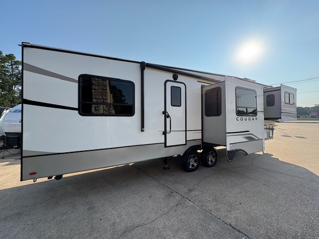 This Cougar fifth wheel will make you feel like you're on top of the world! It offers you a living space that truly feels like home because of its residential layout. The front separate living room has all of your favorite features, like a fireplace, LED HDTV, two 68" tri-fold sleeper sofas, and theater seating. The kitchen is centrally located and sectioned off from the rest of the interior so that you don't have to try to cook on top of someone who is lounging in front of the TV. You can add an optional free-standing dinette to the slide out across from the kitchen for a place to sit down and eat those delicious meals, and the two entry doors give you access to the front or back portion of this unit. The rear private bedroom has a queen-size bed with a shoe garage underneath, and there is a wardrobe slide that can be used for other clothing items.