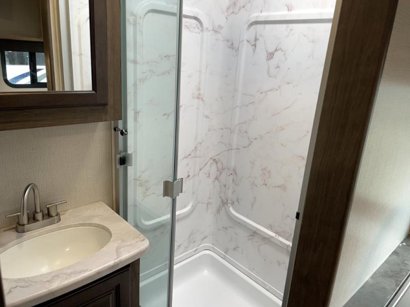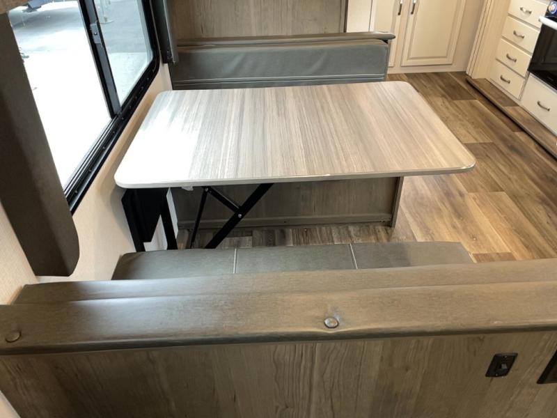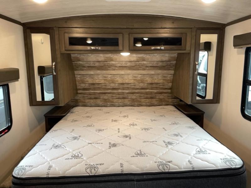 With a king-size bed, this Cougar Half-Ton travel trailer shows that you can still be comfortable even while you're away from home! The bed has wardrobes and nightstands on either side, and it also has a privacy curtain to section it off from the rest of the trailer. When you use the LCI Solid Step entry to get inside, you'll notice and appreciate the shoe cubby to your left. Right next to the booth dinette is the pantry, and next to the pantry is the full bathroom which is certainly one of the most valuable features to any trailer.