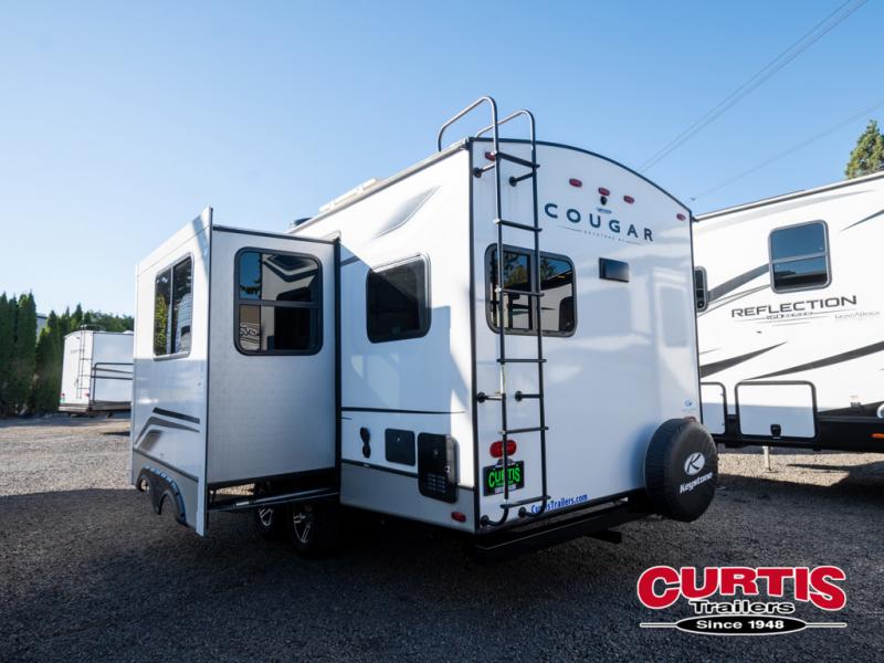 Get to your favorite places with this accommodating and stylish Cougar Half-Ton travel trailer! The single slide holds the 68" tri-fold sleeper sofa so that you can have enough room to spread out and relax at night, and if you want a little snack while you play some games, you can heat up some popcorn in the microwave. After the night has ended, nothing will feel better than snuggling into the king-size bed up front in the master suite.
