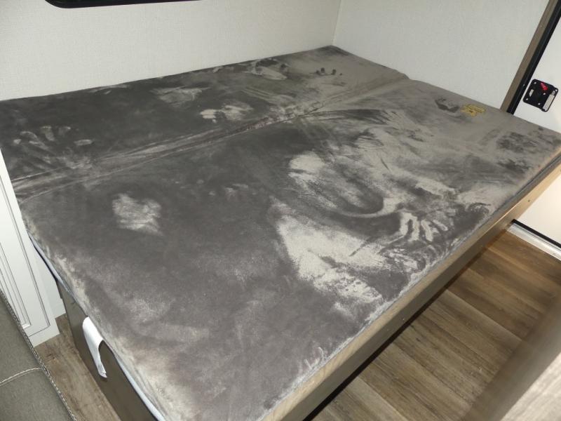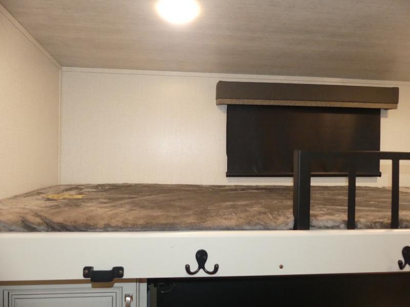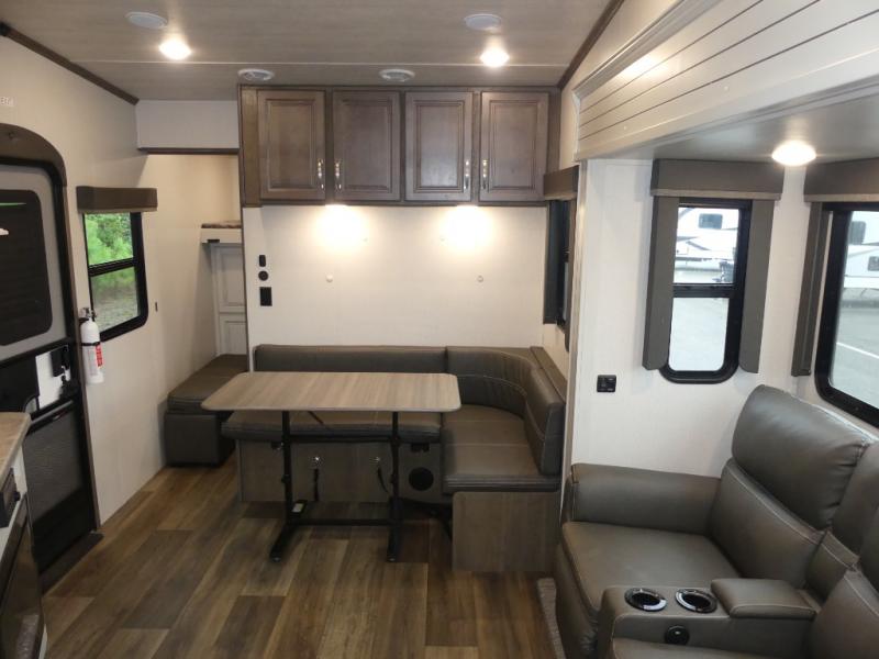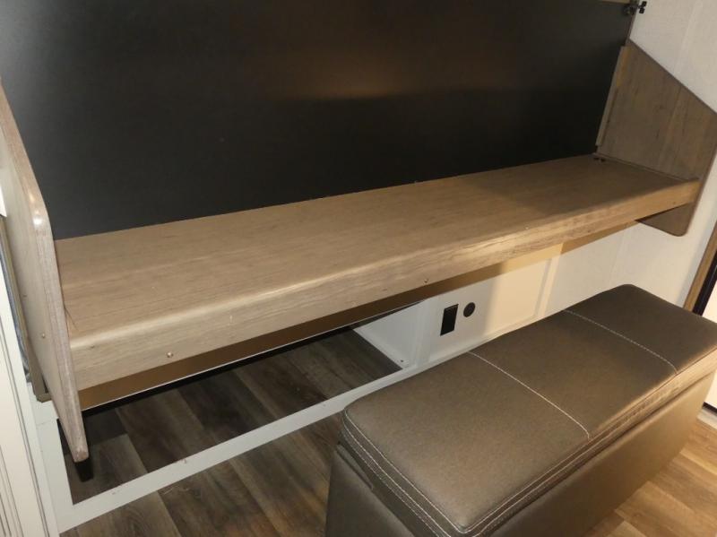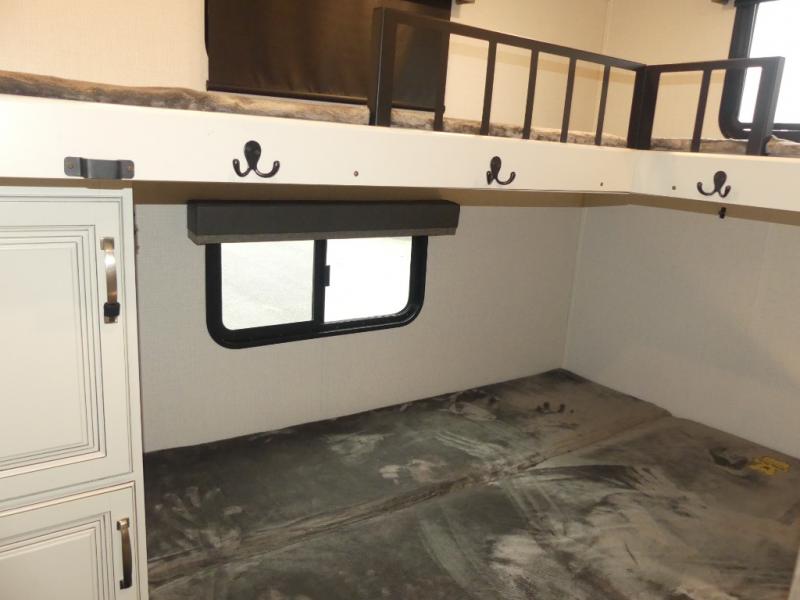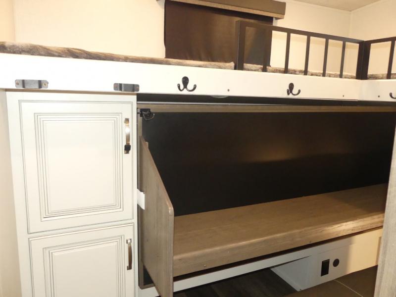 If you're needing additional sleeping space or a place to work on the road, take a look at this fifth wheel! The bunkhouse includes three bunks, and the lower bunk can swing up so you can work at the desk. There is also an exterior cargo door here so you can pack luggage right into the bunkhouse. You will have your own private bedroom up front with a walk-around queen bed, a wardrobe slide, plus dual wardrobes and nightstands. The main living area will be a favorite hangout spot with its theater seats, L-shaped sofa with a table dinette and an ottoman, plus an LED HDTV. This model also includes a 20' power awning, LCI solid steps, and an exterior mini refrigerator and Capital griddle for breakfast outdoors!