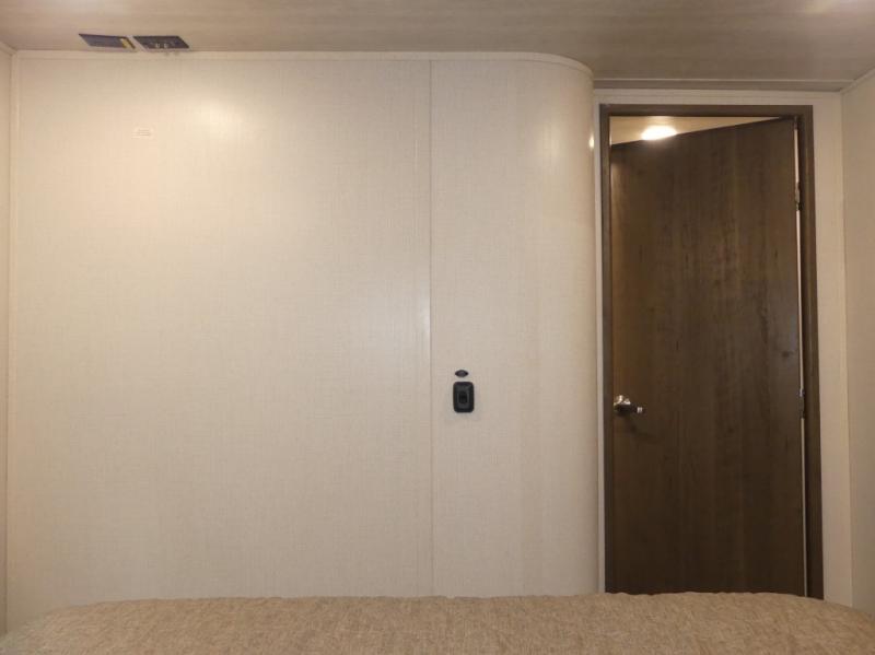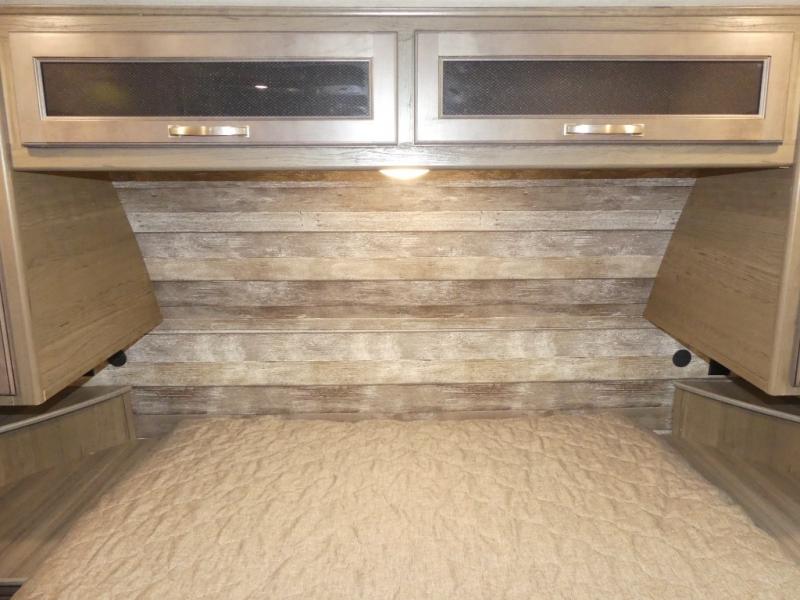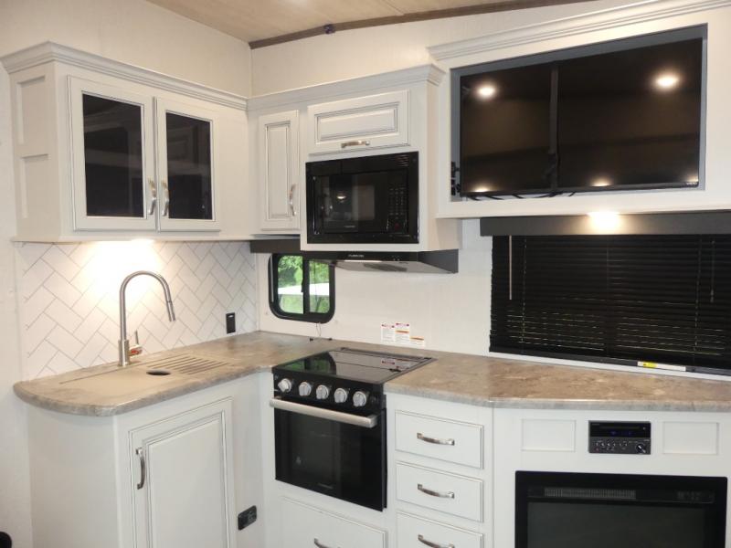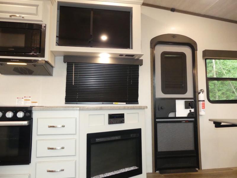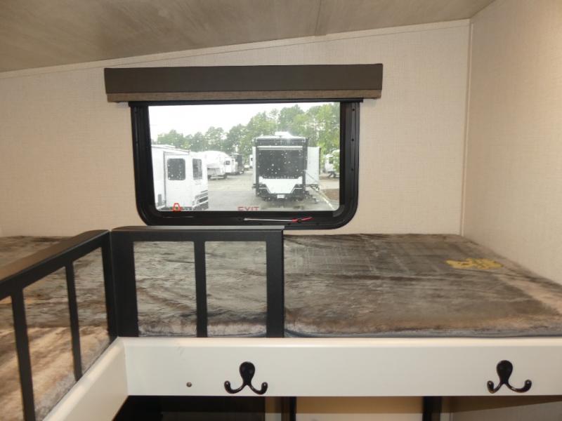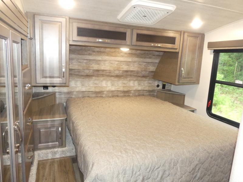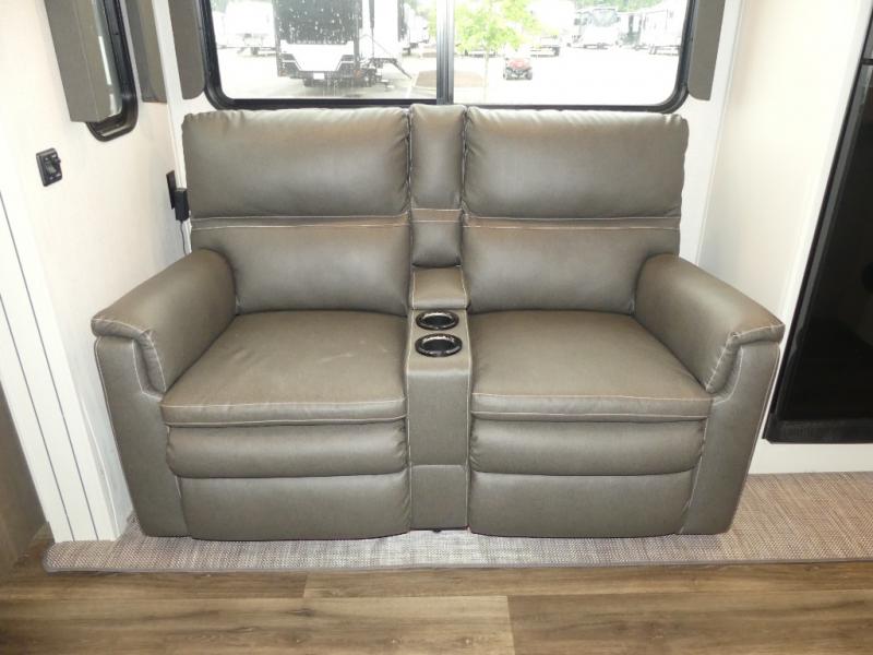 If you're needing additional sleeping space or a place to work on the road, take a look at this fifth wheel! The bunkhouse includes three bunks, and the lower bunk can swing up so you can work at the desk. There is also an exterior cargo door here so you can pack luggage right into the bunkhouse. You will have your own private bedroom up front with a walk-around queen bed, a wardrobe slide, plus dual wardrobes and nightstands. The main living area will be a favorite hangout spot with its theater seats, L-shaped sofa with a table dinette and an ottoman, plus an LED HDTV. This model also includes a 20' power awning, LCI solid steps, and an exterior mini refrigerator and Capital griddle for breakfast outdoors!