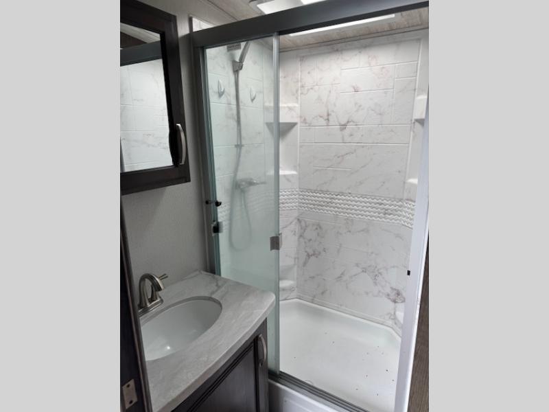 You'll definitely want to snatch up this Cougar Half-Ton travel trailer if you're a couple or small family that wants to live in comfort while at the campsite! There is a private bedroom at the front, and it has a king bed slide, full-width wardrobe, entertainment center, and bench seat which will give you those residential vibes. Right next to the bedroom is a full bathroom that comes with a linen closet prepped for a washer/dryer. The main living area is what truly gives you the royal treatment because it has theater seating directly across from the entertainment center and fireplace, a kitchen island that you can gather around when it's snack time, a booth dinette that will serve as a bed or a dinner table, and a 68" tri-fold sleeper sofa with end tables for a cold drink. The kitchen also has a pantry, so you can keep your trailer stocked with goodies throughout the whole trip.