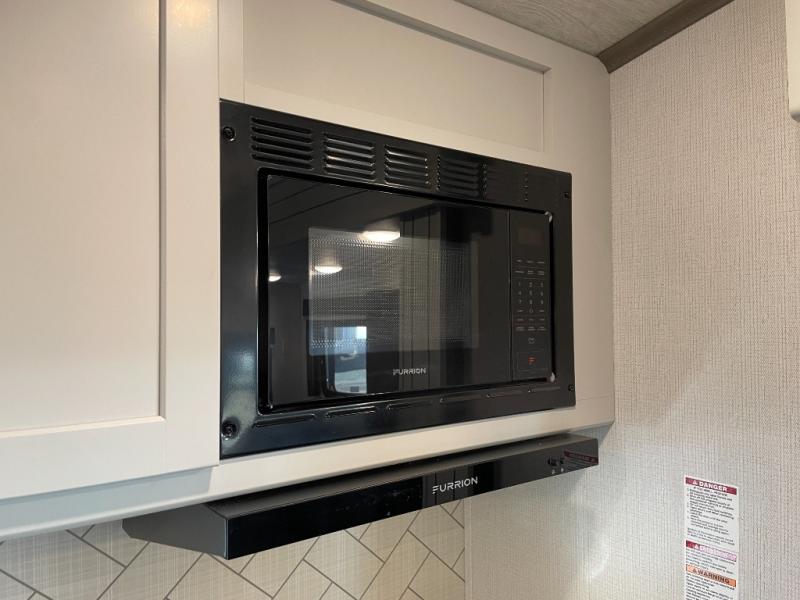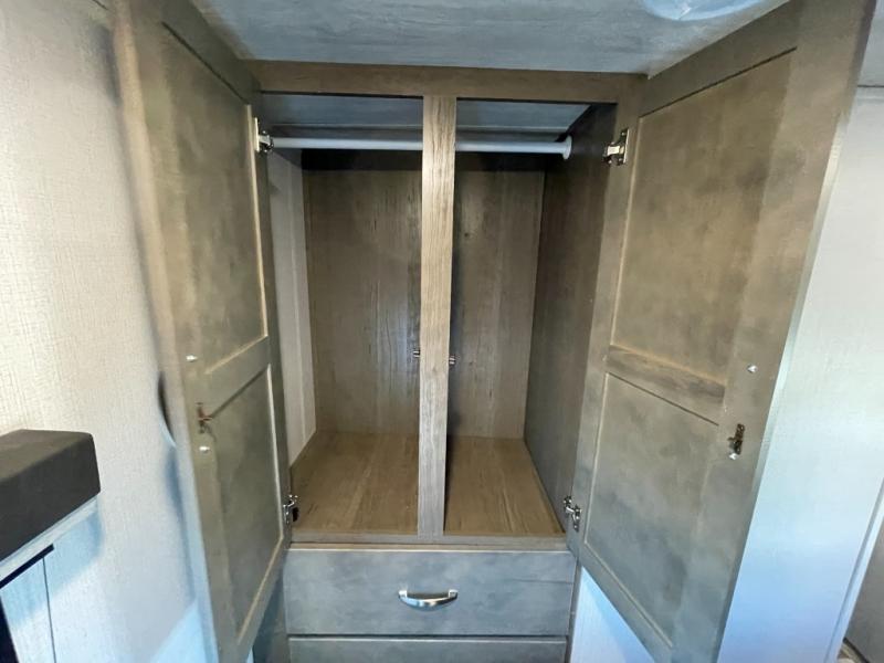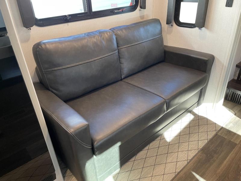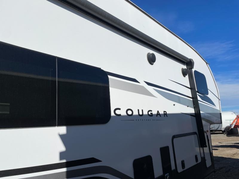 Your family of five or six will love traveling in this Cougar Sport lightweight fifth wheel! Enter to find a convenient rear kitchen layout just steps inside the door. Drop your shoes off in the shoe cubby to your right at the door, and relax on either the tri-fold sleeper sofa or at the booth dinette. The sofa and a 12 volt refrigerator are situated in a slide for added roominess inside. Head up the steps to a complete bath and private front bedroom featuring a queen size bed with dual shirt wardrobes and nightstands on both sides of the bed. There is also a wardrobe off the foot of the bed along the inside wall with two convenient drawers as well. The bathroom offers a shower with skylight for added headroom and natural lighting. You will also appreciate the medicine cabinet over the sink for your personal items. Back down to the main living and kitchen area, a nice size pantry will hold all of your dry goods and snacks, and there is ample storage in the overhead cabinets above the dinette on either side of the TV, plus in the kitchen area all along the rear wall. Here you can cook your family their camp favorites using either the three burner range with oven, or overhead microwave. Outside, a 17' awning provides added living space protected from the elements!