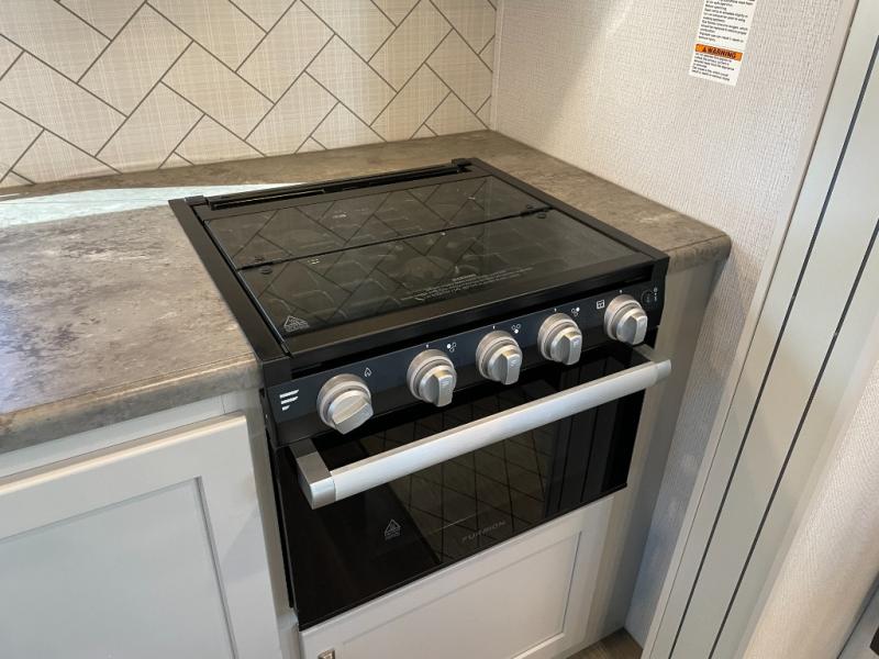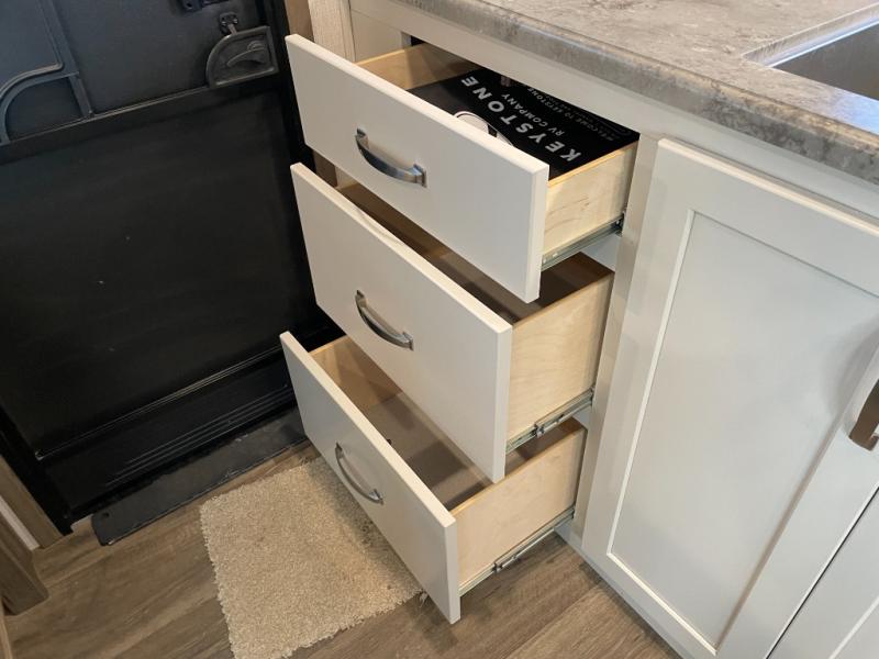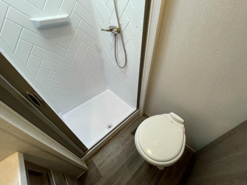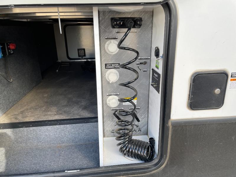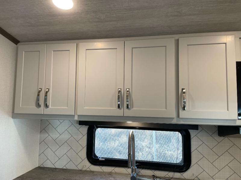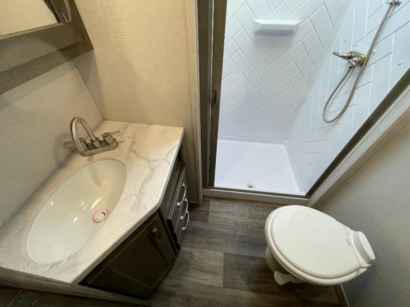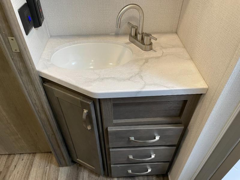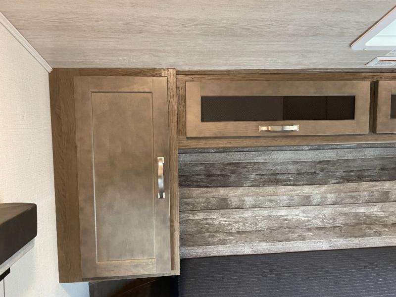 The Cougar Sport structural I-beam frame with stamped steel cross-members and outriggers, plus its laminated sidewalls with five-sided aluminum superstrucure and Alpha Super Flex roof membrane are what active RVers love about the construction of the Cougar line, and the Cougar Sport limited edition models are no exception when it comes to a great package, as well as being smaller and lighter weight than their big brother Cougar models. A one-piece, heated and enclosed polypropylene underbelly means a longer camping season. On the inside, residential shaker style hardwood cabinet doors and decorative crown molding, plus seamless pressed countertops and an on-demand water heater will make your unit feel even more like home. You are also sure to appreciate the Barnwood style decorative accent wall behind the bed, a porcelain foot flush toilet in the bathroom, plus residential kitchen hardware and so much more.