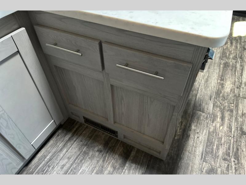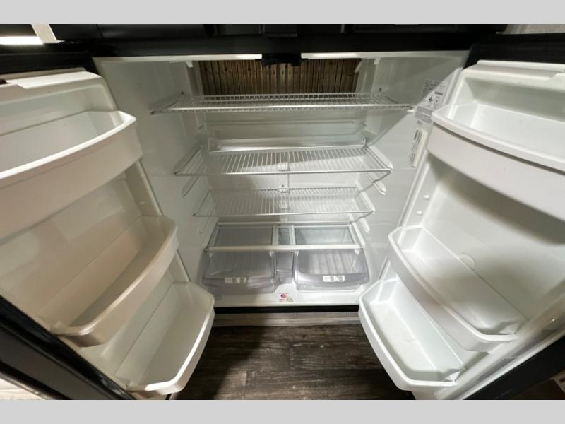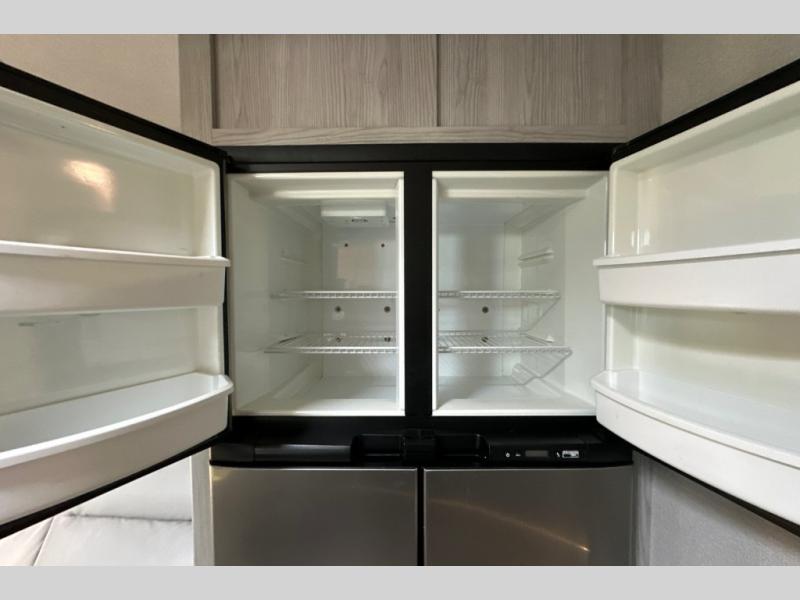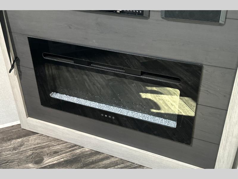 There is much to love about this toy hauler! From the front master closet with a washer and dryer prep area to the swing out stools in the kitchen and the dual opposing sofas with a queen bed above them in the 11' garage area. The garage also has a loft with a bunk mat, a LED TV with overhead cabinets, one of the dual entry doors, and a 8' MORryde zero gravity water resistant ramp door to load and unload your toys. Relax in true comfort on the residential sofa with heat, massage, LED lights, and 110V/USB outlets across from the swiveling entertainment center with a hidden pantry behind it, an LED TV, and a fireplace. The front private bedroom has a residential king bed slide to lay your head on at night as well as an LED TV above a dresser, and an entrance into the dual entry bathroom. The exterior has a refrigerator and TV prep area, two power awnings to protect you rain or shine, lighted pass-through storage area with an additional Fuzion front Stor/Mor box, and an outside shower located in the convenience center!