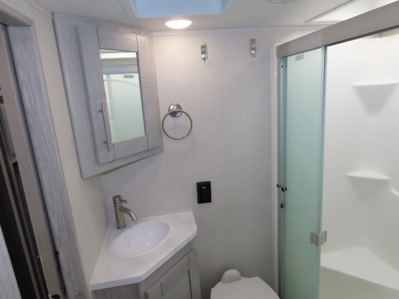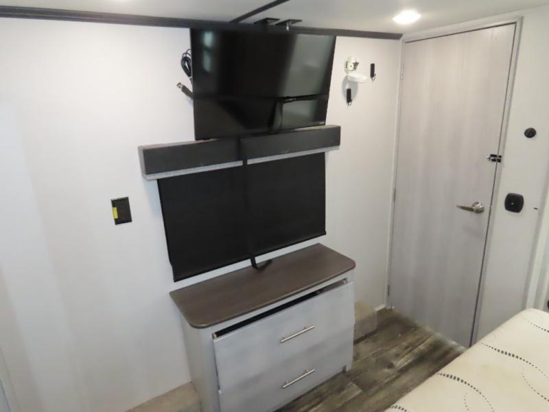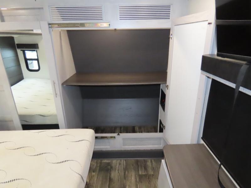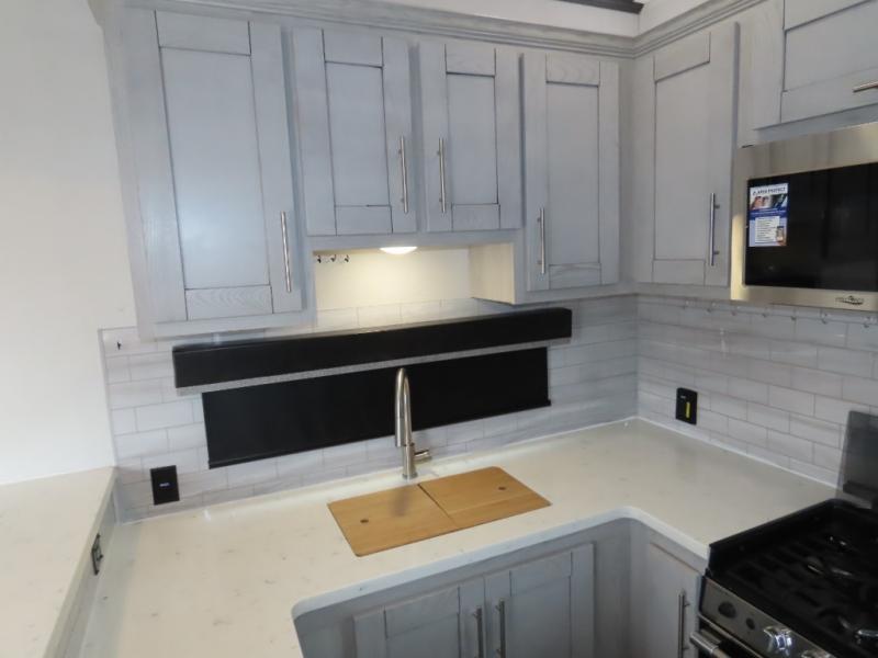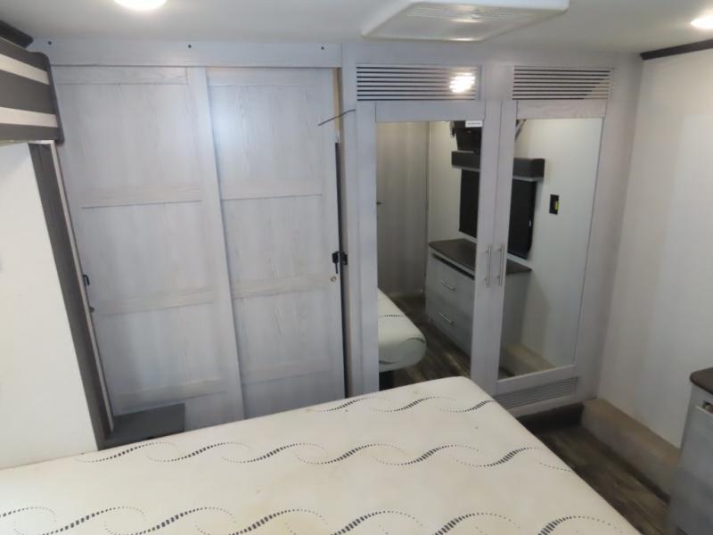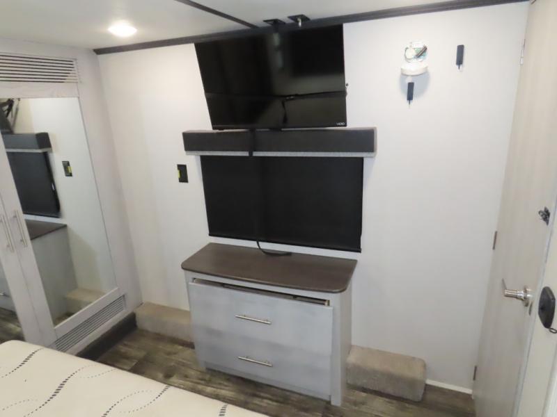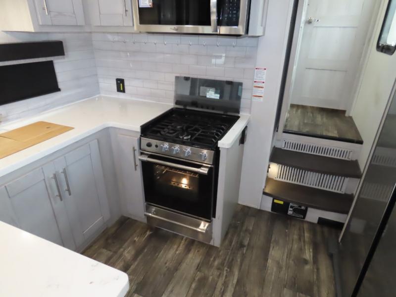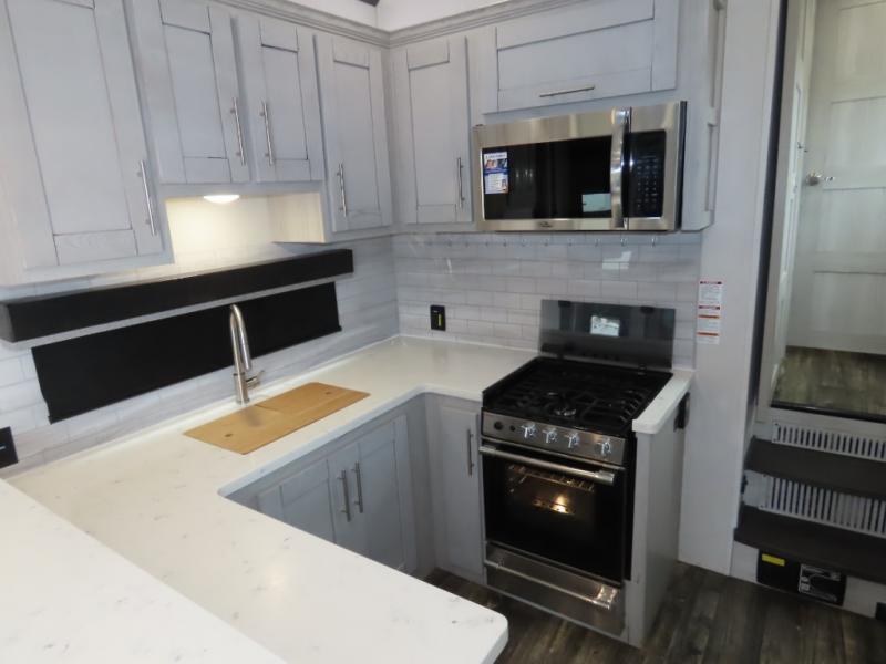 Enjoy a comfortable main living room with sofa and HDTV. Check out the U-shaped interior kitchen for lots of room to cook. You'll appreciate the residential stainless steel refrigerator as well as a microwave and three-burner glass top range with oven, plus convenient counter seating area with swivel bar stools. The single basin stainless steel sink has a high-rise faucet plus a bamboo sink cover. The garage features a pair of sofas which convert to sleep space, and there's an additional electric bed above. The garage also has its own half bath plus an additional HD TV on a pull-down bracket. The unit also has a full bath located near the front king bedroom for a private suite you will love!
