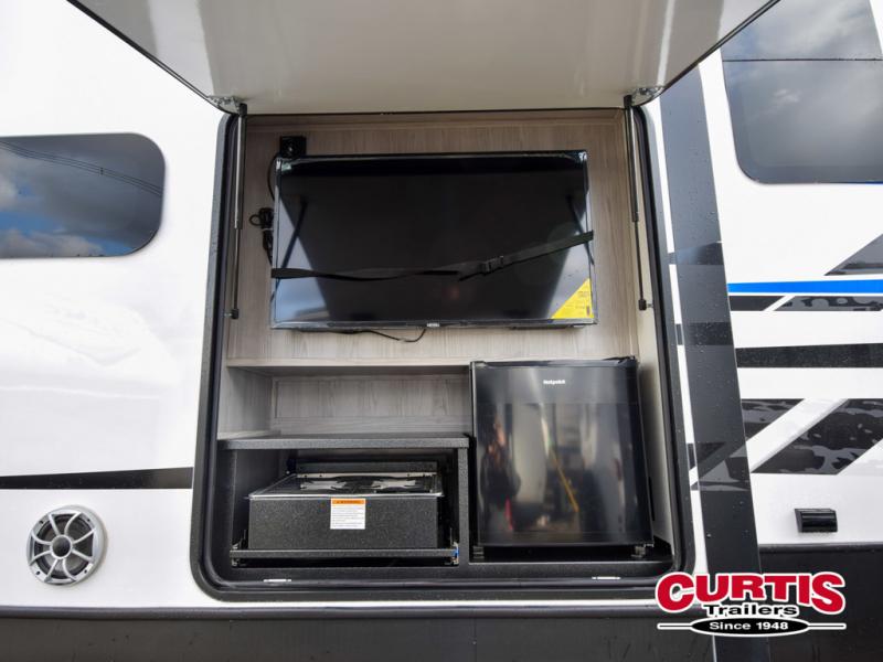 You will have everything you need and then some with this toy hauler! From the outdoor entertainment center with an LED TV and a refrigerator to the 14' 6" garage area with dual opposing sofas with a queen bed above them, an LED TV, and a loft with bunk mat. The garage also has a half bathroom, an Adjust-A-Track system with the tie downs welded to the frame, and a 8' MORryde zero gravity ramp door to easily load an unload your toys. The center table has swing-out stools to enjoy your morning coffee before freshening up in the dual entry bathroom with a residential shower with a seat. The bathroom even leads directly into the front private bedroom which has a residential king bed slide, a dresser with an LED TV, and a front master closet that is prepped to add an optional washer and dryer. A few other features you will appreciate include dual entry doors to the unit, a front exterior Fuzion front stor/more box, a rear exterior Fuzion utility storage, and dual 30 gallon fuel tanks for your toys!