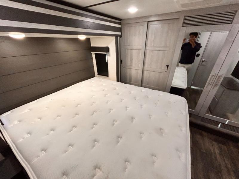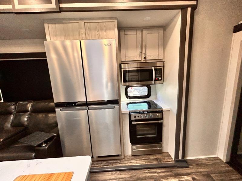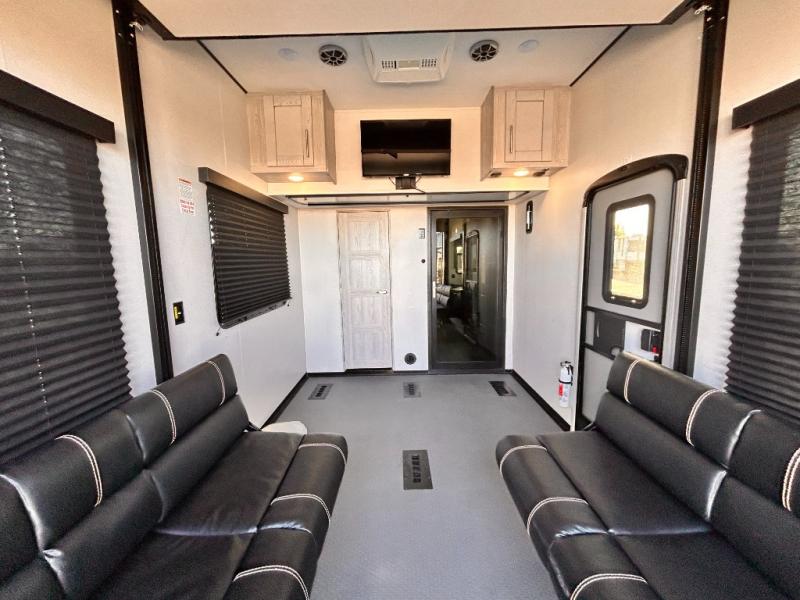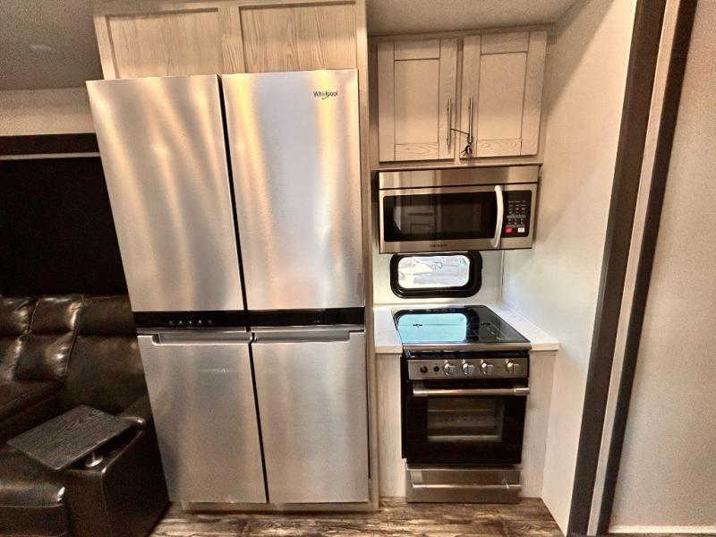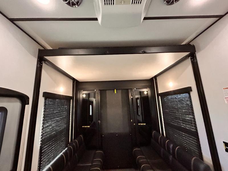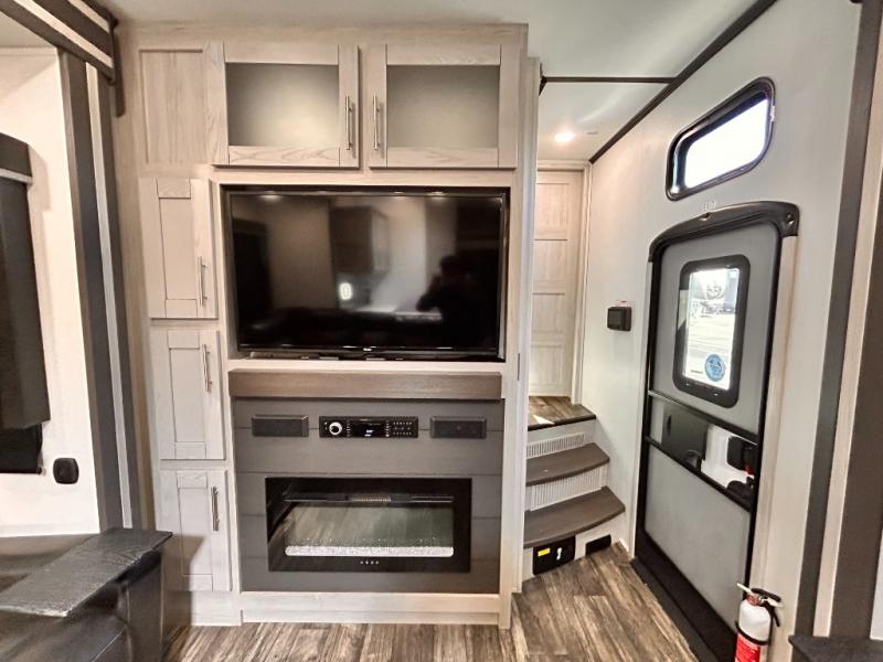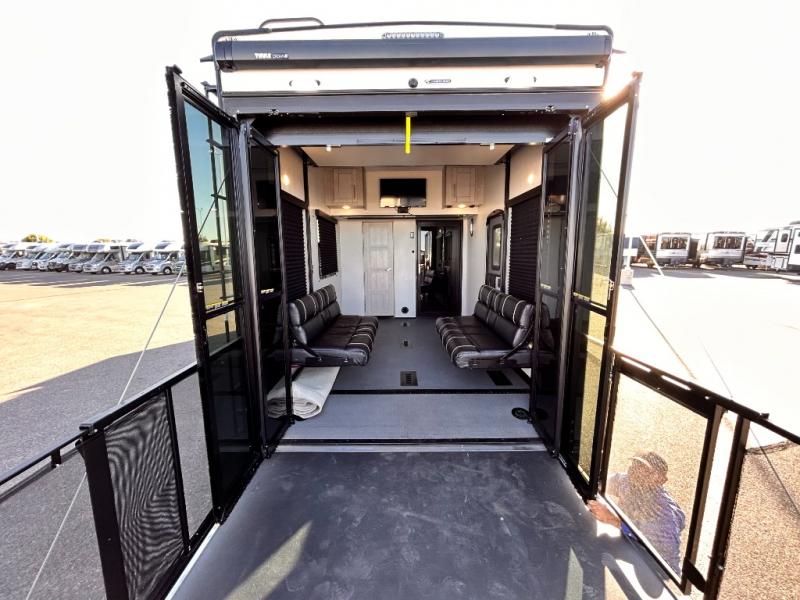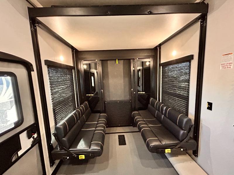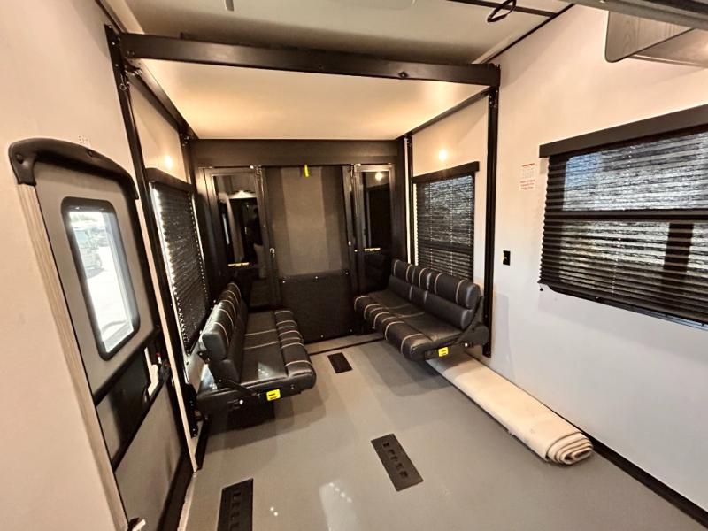 It's a clean decision to take this toy hauler on your next adventure with two full bathrooms! Everyone will have a comfortable place to lay their head at night between the residential king bed in the front private bedroom and in the 13' garage area there are dual opposing sofas with a queen bed above them and a loft with a bunk mat. The chef can prepare their best meals in the kitchen with the three burner cooktop and if you chose the to add the optional dinette slide in place of the sofa then you can enjoy your meals there and play a card game afterwards. The L-shaped sofa and two-person sofa offer a comfortable place to watch your favorite movies on the LED TV with fireplace below. There is plenty of storage throughout the inside between the front master closet and overhead cabinets, as well as the exterior with the rear Fuzion utility storage and the front Fuzion stor/mor box!