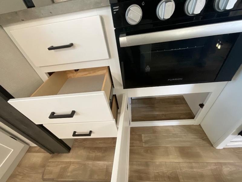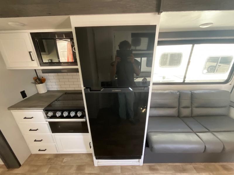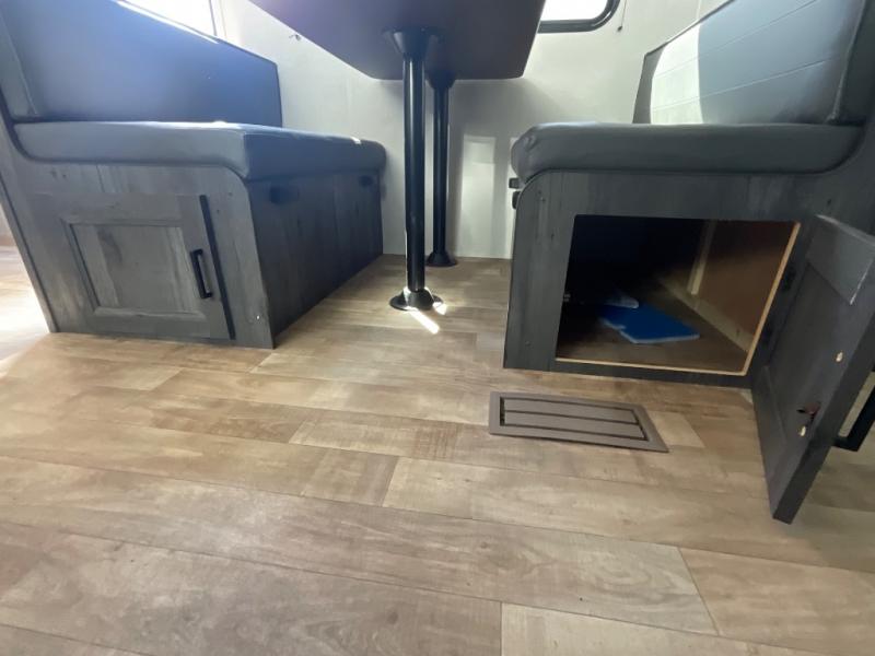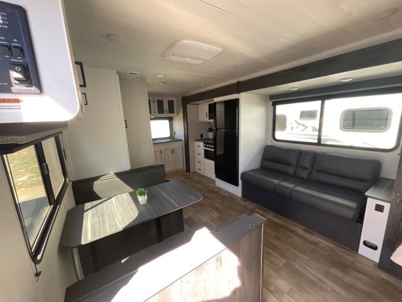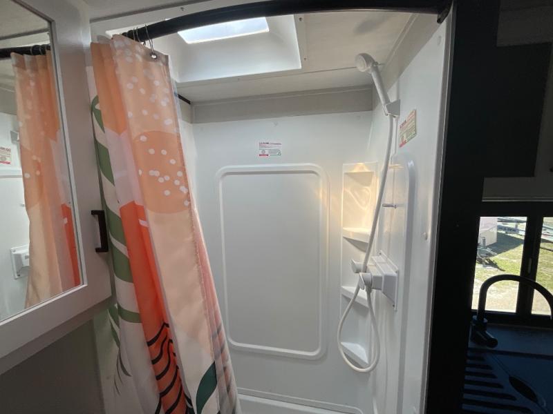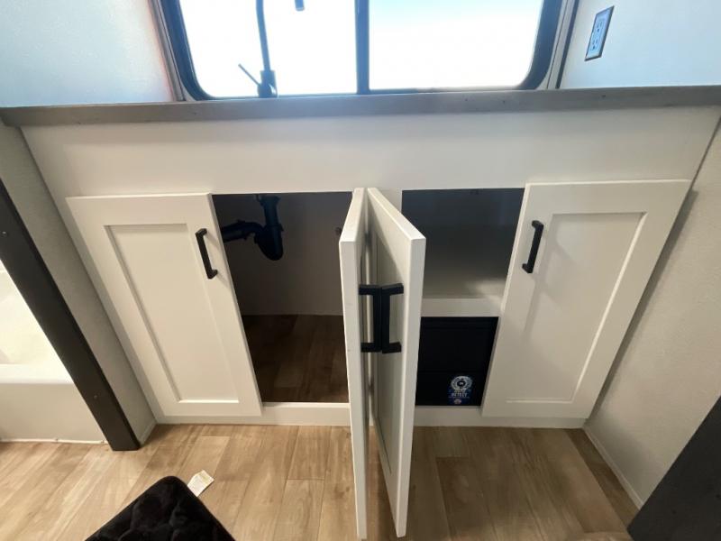 You'll love the added interior space this model has to offer thanks to the large slide out in the main living area. Here, you'll find the jackknife sofa, the three burner gas range, and the 12V refrigerator. If you're needing a different seating space, just trade out the jackknife sofa for the optional theater seat! There is a large countertop in the back of this unit that houses the stainless steel sink, and the rear corner bath includes a 38" walk-in shower for convenience. You will love having your own space up front in the semi-private bedroom that includes a queen bed, dual closets and nightstands, plus a privacy curtain. There is even a laundry chute so you can throw dirty clothes straight to the pass-through storage!