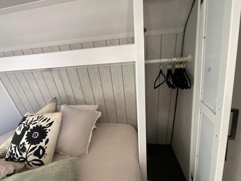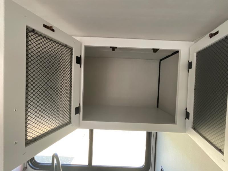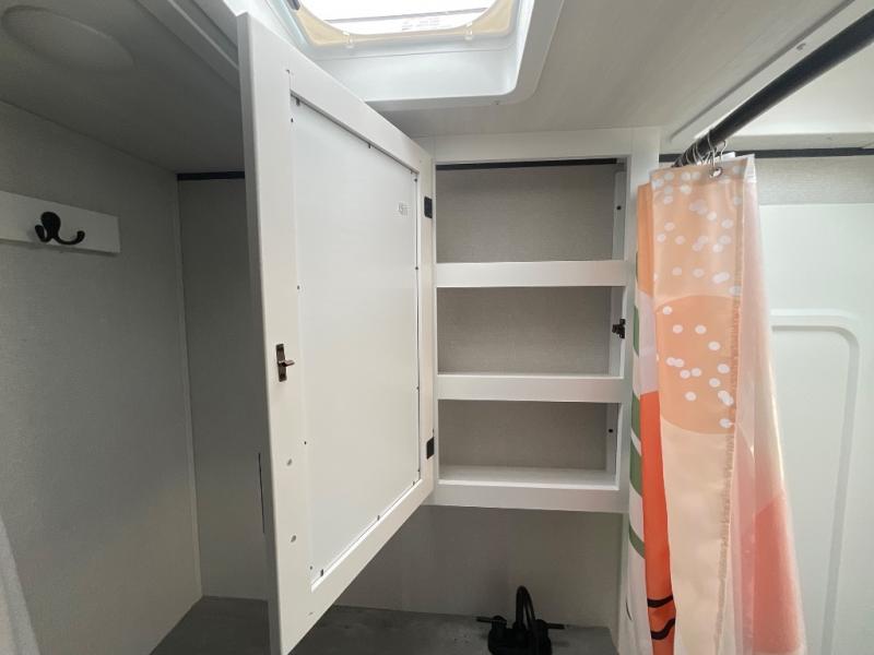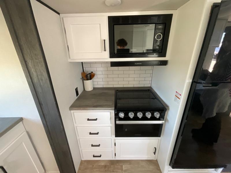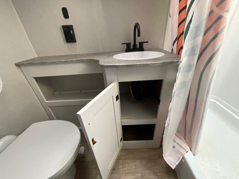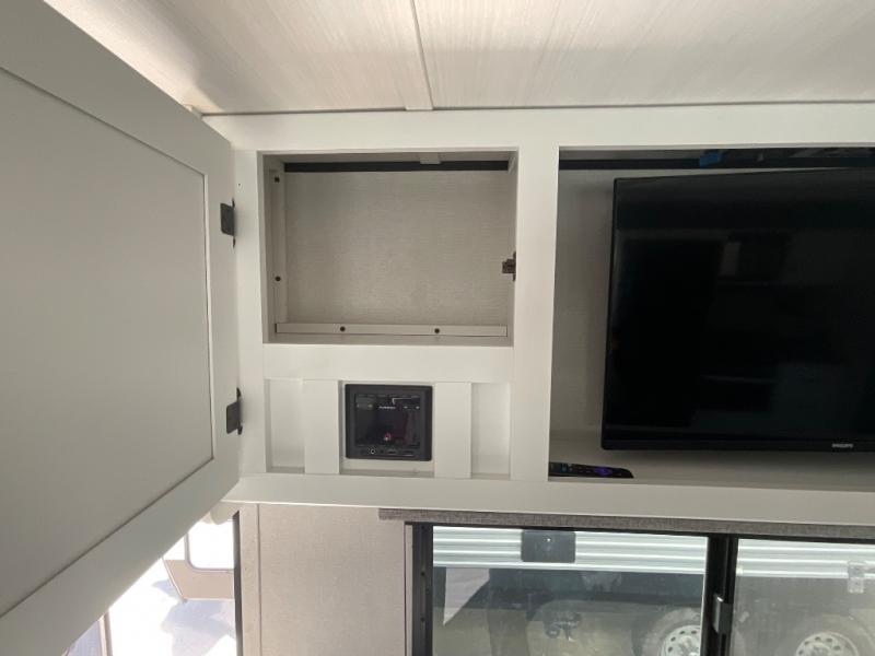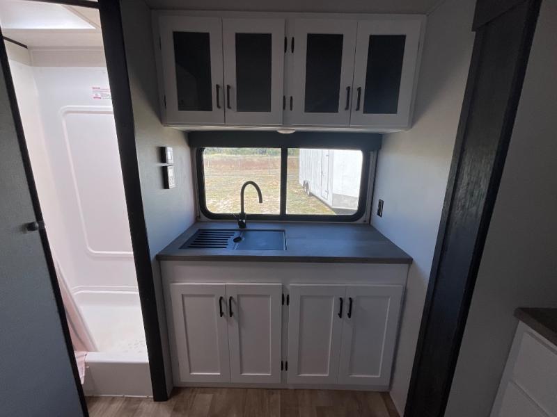 You'll love the added interior space this model has to offer thanks to the large slide out in the main living area. Here, you'll find the jackknife sofa, the three burner gas range, and the 12V refrigerator. If you're needing a different seating space, just trade out the jackknife sofa for the optional theater seat! There is a large countertop in the back of this unit that houses the stainless steel sink, and the rear corner bath includes a 38" walk-in shower for convenience. You will love having your own space up front in the semi-private bedroom that includes a queen bed, dual closets and nightstands, plus a privacy curtain. There is even a laundry chute so you can throw dirty clothes straight to the pass-through storage!
