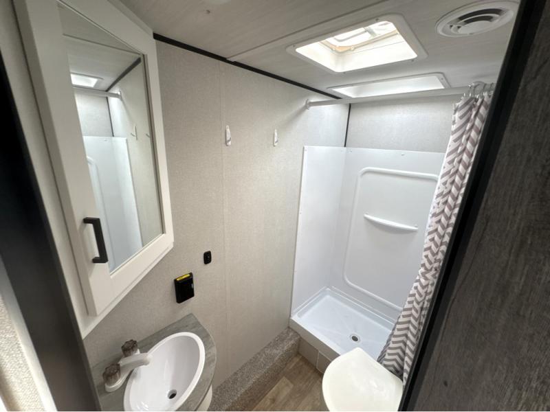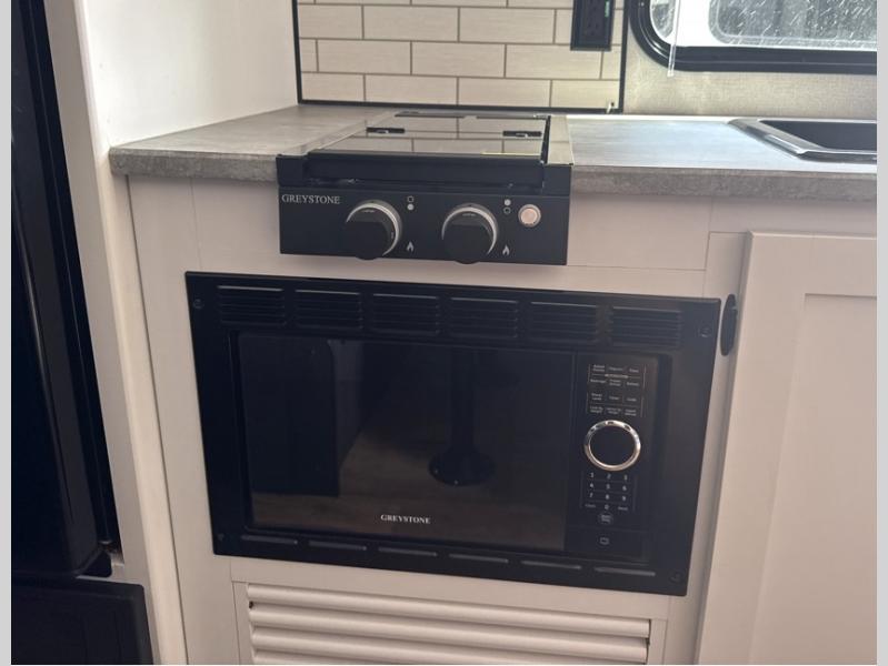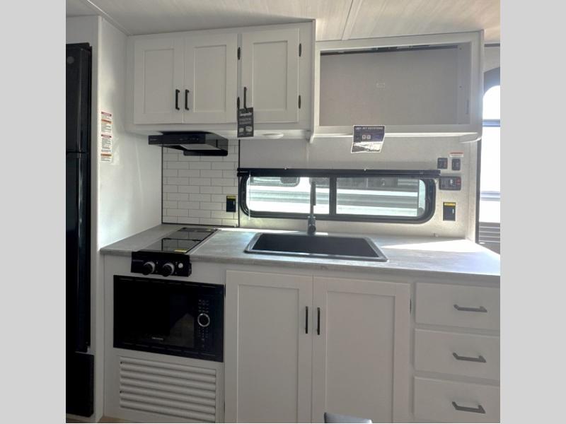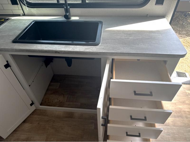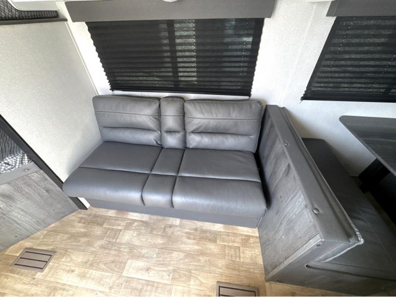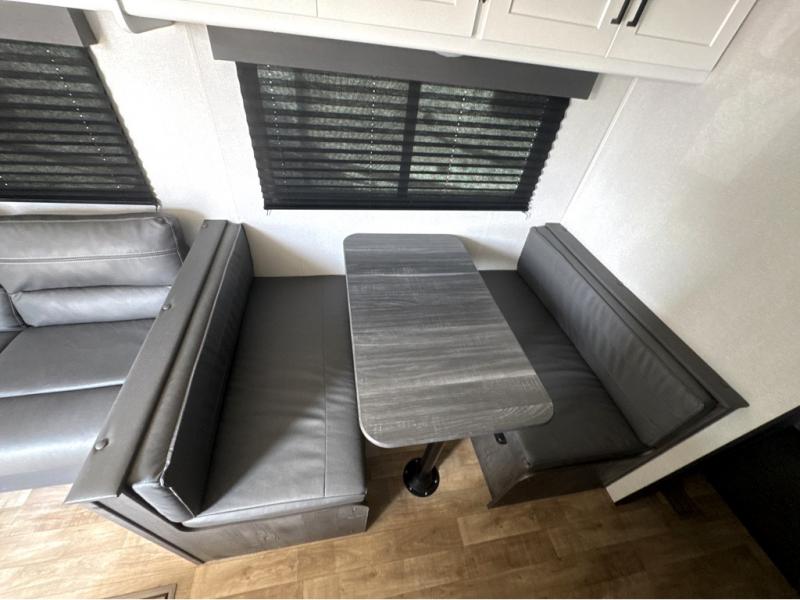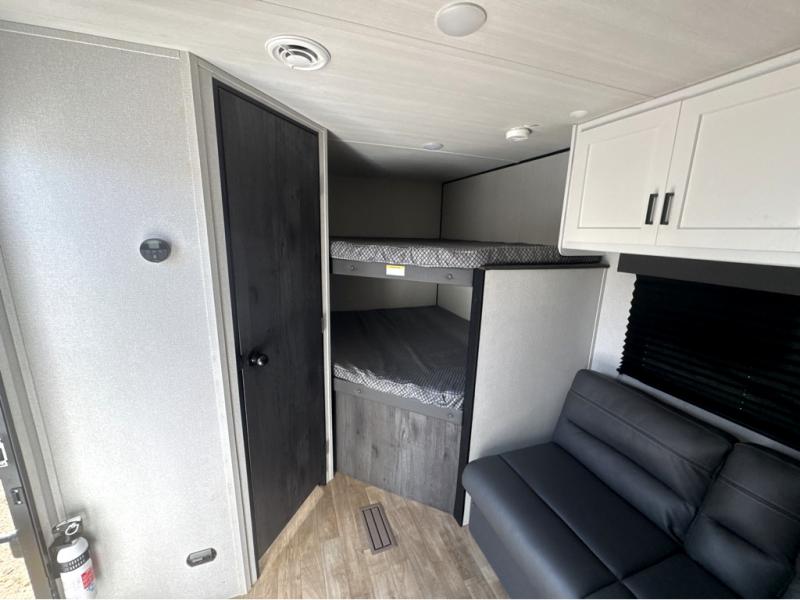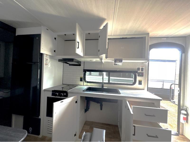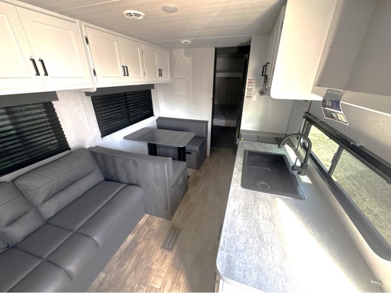 If you're looking for a travel trailer with a little more sleeping space, look no further than this Hideout Sport! There are double-size bunks with inside and outside storage, a walk-around queen bed in the front bedroom, plus a sofa and booth dinette for even more sleeping space. The kitchen comes with a two burner cooktop to cook meals on, a sink for clean up, and a 10 cu. ft. 12V refrigerator to store the milk and eggs. You will also find TV prep in this model if you enjoy movie nights while at the campground.