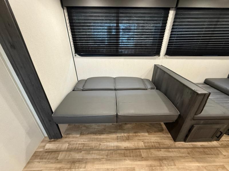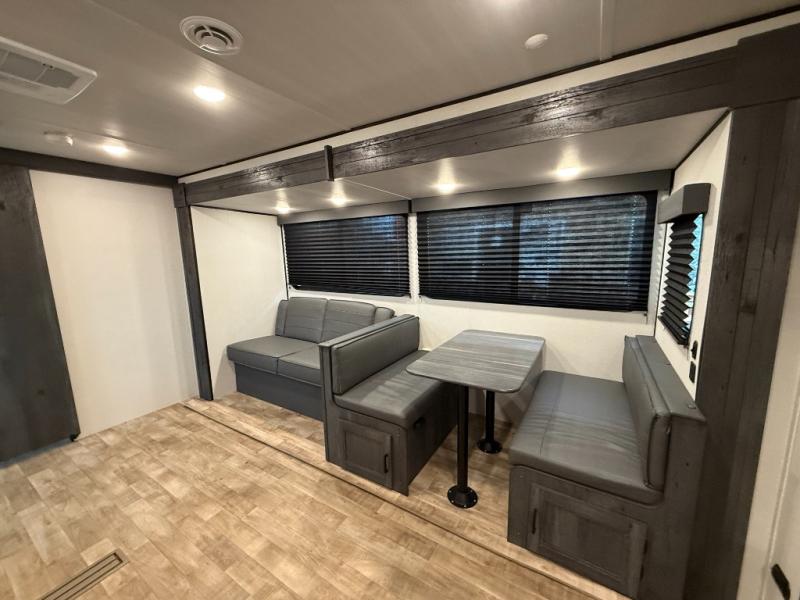 Slide-out increases living space with booth dinette and jackknife sofa.