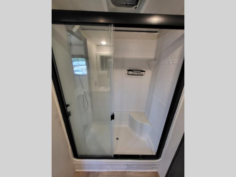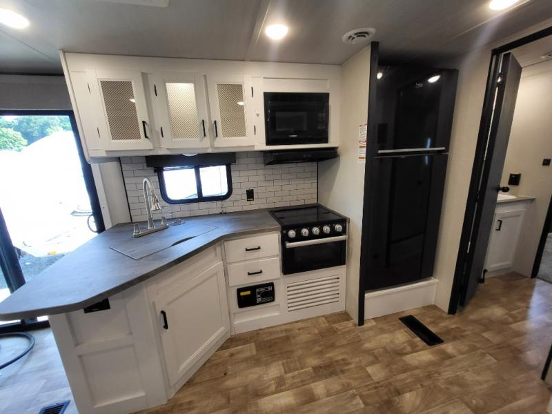 You will enjoy the front living area on this Hideout destination trailer because it has an L-shaped tri-fold sleeper sofa with an end table and an entertainment center with a fireplace, so you will be super cozy as you spend time relaxing or reading a book. The patio door is right next to this area, so you can look out at the beautiful scenery while you're lounging, and you can also add an optional tri-fold sleeper sofa to create even more lounge space. The residential refrigerator will help you stock up on food for the trip, and the 38" walk-in shower in the walk-through bathroom will allow you to get cleaned up after an early morning run.