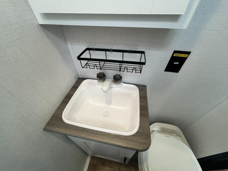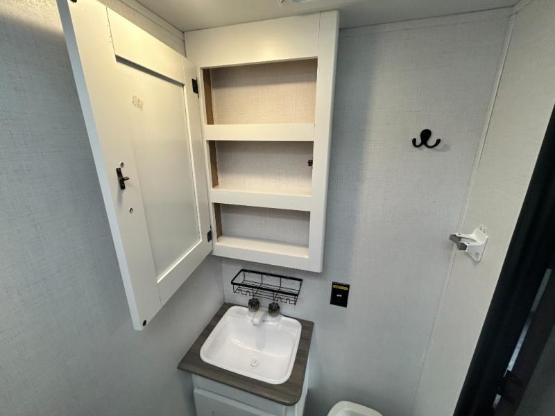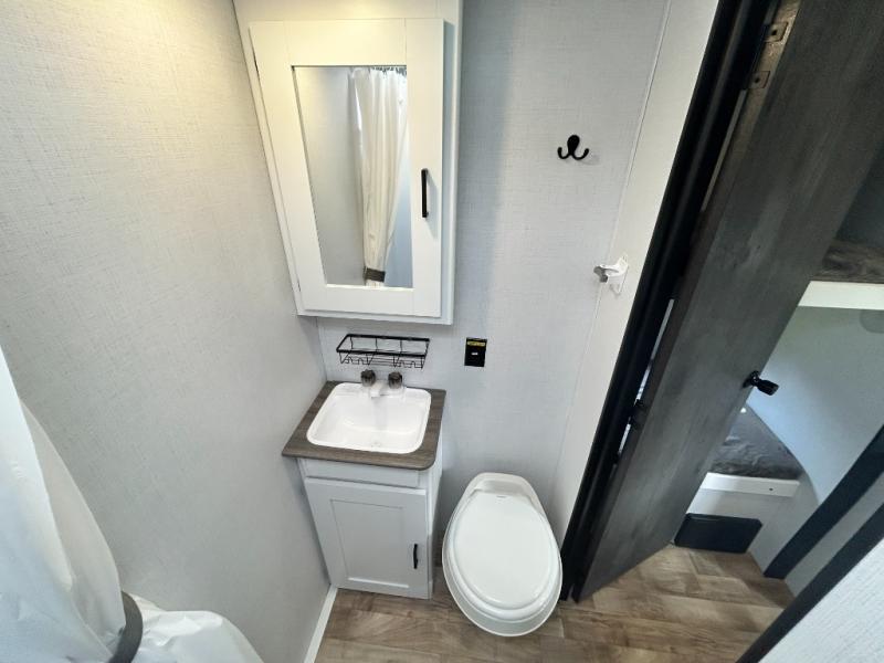 This trailer will fit perfectly for a group of five or less thanks to all the sleeping space! The owners will have a queen-size bed, and others can choose between the rear corner bunk beds or the booth dinette once setup for bedtime. There is a full bathroom for convenience when changing and getting cleaned up, a galley kitchen with a two burner gas range and microwave to make warm meals, plus a 7.7 cu. ft. refrigerator for the cold items. And you can stow your larger camping items in the exterior pass-through compartment.