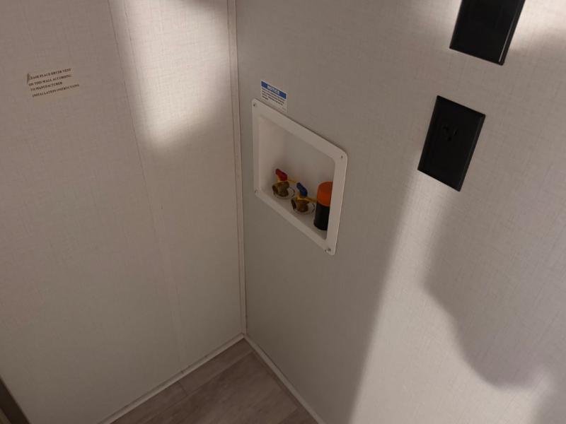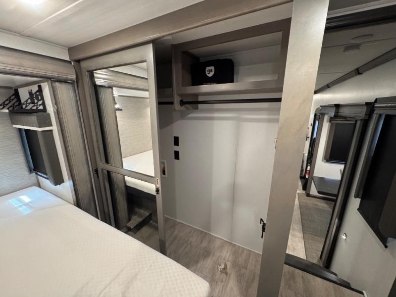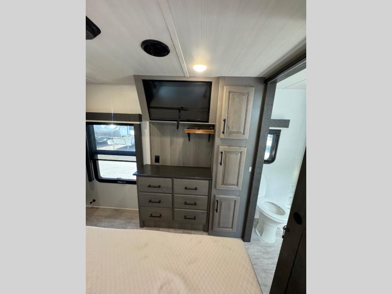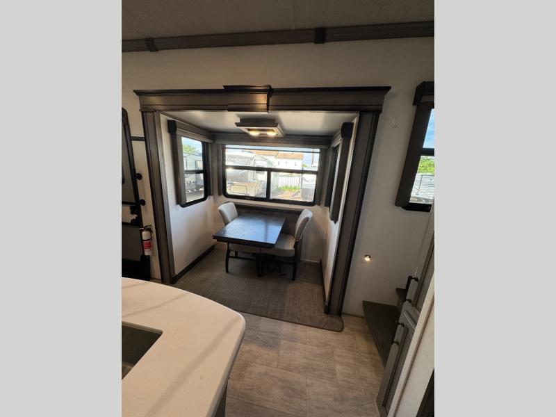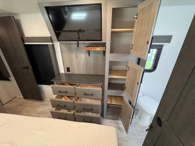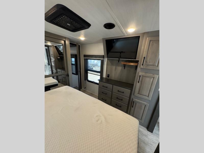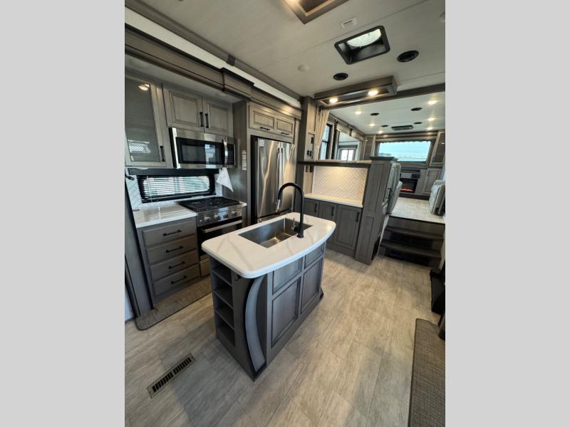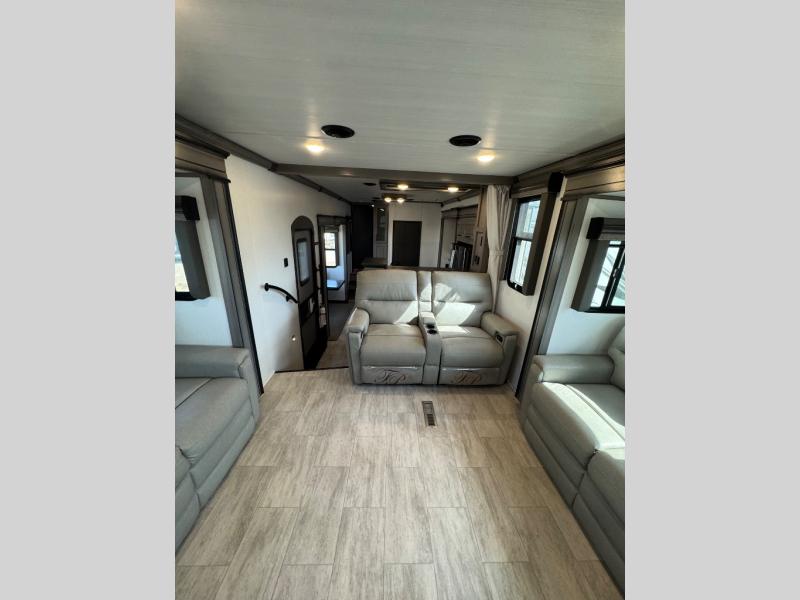 Life will be easier at the campground in this fifth wheel with a bath and a half! The full rear bathroom has a 48" x 30" fiberglass shower with a seat and skylight above, a linen closet to keep your towels close, a dual sink vanity for two to get ready at once, and a barn door to close off the master suite. The bedroom also has a king bed slide with storage underneath across from a dresser with a 32" Smart TV and wardrobe, as well as a large closet that is prepped to add an optional washer and dryer. The chef can prepare their best meals with the kitchen island, the glass top range with convection microwave and range hood with a pull-down spice rack, plus there is a pantry/buffet and a free standing legless dinette to enjoy your meals at. The front living area will have you feeling right at home with the front entertainment center that has a telescoping 50" Smart TV, a 5,000 BTU decorative fireplace heater, and storage on either side. There is also opposing hide-a-bed sofa slides for extra sleeping spaces and power Thomas Payne theater seating for even more comfort!