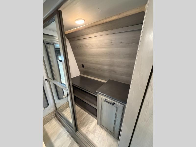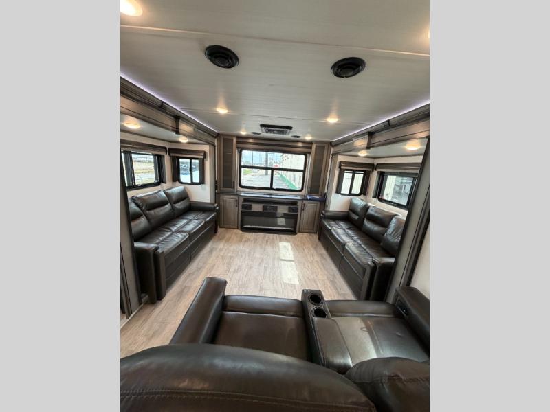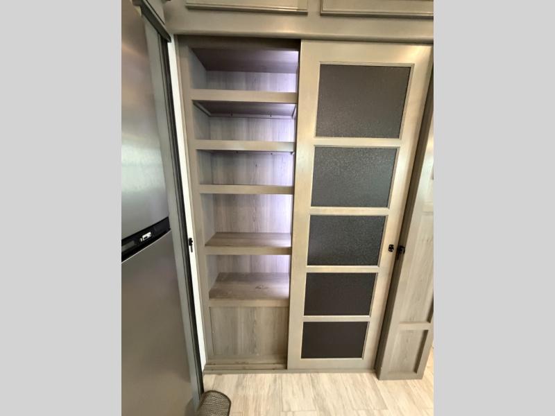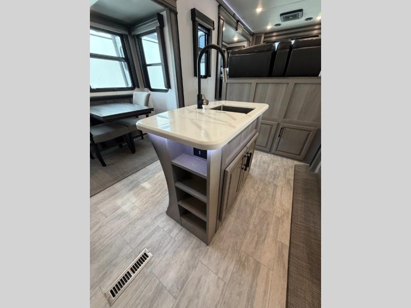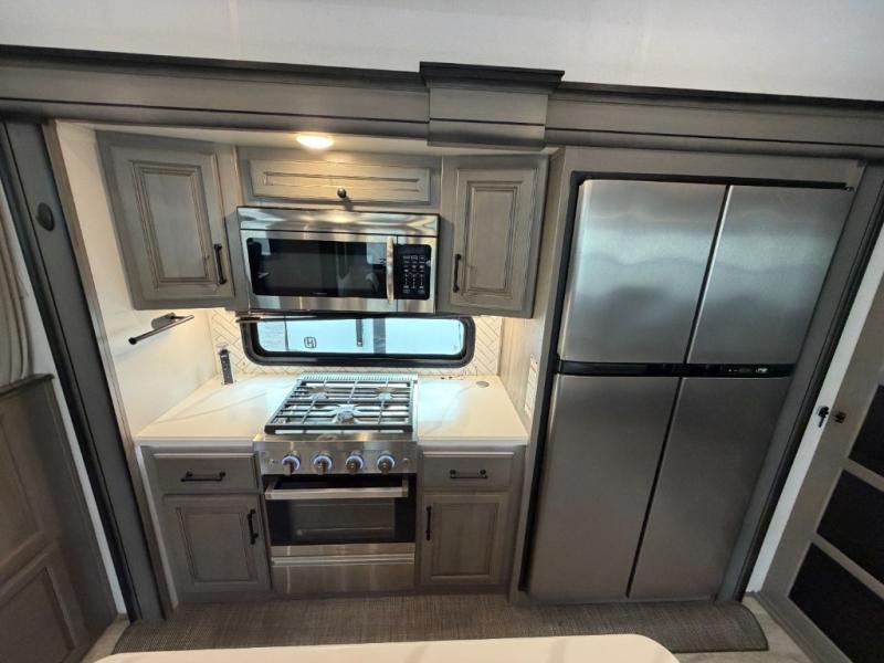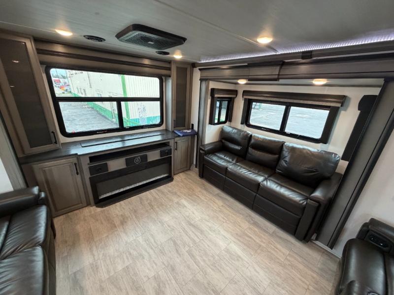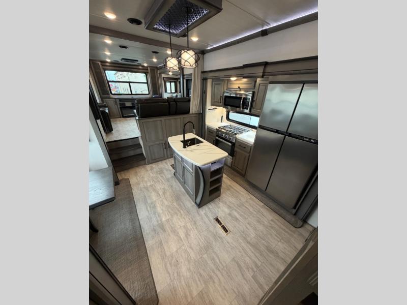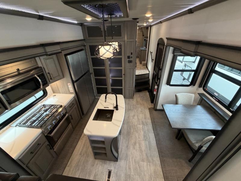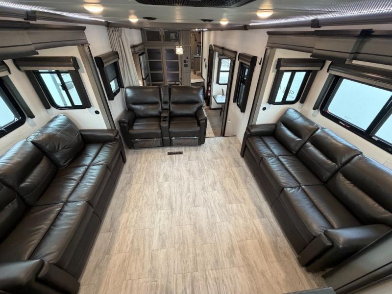 Family and friends will definitely want to join you in this spacious fifth wheel featuring five slides plus a separate double slide living area, double slide kitchen with an island, and private front bedroom with king bed. You can easily enjoy any stay with this amount of space and comfort. Head inside using the MORryde solid entry steps with strut assist and find yourself in a spacious center kitchen featuring a free standing dinette with storage. You will find loads of space for your dishes and things between the floor cabinets, overhead storage, and sliding glass door entry into the floor to ceiling pantry. An 18 cu. ft. residential refrigerator with an ice maker will keep all of your perishables fresh, and meals will be simple using the 24" range and convection microwave oven. A full bath including a 48" x 30" shower with seat is just what you will need to get refreshed each morning and night and the king bed found in the private bedroom up front will get you the best night's sleep. The bedroom offers plenty of storage which includes under the bed storage for larger items and extra blankets, plus a dresser and closets as well. Add an optional stackable washer/dryer if you like for those extended vacations since the prep work has already been done. In the rear of this unit, a full step-up living area includes a fireplace, two hide-a-bed sofas and power theater seating which is perfect for the whole gang to relax together after an adventurous day outside. This space also allows additional sleeping space for four!