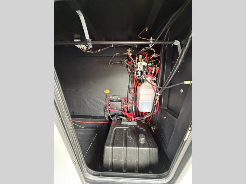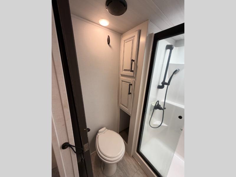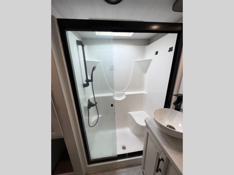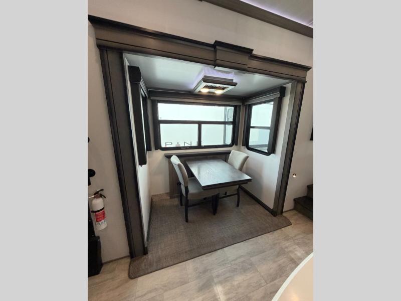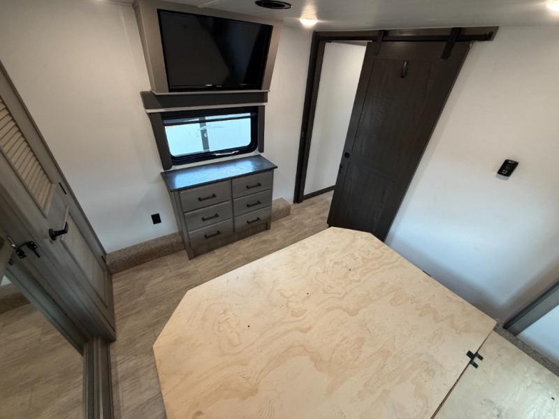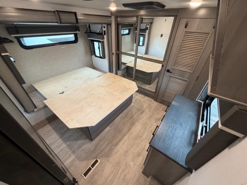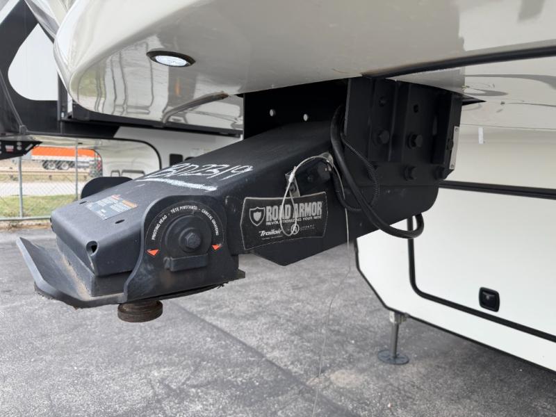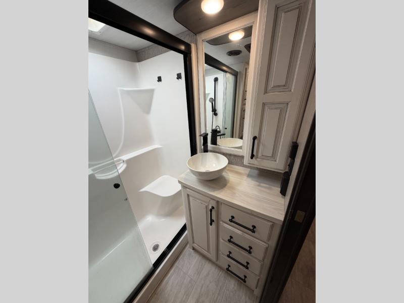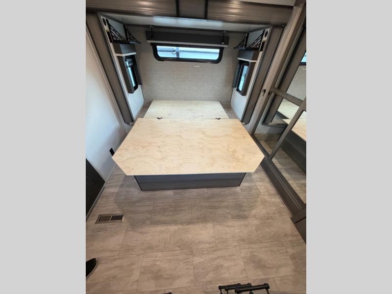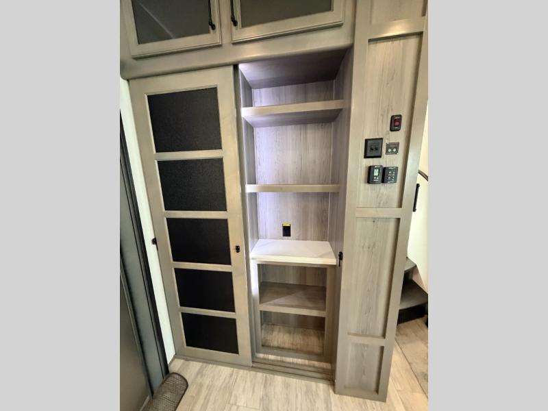 Family and friends will definitely want to join you in this spacious fifth wheel featuring five slides plus a separate double slide living area, double slide kitchen with an island, and private front bedroom with king bed. You can easily enjoy any stay with this amount of space and comfort. Head inside using the MORryde solid entry steps with strut assist and find yourself in a spacious center kitchen featuring a free standing dinette with storage. You will find loads of space for your dishes and things between the floor cabinets, overhead storage, and sliding glass door entry into the floor to ceiling pantry. An 18 cu. ft. residential refrigerator with an ice maker will keep all of your perishables fresh, and meals will be simple using the 24" range and convection microwave oven. A full bath including a 48" x 30" shower with seat is just what you will need to get refreshed each morning and night and the king bed found in the private bedroom up front will get you the best night's sleep. The bedroom offers plenty of storage which includes under the bed storage for larger items and extra blankets, plus a dresser and closets as well. Add an optional stackable washer/dryer if you like for those extended vacations since the prep work has already been done. In the rear of this unit, a full step-up living area includes a fireplace, two hide-a-bed sofas and power theater seating which is perfect for the whole gang to relax together after an adventurous day outside. This space also allows additional sleeping space for four!