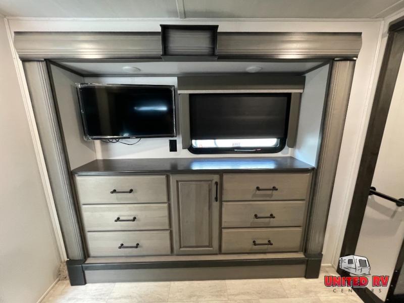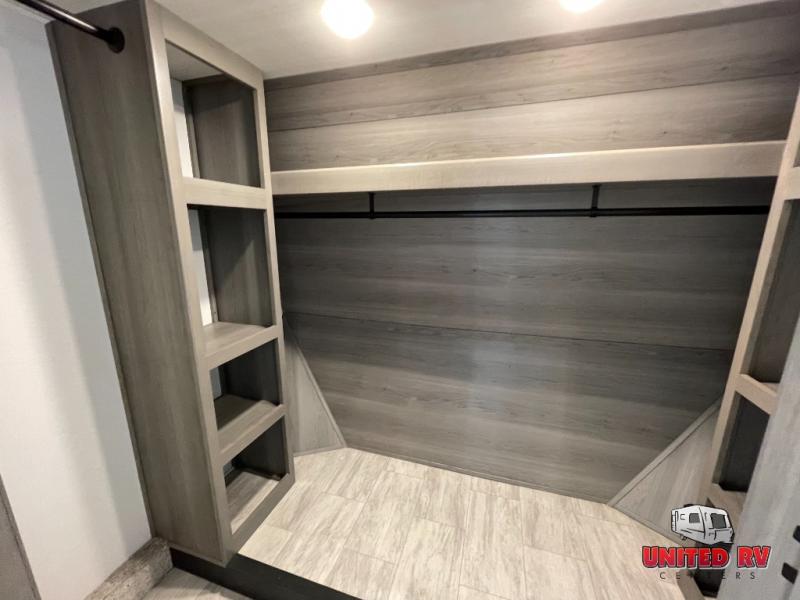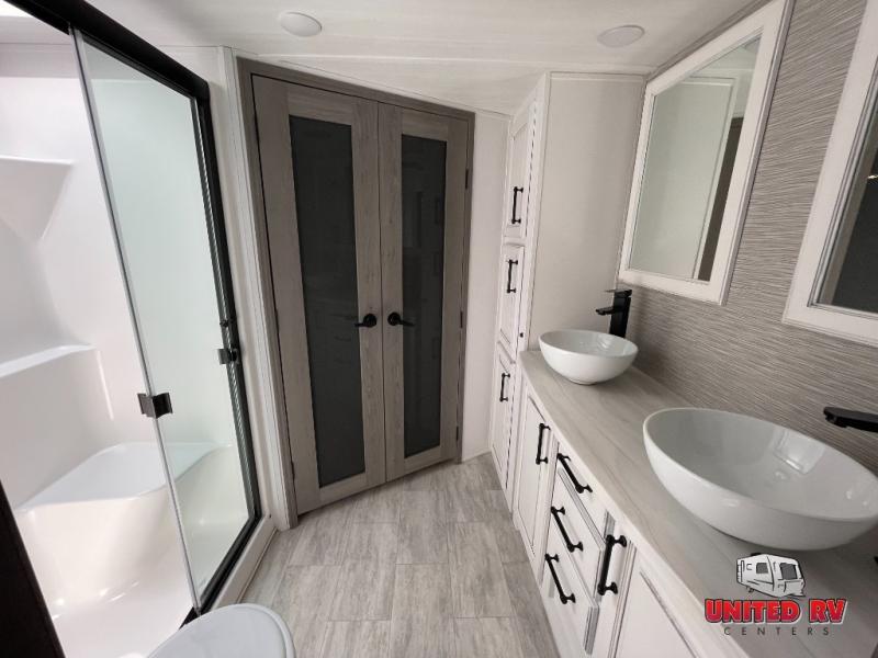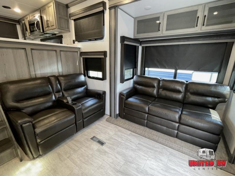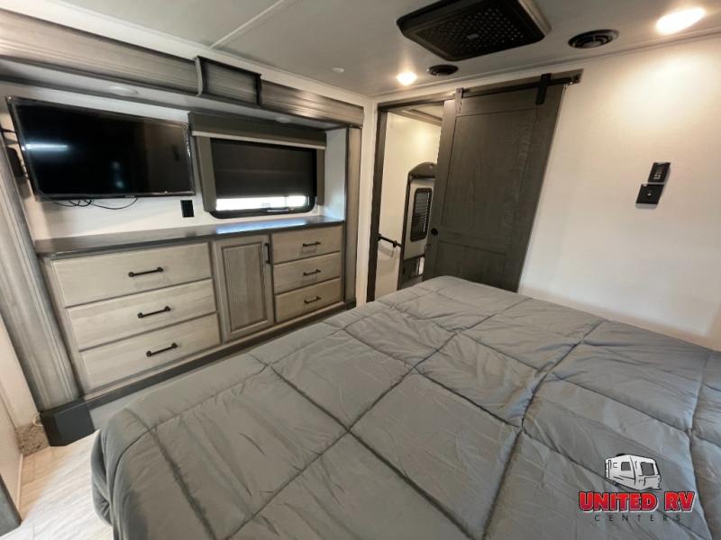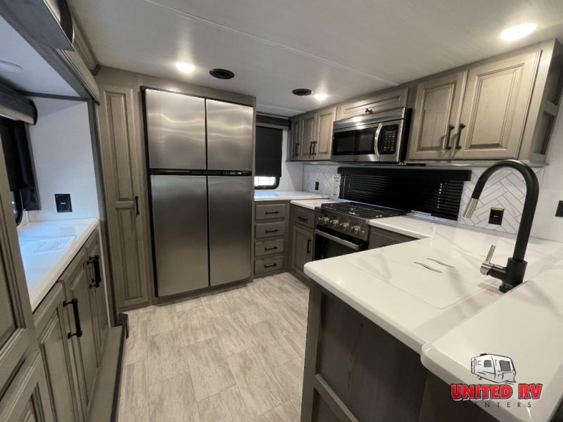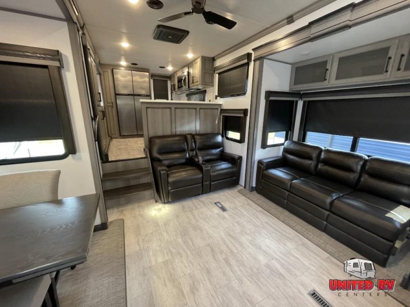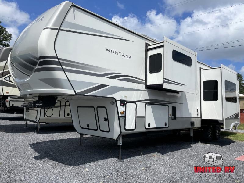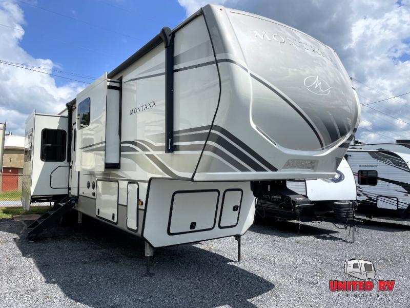 The perfect RV when you like to take "home"' with you when you travel! This Montana fifth wheel gives you the space you want and it feels like home with plenty of features to love and keep you comfortable when you are out enjoying your adventures. Five slides in total give each space plenty of room, the raised rear kitchen has everything you need to cook up meals and snacks just like at home. An 18 cu. ft. residential refrigerator with ice maker, convection microwave oven, and large sink, plus pantry space will make any chef happy. The mid-coach space just inside the door features a living room and half bath for convenience. There is also a dining table and four chairs within the roadside slide. Step up in front through a sliding barn door to a double slide space with a king bed and dresser. The bed has a CPAP shelf on either side, and there is storage beneath the bed for extra blankets and pillows, plus more. A second sliding barn door leads into the front spacious master bath featuring dual sinks, a 48" x 30" shower, and a large walk-in wardrobe area that has been prepped for a washer and dryer if you choose to add.
