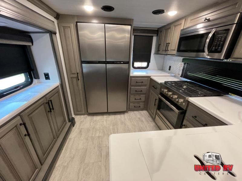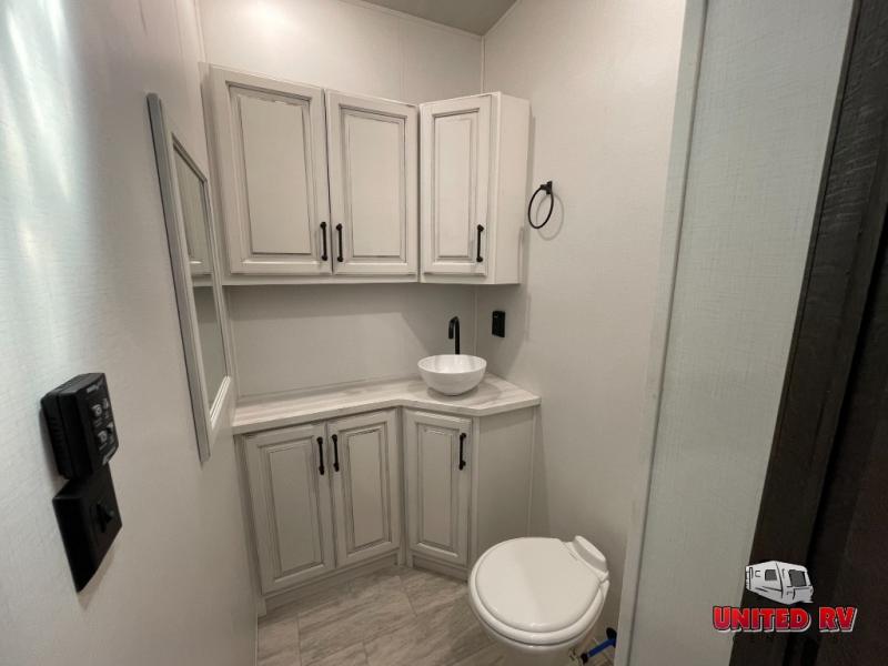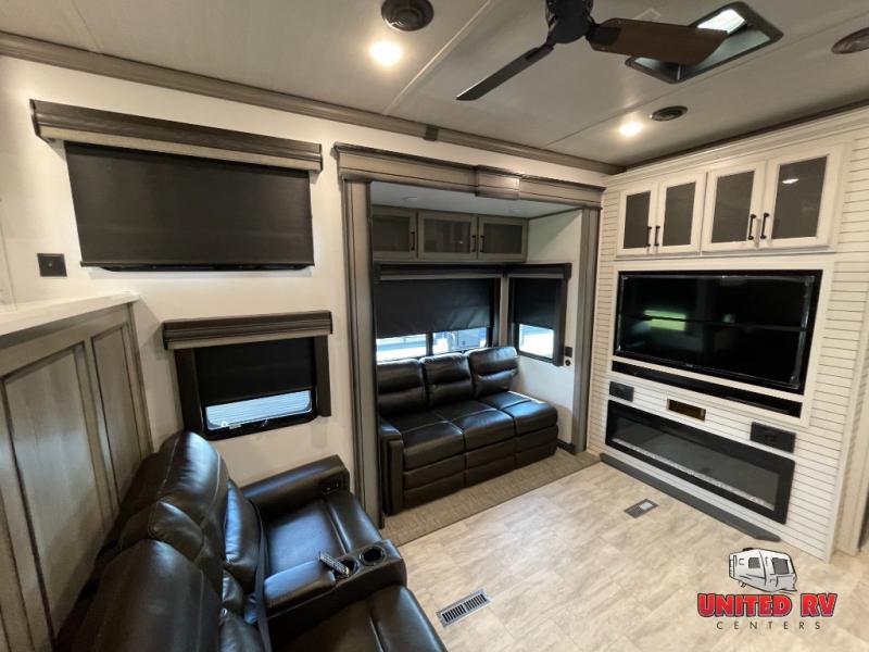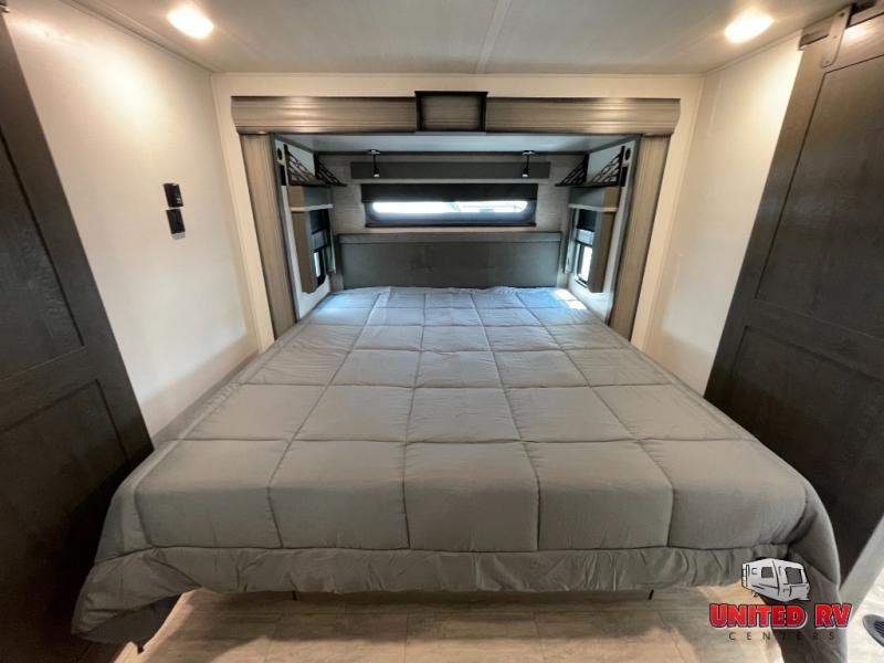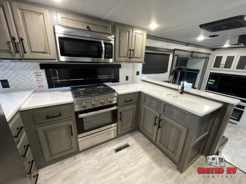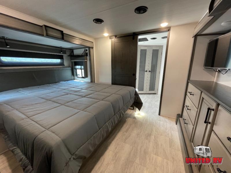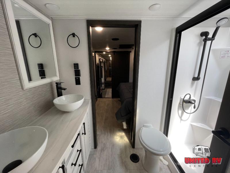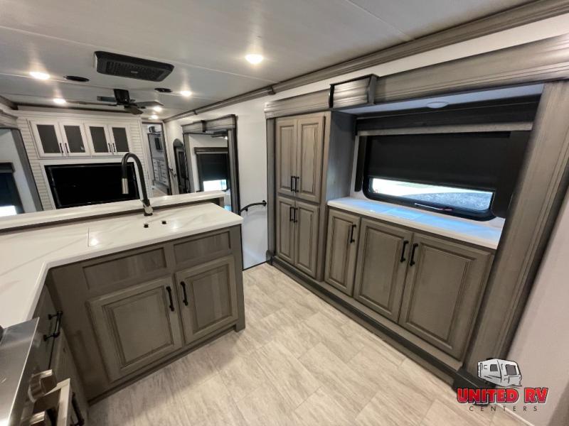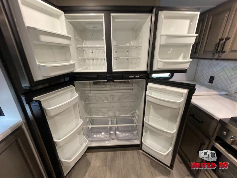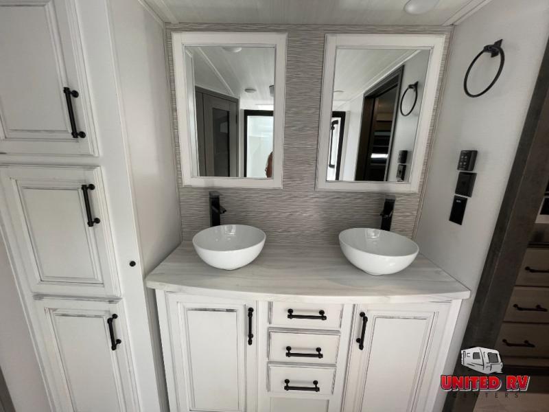 The perfect RV when you like to take "home"' with you when you travel! This Montana fifth wheel gives you the space you want and it feels like home with plenty of features to love and keep you comfortable when you are out enjoying your adventures. Five slides in total give each space plenty of room, the raised rear kitchen has everything you need to cook up meals and snacks just like at home. An 18 cu. ft. residential refrigerator with ice maker, convection microwave oven, and large sink, plus pantry space will make any chef happy. The mid-coach space just inside the door features a living room and half bath for convenience. There is also a dining table and four chairs within the roadside slide. Step up in front through a sliding barn door to a double slide space with a king bed and dresser. The bed has a CPAP shelf on either side, and there is storage beneath the bed for extra blankets and pillows, plus more. A second sliding barn door leads into the front spacious master bath featuring dual sinks, a 48" x 30" shower, and a large walk-in wardrobe area that has been prepped for a washer and dryer if you choose to add.