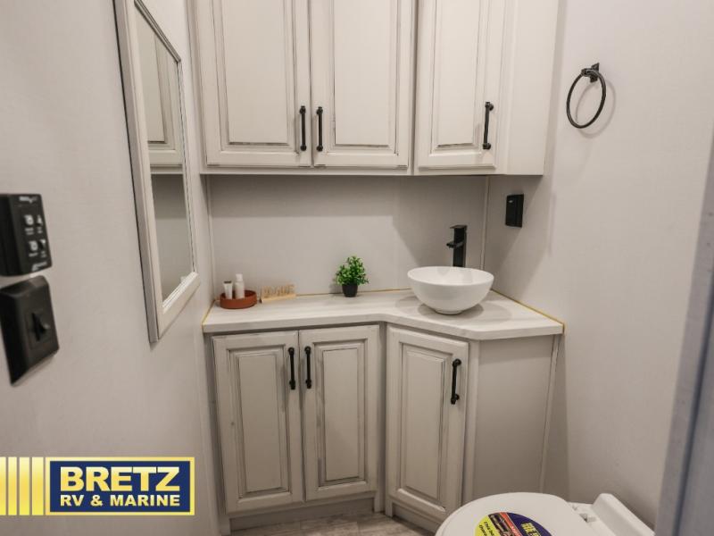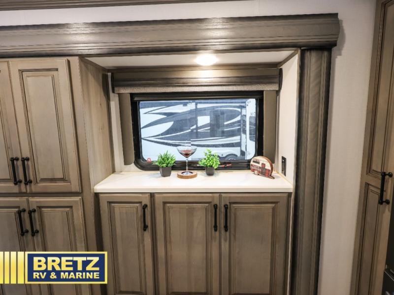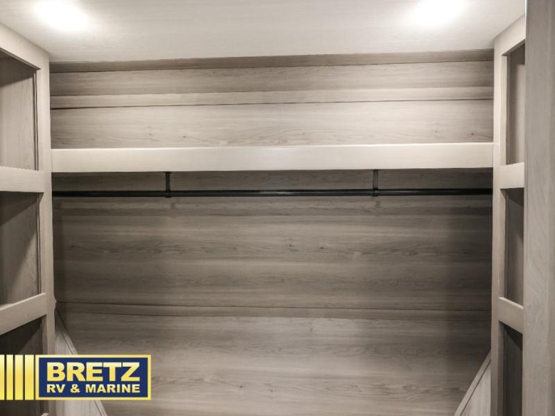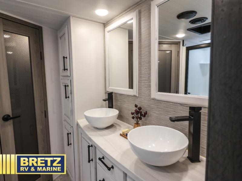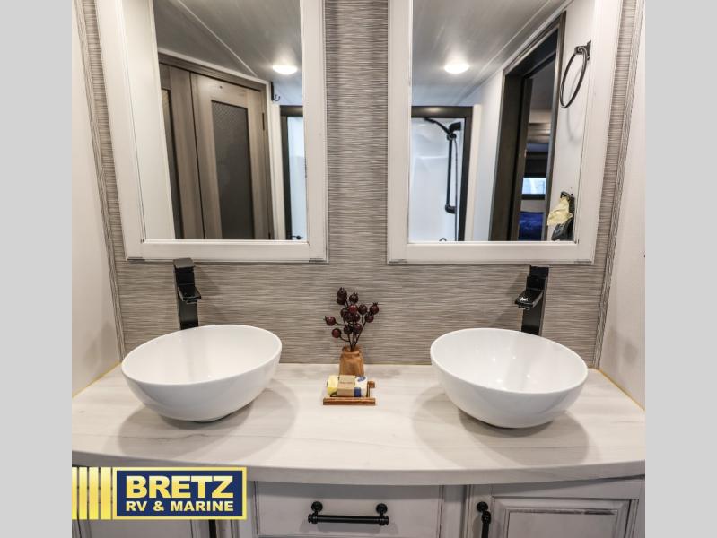 The perfect RV when you like to take "home"' with you when you travel! This Montana fifth wheel gives you the space you want and it feels like home with plenty of features to love and keep you comfortable when you are out enjoying your adventures. Five slides in total give each space plenty of room, the raised rear kitchen has everything you need to cook up meals and snacks just like at home. An 18 cu. ft. residential refrigerator with ice maker, convection microwave oven, and large sink, plus pantry space will make any chef happy. The mid-coach space just inside the door features a living room and half bath for convenience. There is also a dining table and four chairs within the roadside slide. Step up in front through a sliding barn door to a double slide space with a king bed and dresser. The bed has a CPAP shelf on either side, and there is storage beneath the bed for extra blankets and pillows, plus more. A second sliding barn door leads into the front spacious master bath featuring dual sinks, a 48" x 30" shower, and a large walk-in wardrobe area that has been prepped for a washer and dryer if you choose to add.