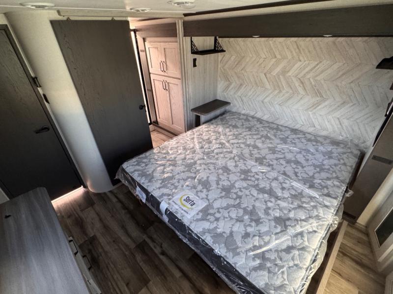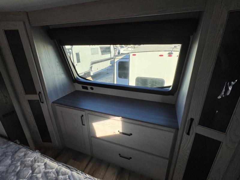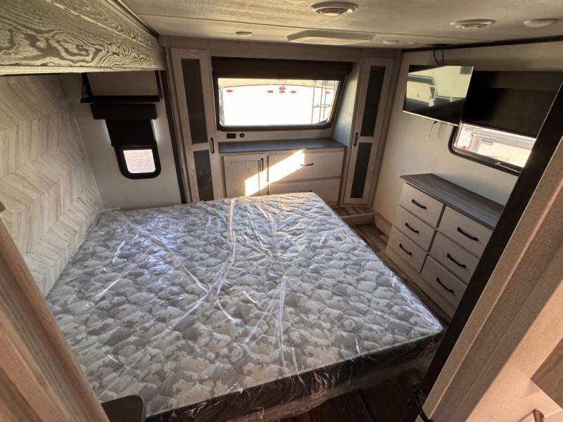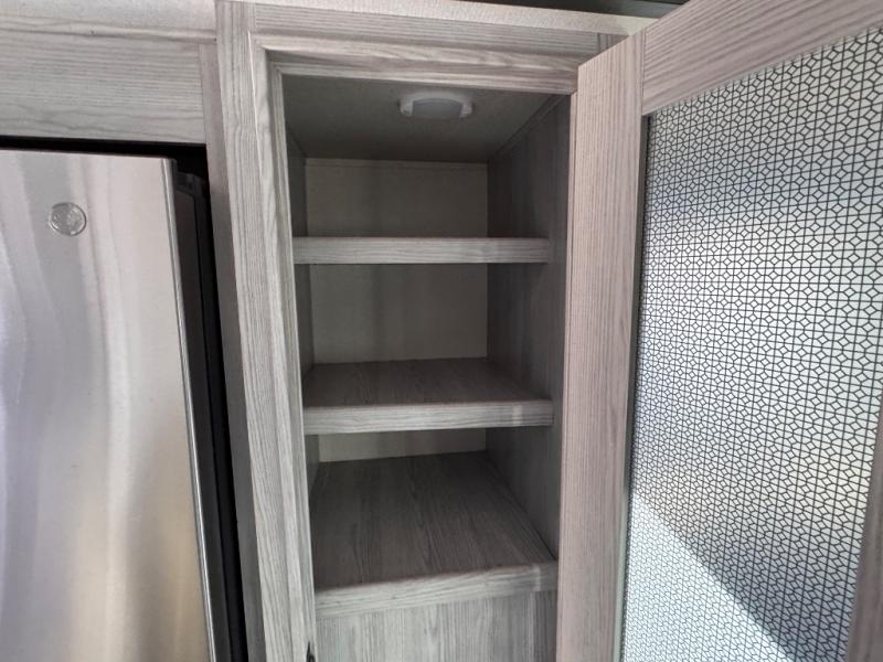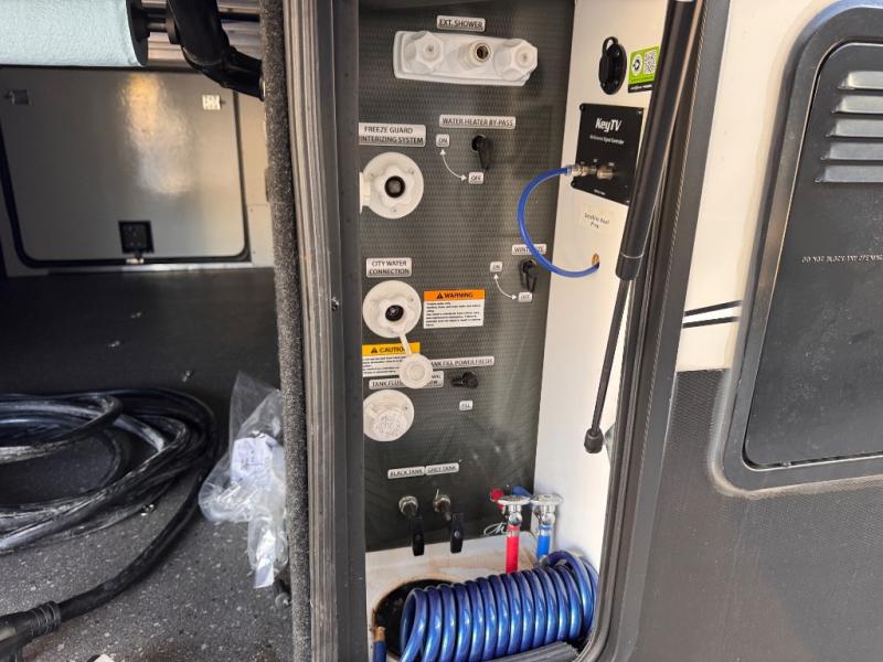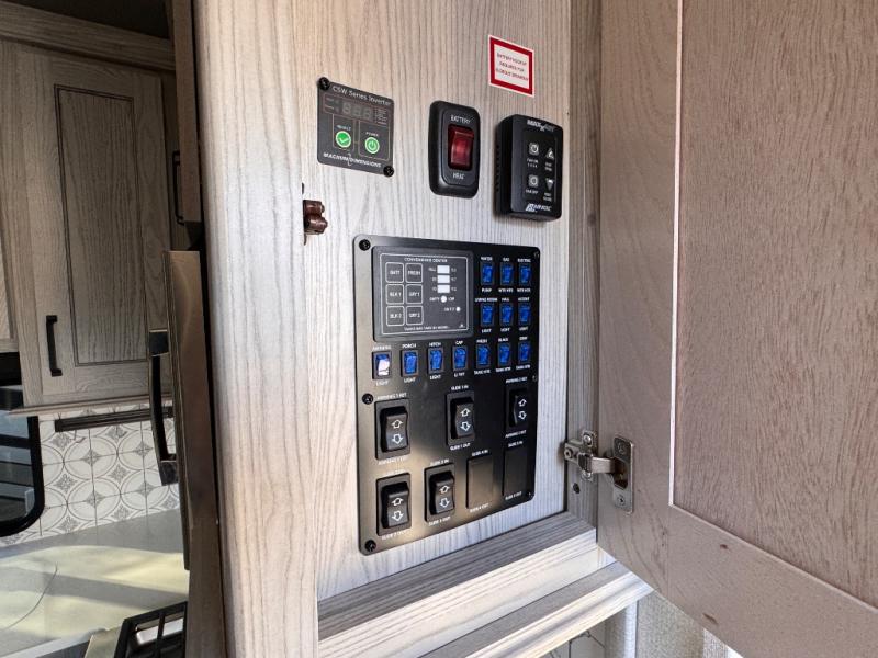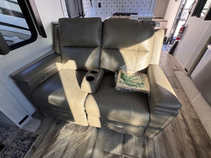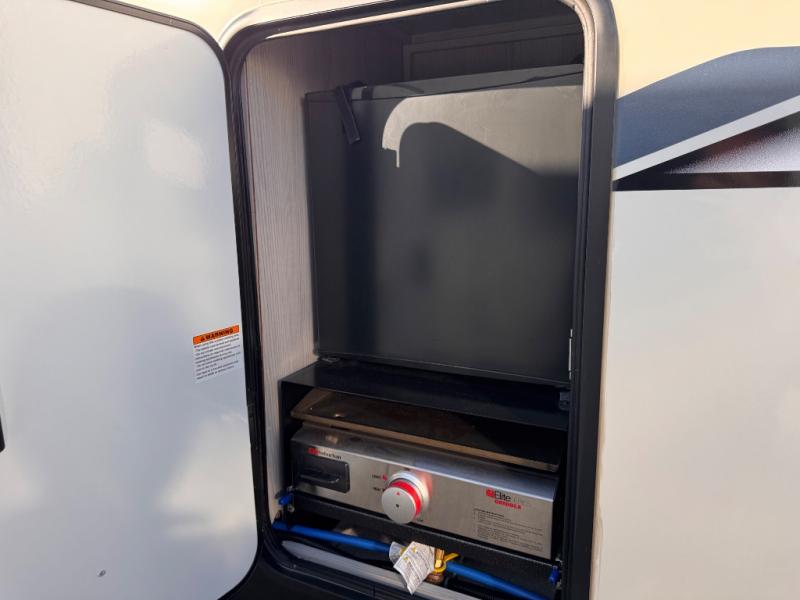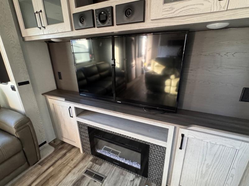 This couples coach will have you excited about traveling to all of your favorite places, and new locations too! The triple slide unit features an open concept living/dining area with dual opposing slides at the very back featuring a hide-a-bed sofa along the curbside, and an eating space opposite with a booth dinette or choose the optional free-standing table and chairs. Power theater seats will be a comfortable place to kick back for a movie, and you will love the all-new entertainment center design featuring a fireplace, Smart TV, and back-lit overhead cabinets. In the evening, head up to your private retreat with a spacious bath including dual entry doors from the hall at the top of the stairs or from within the private bedroom. Get cleaned up in the large radius shower with seat and snuggle up in a king bed slide. The bedroom slide also features a large wardrobe that has been prepped for a washer/dryer if you choose to add the convenience. You will find plenty more storage spaces for your clothing and belongings in the two dressers or dual wardrobes along the full front wall. Another bonus with this unit is the outdoor kitchen which gives you a choice to cook inside or out!
