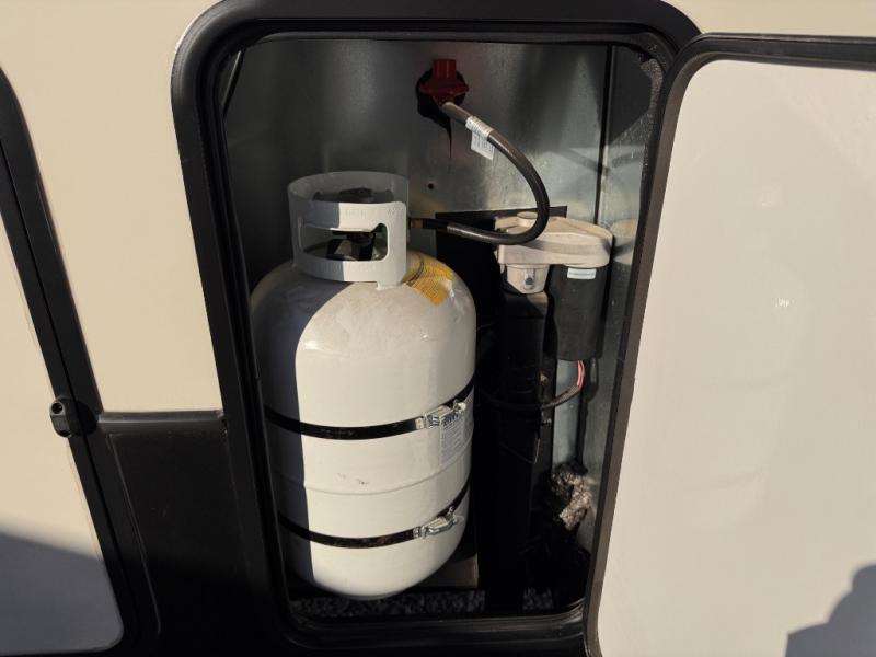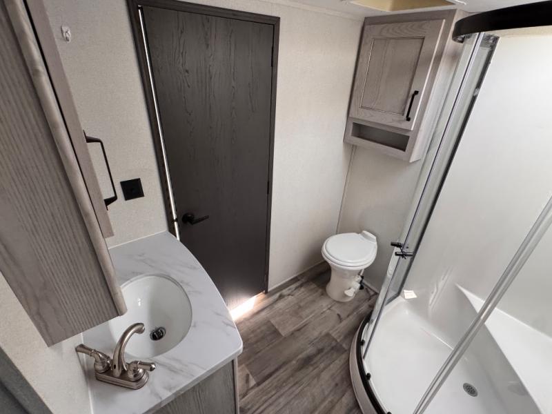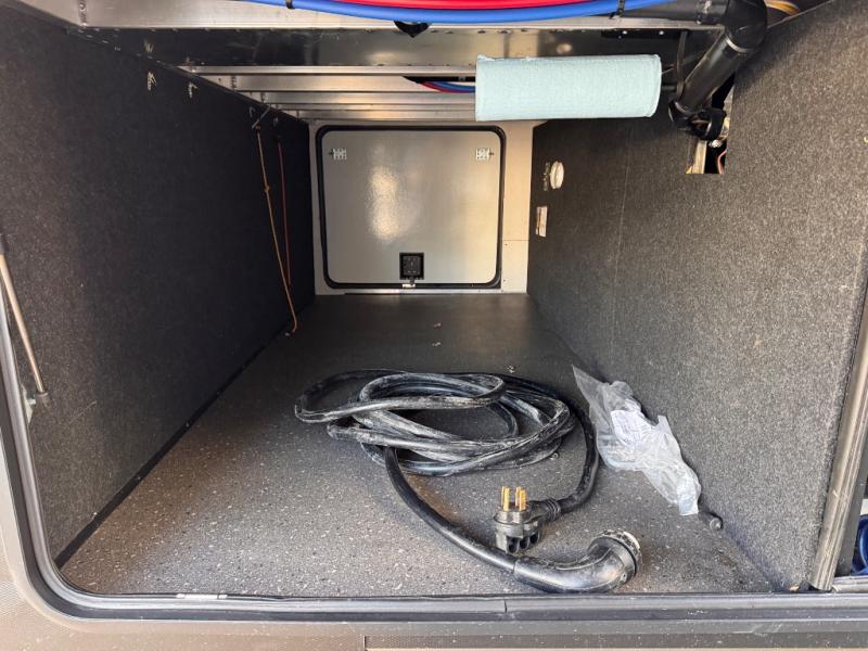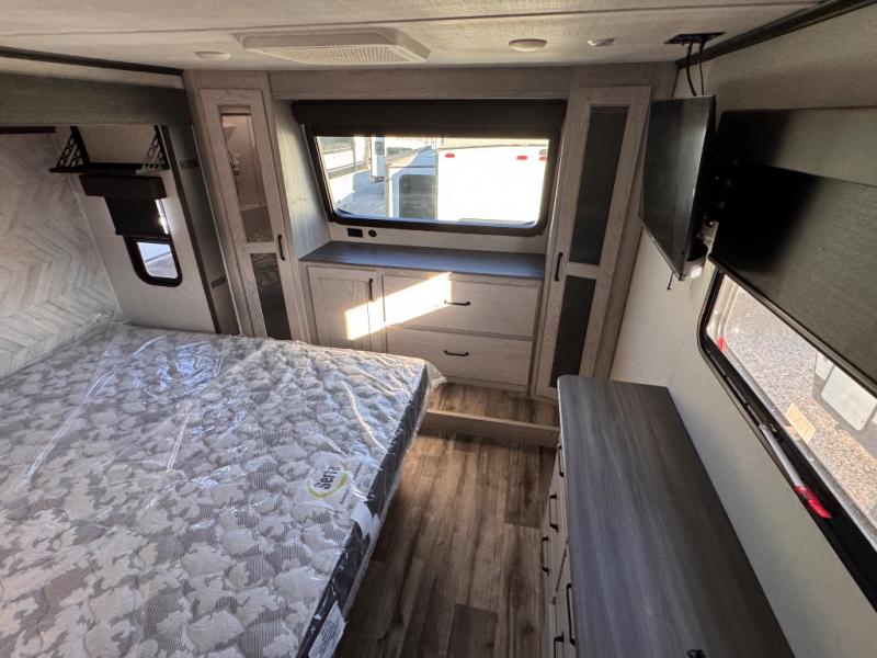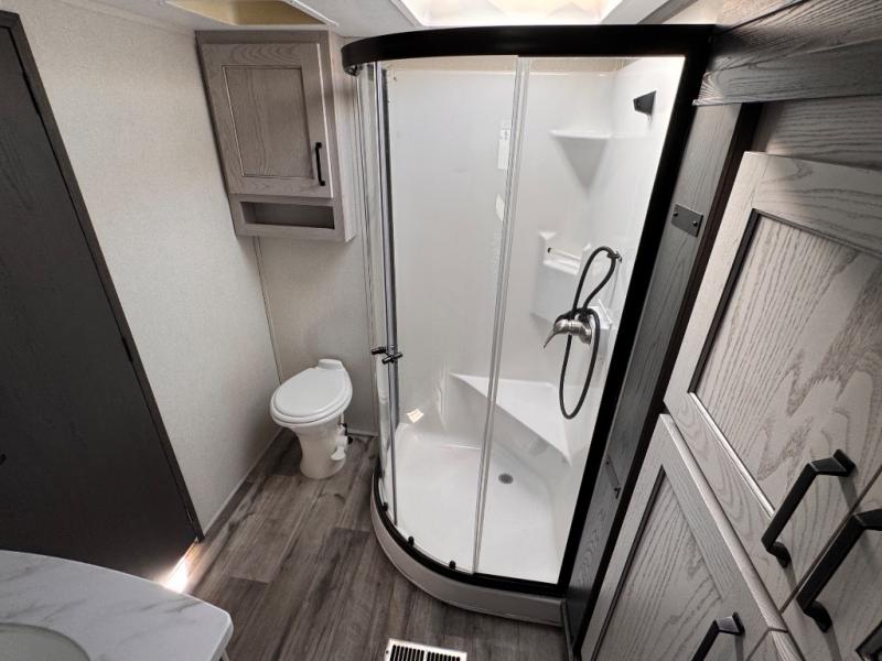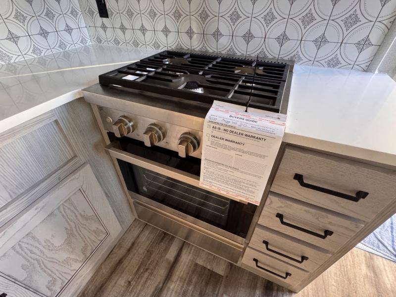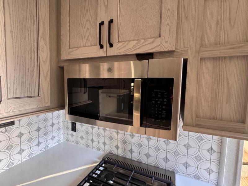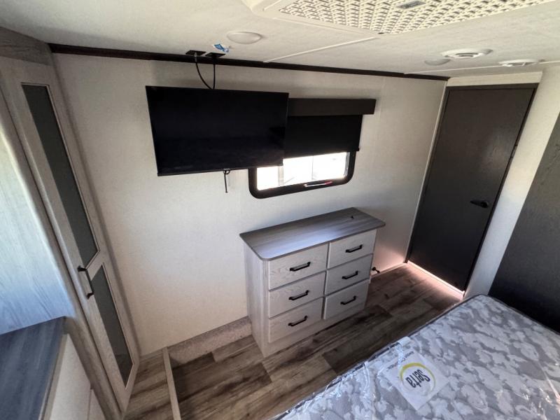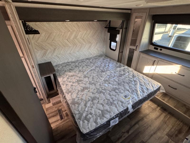 This couples coach will have you excited about traveling to all of your favorite places, and new locations too! The triple slide unit features an open concept living/dining area with dual opposing slides at the very back featuring a hide-a-bed sofa along the curbside, and an eating space opposite with a booth dinette or choose the optional free-standing table and chairs. Power theater seats will be a comfortable place to kick back for a movie, and you will love the all-new entertainment center design featuring a fireplace, Smart TV, and back-lit overhead cabinets. In the evening, head up to your private retreat with a spacious bath including dual entry doors from the hall at the top of the stairs or from within the private bedroom. Get cleaned up in the large radius shower with seat and snuggle up in a king bed slide. The bedroom slide also features a large wardrobe that has been prepped for a washer/dryer if you choose to add the convenience. You will find plenty more storage spaces for your clothing and belongings in the two dressers or dual wardrobes along the full front wall. Another bonus with this unit is the outdoor kitchen which gives you a choice to cook inside or out!