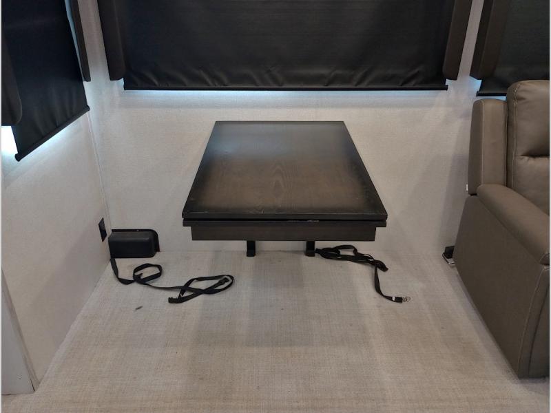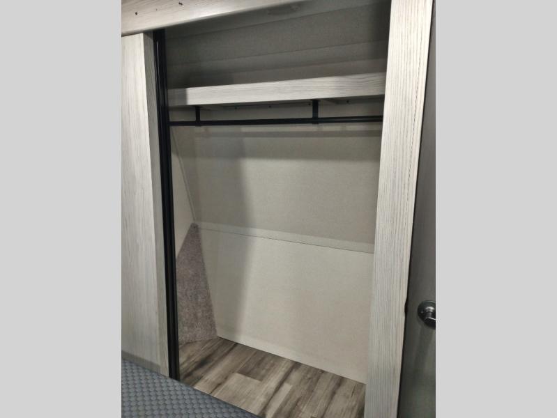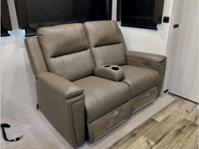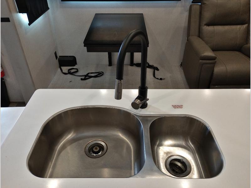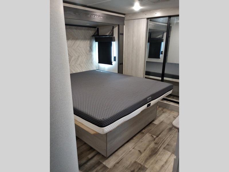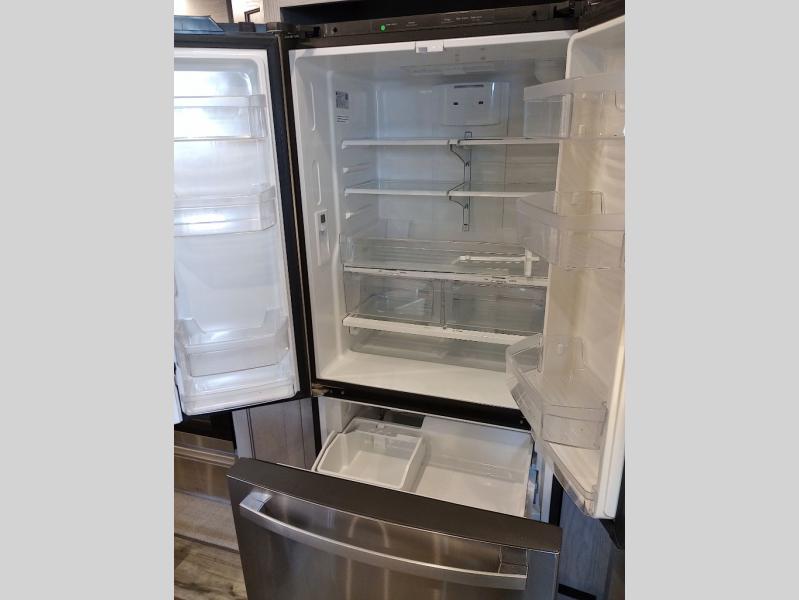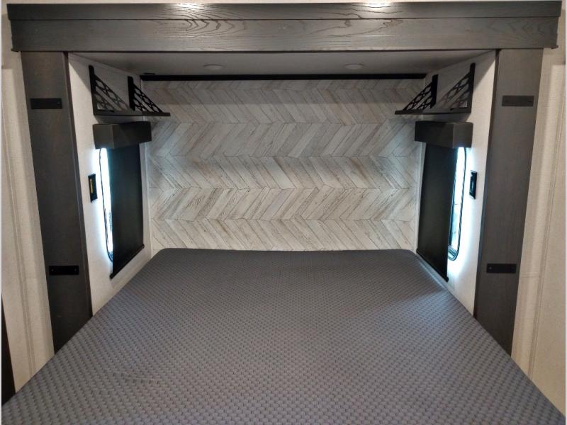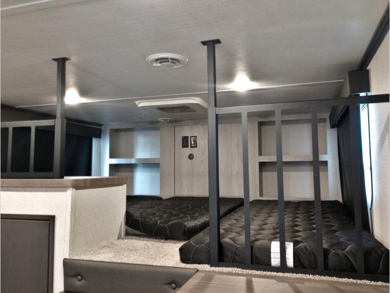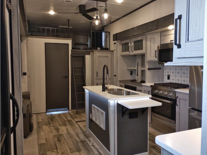 Two full bathrooms and two private bedrooms make this fifth wheel perfect for camping with friends and family. The front bedroom includes a king bed with a queen bed option, a large front wardrobe, plus stackable washer and dryer prep. The rear master bedroom has two closets plus a dresser and underbed storage, plus its own full bath with an exterior entry door for convenience. There is even a loft above the rear bedroom for even more sleeping space! Everyone can meet in the main living area/kitchen to relax on the power theater seat as the chef cooks dinner. The kitchen island will provide more counter space, along with the hutch that includes overhead cabinets as well. Don't let this luxury fifth wheel slip away!