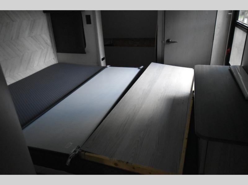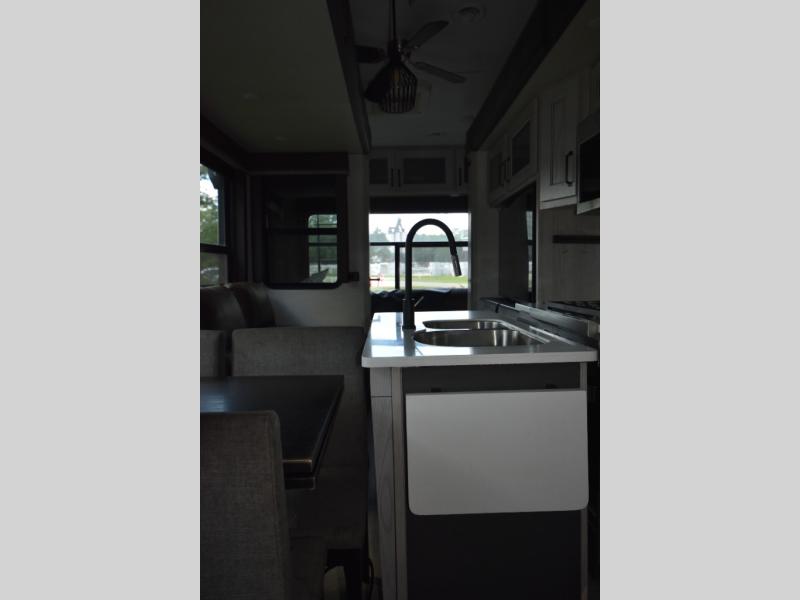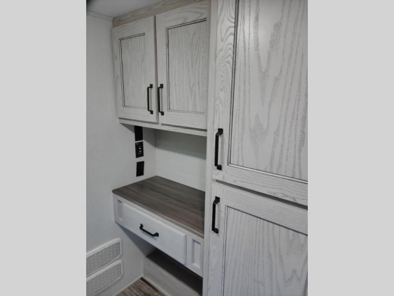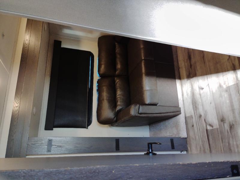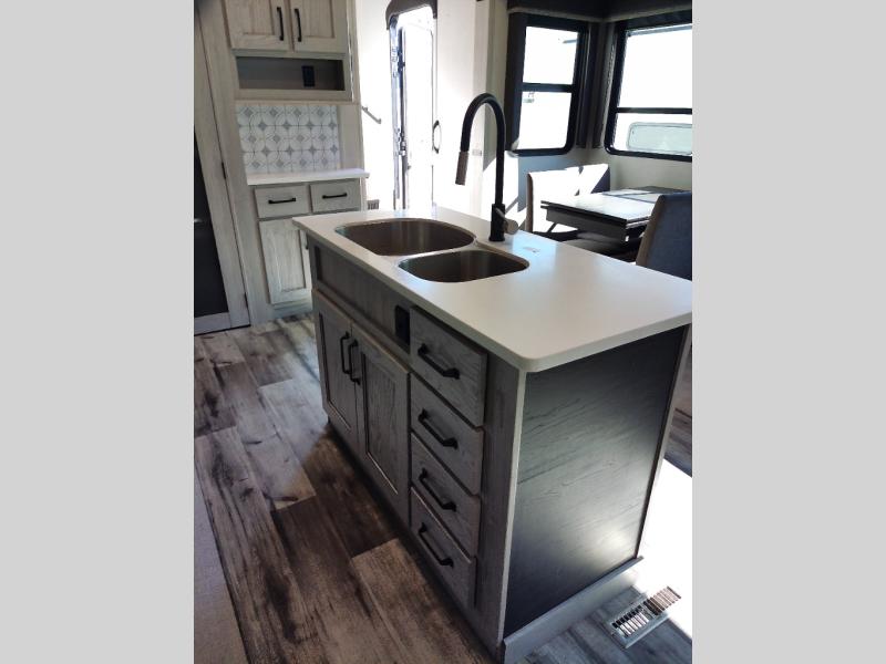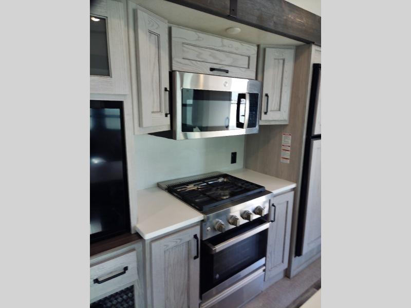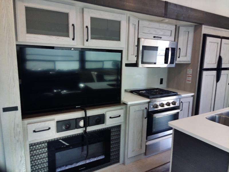 Just one look at this Montana High Country fifth wheel will impress you! There is an extra middle room that can be used for many different purposes, like an office, a guest bedroom, a craft room, or a hangout room. The hide-a-bed sofa sits on a slide for more space in this room, and there is a desk that can be used to get some work done. Above this room is a loft, so you have even more sleeping space. You also have a hide-a-bed sofa in the living area, and the king-size bed in the front private bedroom has storage underneath. The power theater seating sits across from the fireplace and 50" LCD TV for nighttime entertainment, and the kitchen island has a countertop extension for more prep space.