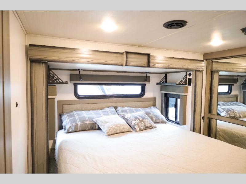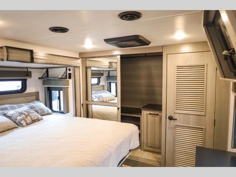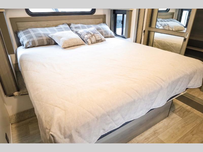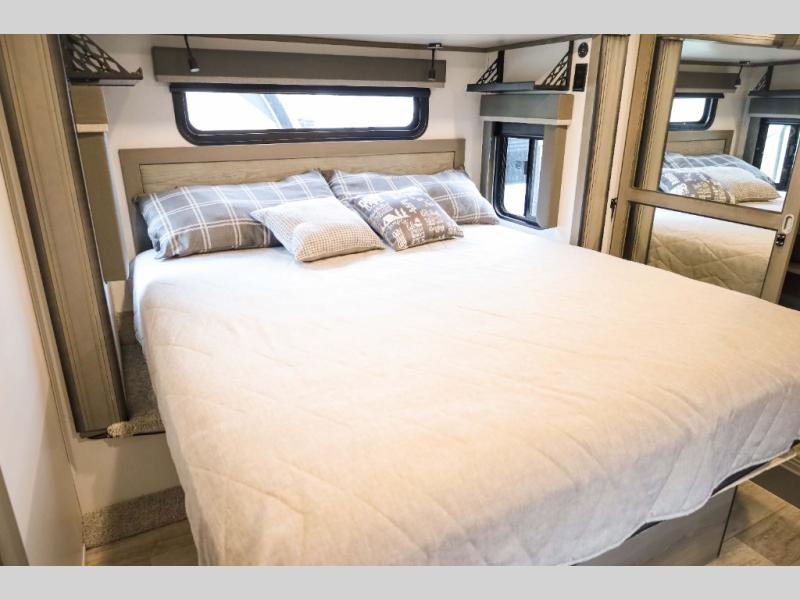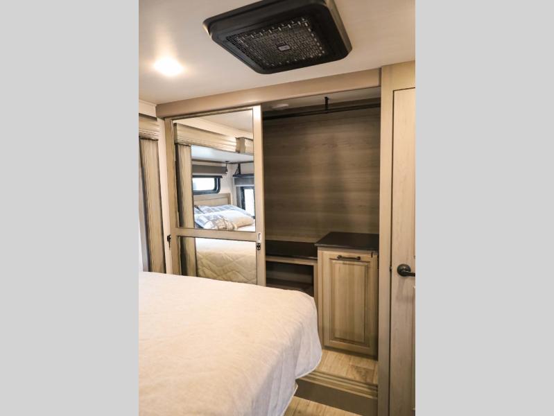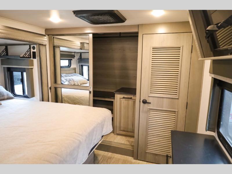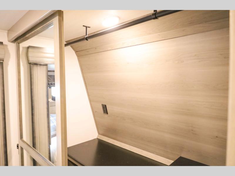 Master Suite Retreat: Sleep soundly on a King-size bed slide-out. The front master closet is enormous, offering stackable washer/dryer prep and ample shelving for extended stays.