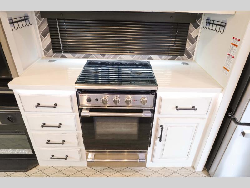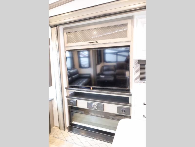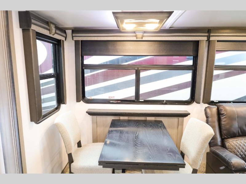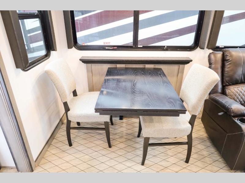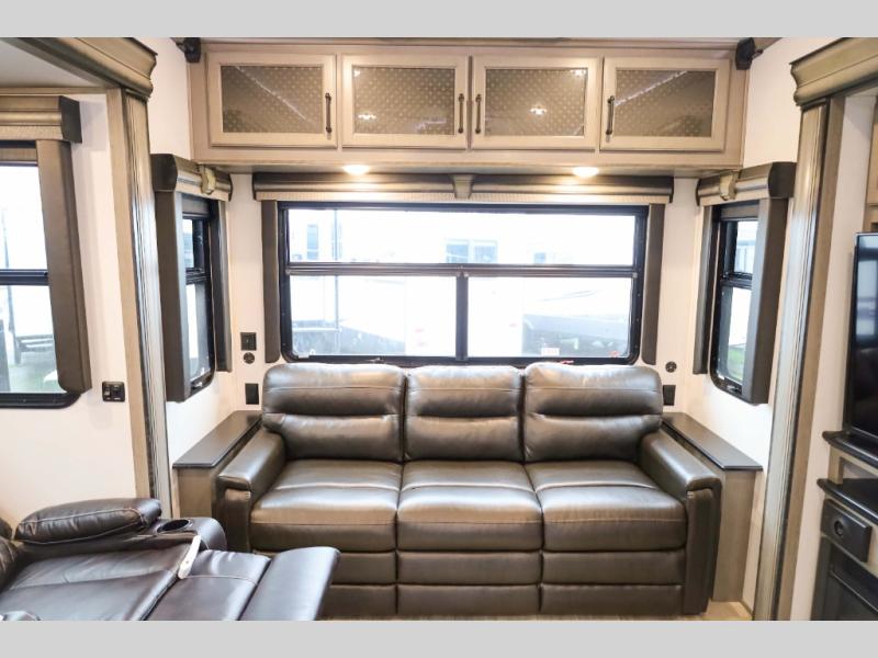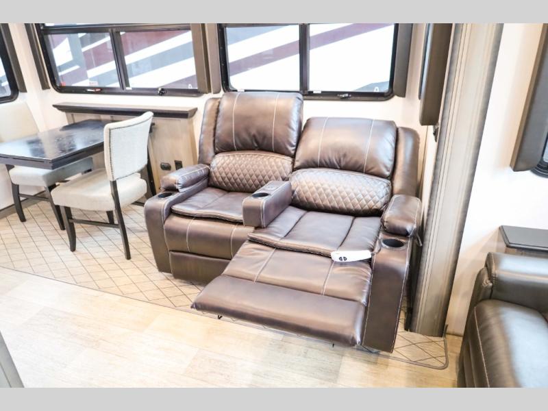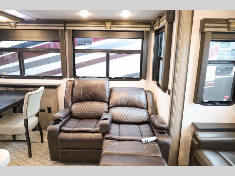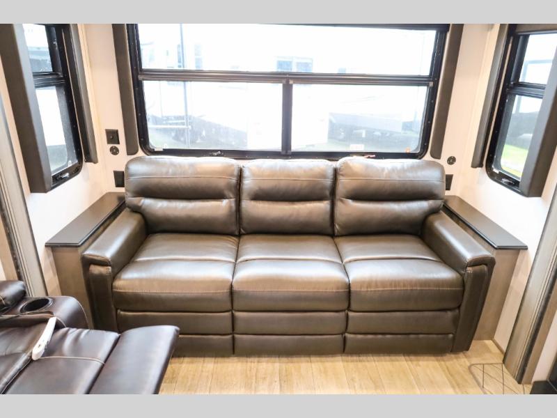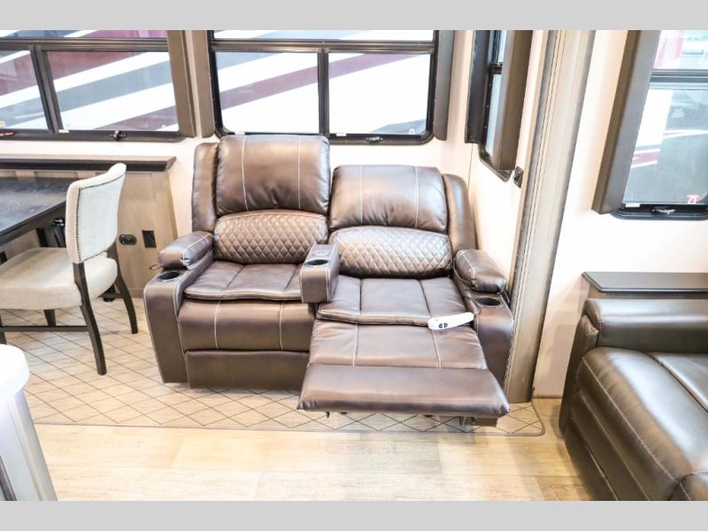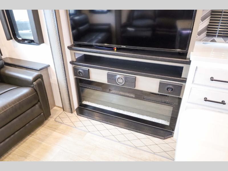 Spacious Rear Living Area: Relax in style with power-theater seating, a hide-a-bed sofa, and a cozy electric fireplace that doubles as a 5,100 BTU heater.