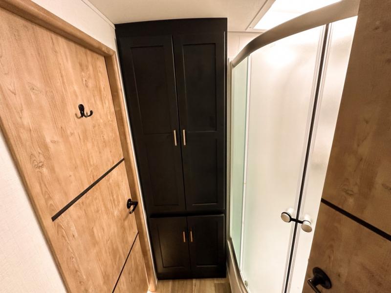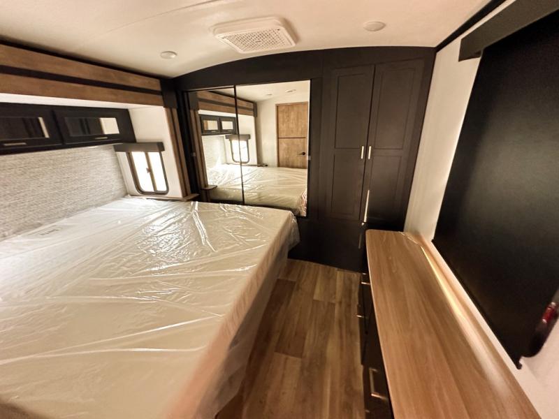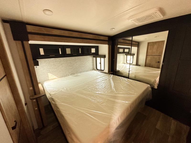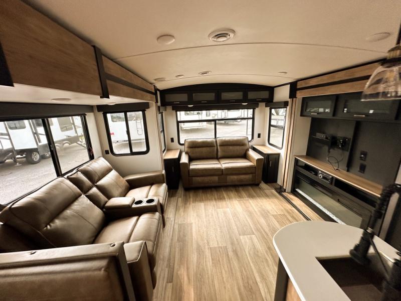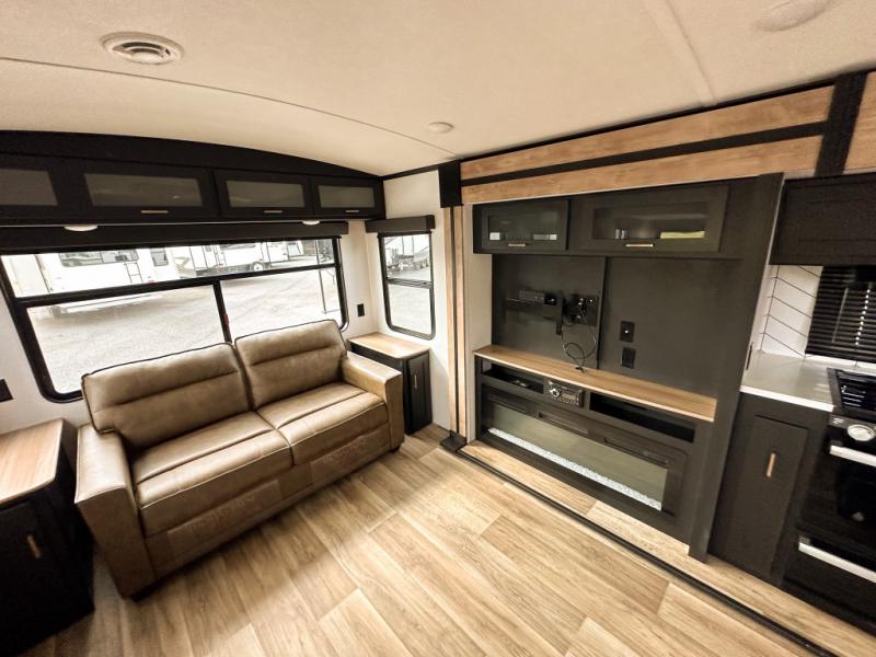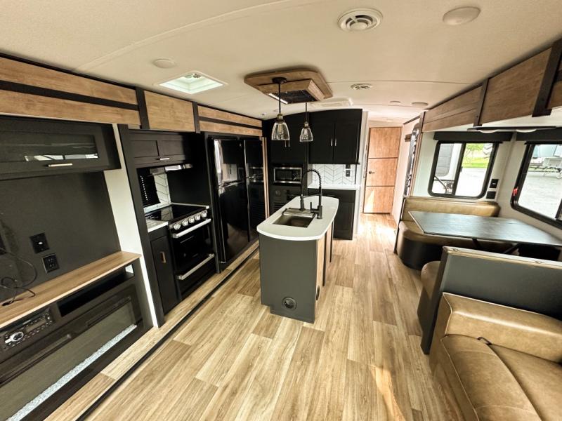 Whether you camp for inside comforts or outside adventures, this trailer will provide the comfort once you step inside. The rear living area has a sofa sleeper for guests, three slides throughout for maximum floor space, and two 10 cu. ft. refrigerators or choose the 8 cu. ft. option, so you can stock up on food, drinks and such for the longer stays. The kitchen island offers a skylight for natural lighting, and full amenities including extra counter space for serving meals. There is a 50" HDTV and fireplace to enjoy, theater seats, and a booth dinette or choose a table and chairs option in its place. The full bathroom allows entrance through the hallway or the front bedroom, and the bedroom offers a king bed, front wardrobe, a washer/dryer prepped space, and more storage.