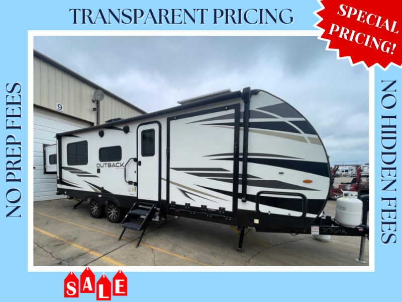 With any Outback Ultra Lite travel trailer or toy hauler by Keystone, you begin with a BAL Norco huck bolted "Z" channel frame, and there is a pinch rolled laminated gel-coated fiberglass exterior, a leaf spring suspension system, large panoramic black framed tinted safety glass windows, plus a power tongue jack and LCI power stabilizing jacks for easy setup. The interior offers pre-drilled and screwed hand-glazed modern cabinetry, extra tall slide height for maximum space, in-floor heating ducts, a Dream dinette with max-store for more storage space, and an On Demand hot water heater to mention a few highlights. Make your lightweight towing decision today, choose a comfortable and stylish Outback Ultra Lite today!