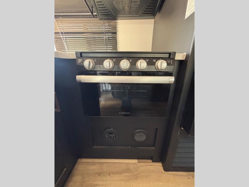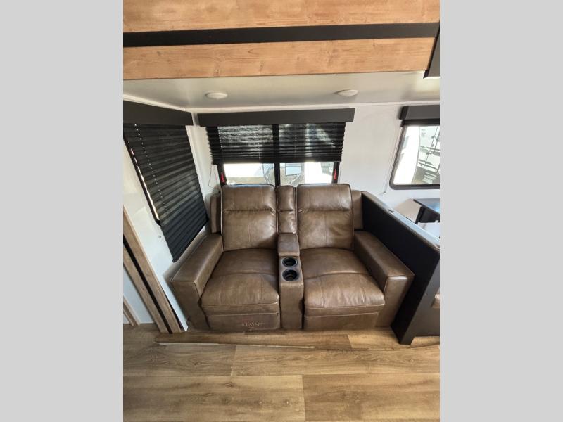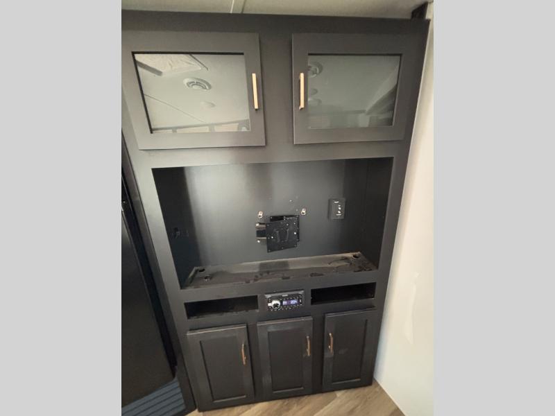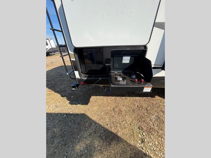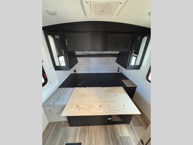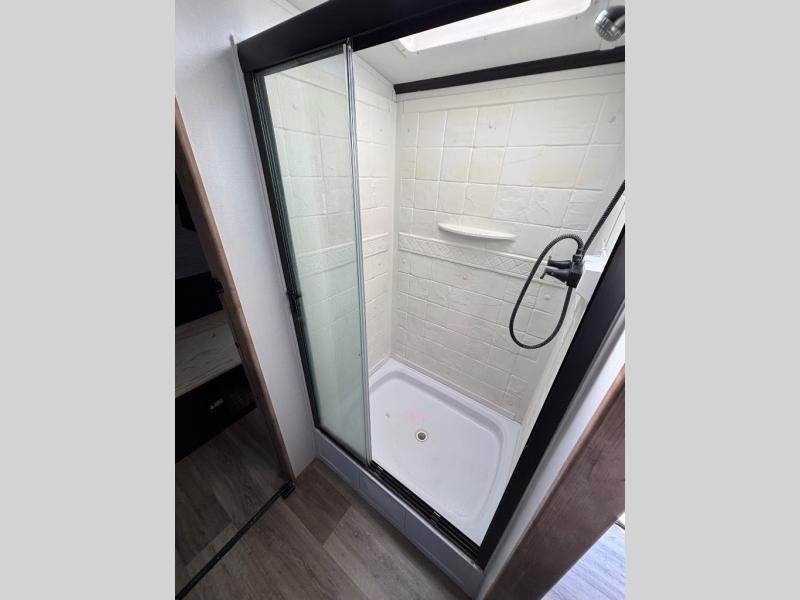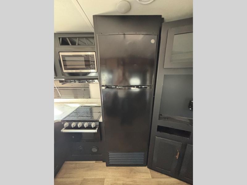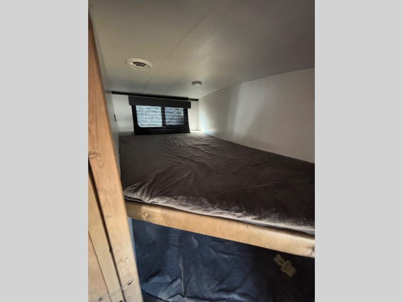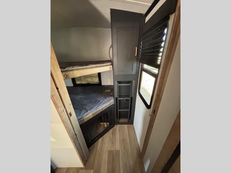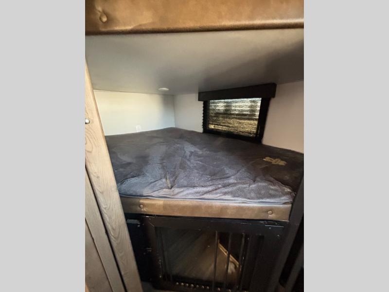 Get out and explore, hike, and camp in comfort! This trailer offers a private bunkhouse with double-size bunks and a wardrobe, a private front bedroom with a walk-around queen bed with a built-in pet kennel for your family's best friend, a laundry chute to keep everything tidy, and dual wardrobes for your clothing. You can access the walk-through bathroom from the bedroom and the main living and kitchen area through barn slider doors. Your guests can sleep on the sofa sleeper and booth dinette slide out while watching the 40" TV with entertainment center after grabbing some snacks from the hidden pantry. There are full kitchen amenities inside, plus there is an outside kitchen to use, a 21' awning offers protection from the elements, and a pass-through storage to carry your larger gear like fishing poles, an outdoor table, and camping chairs.