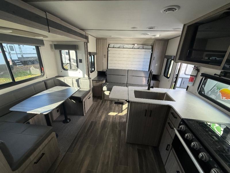 This Passport SL travel trailer is your ticket to paradise! It has a functional living space since both the U-shaped dinette and Murphy bed can reposition whenever needed, and when you put away the Murphy bed, you'll find that there is a sofa in its place. You could even switch out the dinette for an optional theater dinette. Just outside the rear bathroom is a large wardrobe so that you can keep your toiletries stored close to the bathroom. Not only does this trailer have a full indoor kitchen, but it also offers you an outdoor kitchen with a pull-out cooktop so that you can enjoy some sunshine while you cook.
