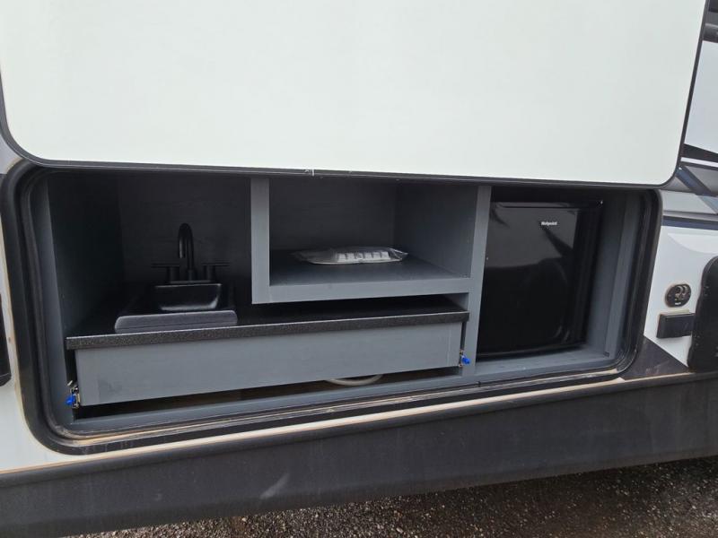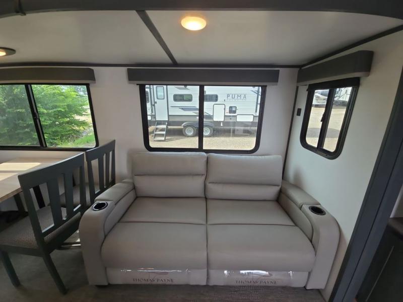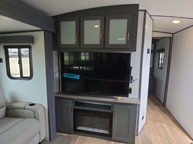Camp in luxury with this travel trailer! The rear kitchen has plenty of countertop space for you to prepare your meals, a three burner Furrion gas range to fry up some bacon, and a 10 cu. ft. refrigerator to keep your perishables fresh. There is even an outside kitchen with a two burner cooktop, a mini refrigerator, a sink, and an overhead cabinet all protected by the 21' electric awning. Enjoy your meals at the dream dinette and relax in either one of the two recliners or on the 68" tri-fold sofa while your stomach settles. The entertainment center has an electric fireplace and a LCD TV for you to watch your favorite movies. When you're ready to wind down your night, take a relaxing shower in the 36" shower and then lay down on the queen bed in the front private bedroom!