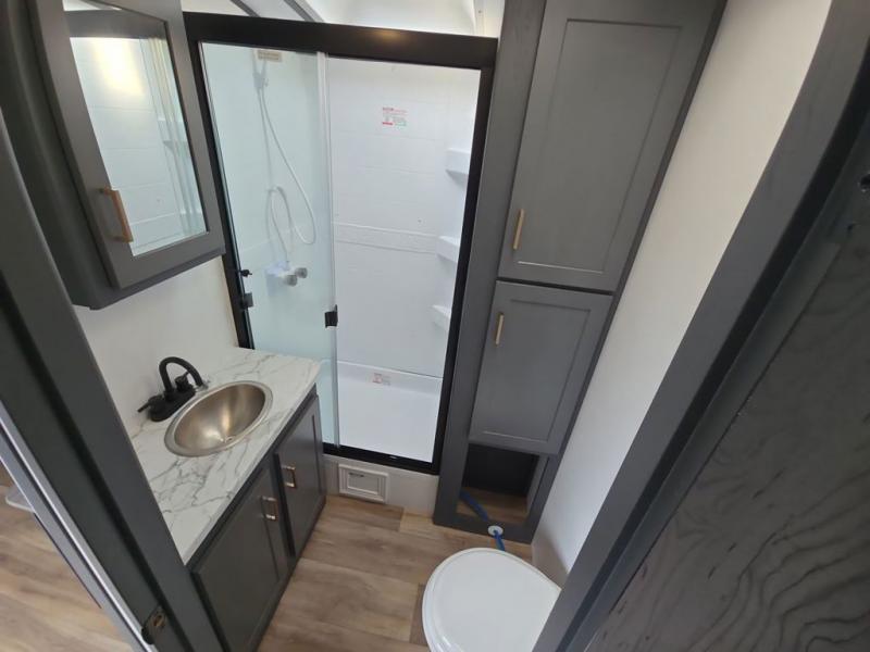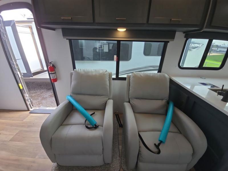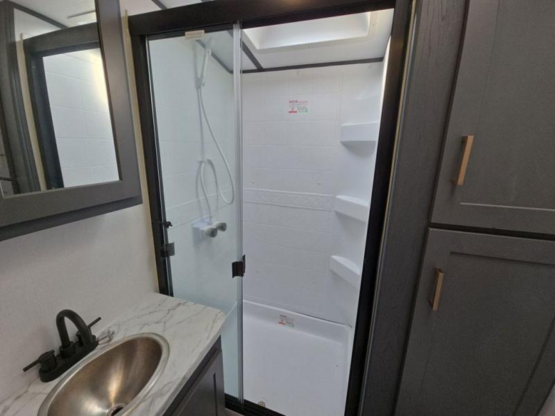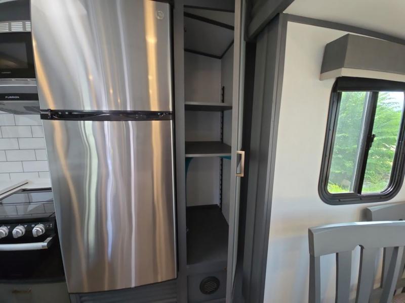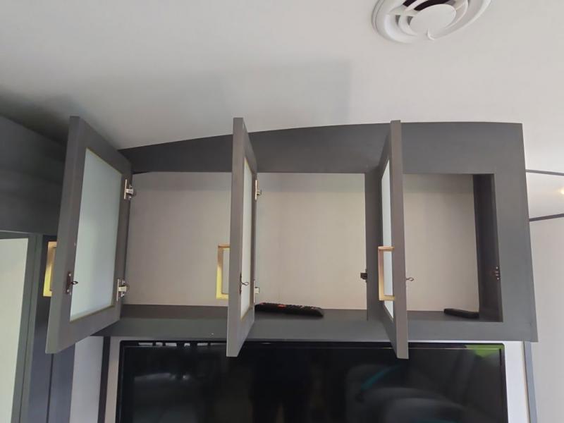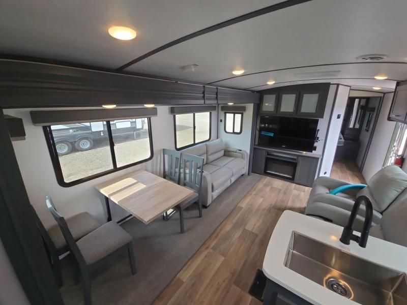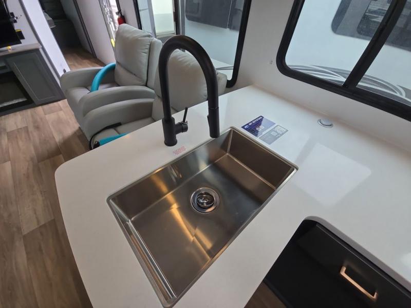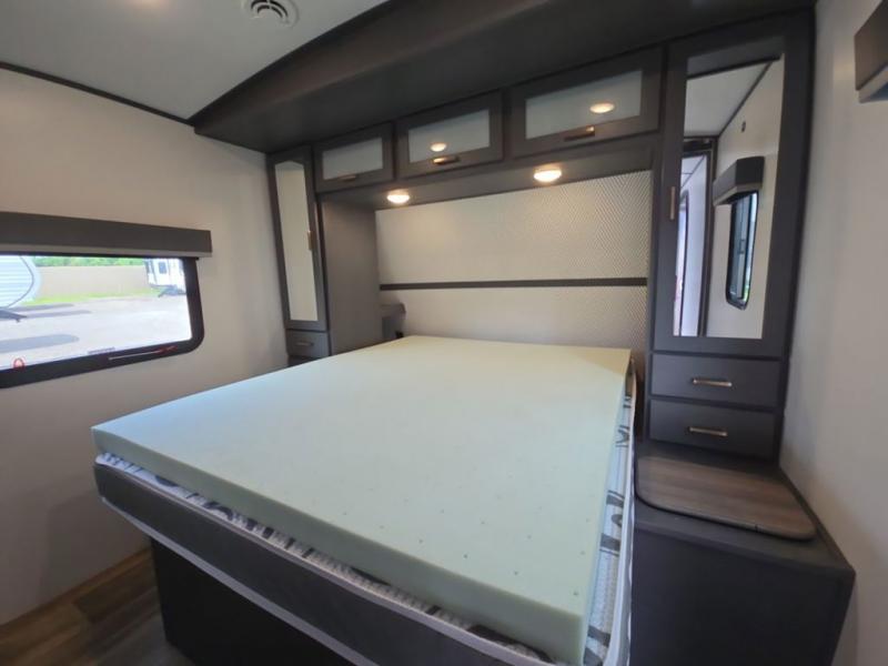 What I liked most: Very spacious. Love the large indoor counter space in the kitchen and the double sink w/ retractable faucet head. Tons of storage compartments literally everywhere. The pantry storage is very large and deep. Love having the 2 chairs aside from the sofa and dinette area, which can be easily taken out if you need more room. We travel with 2 labs and their crates fit perfectly and they love it too. Bathroom is quite spacious and you get a pretty decent hot shower. I love that there is a door for the bedroom for added privacy. Nice to have mirrored cabinets in the bedroom, you can see yourself from head to toe. Tows very very nice with my 11'GMC Sierra w/ the 6.2, HD towing pkg.