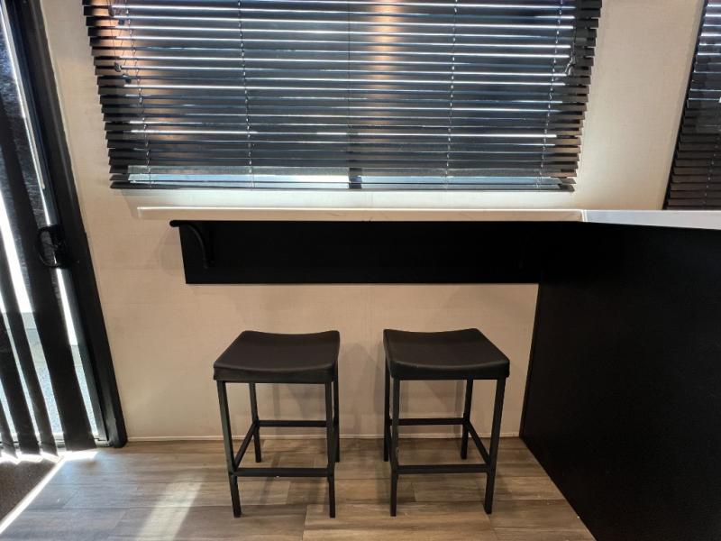 When you enjoy entertaining guests, this spacious Residence provides all the features you will need and lots of floor space thanks to the four slide outs throughout. The rear entertainment center and den offer a fireplace, dual opposing sofa sleepers that double as bedding for your guests, and theatre seating. The separate kitchen area is centrally located, and offers dinette bench seating. There is extra counter space, plus a four-door refrigerator and a pantry for food storage. in the slide and along a wall with the kitchen sink and overhead cabinets. You will find easy access to the double entry bath from the hallway and front bedroom which offers a king bed slide, and lots of storage plus the second exterior entry door.